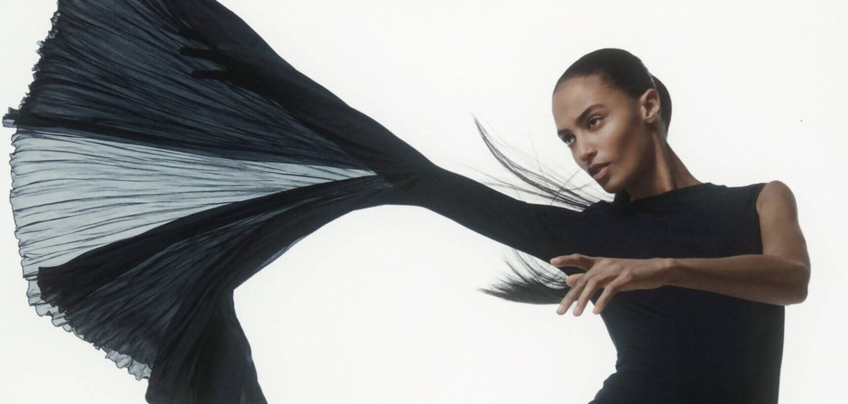 Drawing on an understated colour palette of blacks, whites and silvers, the pieces feature the lingerie-centric subtleties that have become a recognisable aspect of the CSM grad’s design lexicon. Using material and texture to emphasise the sultriness of each piece, wet-look satin and mesh pop up frequently. A reminder that the Nensi Dojaka woman loves a good night out, sequinned dresses with barely-there spaghetti straps are also on offer. Primped and primed to be donned by an off-duty model, loose-fitting, low-slung jeans and high-waisted woollen trousers are scattered throughout. An element of dynamism is effortlessly integrated, with flowing see-through gowns and pleated georgette godets appearing to cascade into flared sleeves. A mini dress inspired by the silhouette of a jacket that can be fastened and unfastened as you wish is also introduced, making the transition from day to night even more seamless.