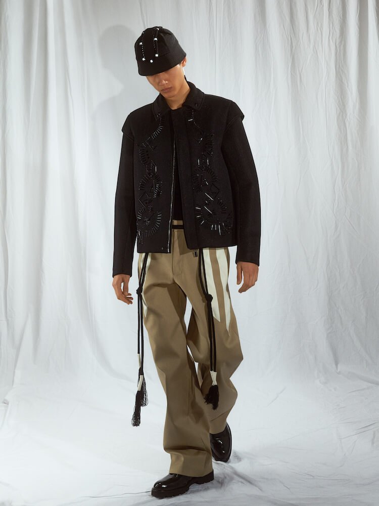 The collection allowed Talavera to translate his Filipino heritage into his work for the first time, too. Barong Tagalog shirts – usually made from pineapple fabric but here fashioned from silk – come hand-embroidered with beads in abstract florals that look to Philippines’ national Sampaguita flower and his father’s love of gardening.