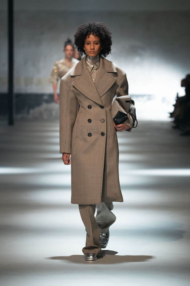 Classic corsetry techniques were extrapolated to melton cloth coats on a canvas of tweed, making the dowdy desirable with domineering shoulders and nipped-in waists. The chaos of sheer knits and trompe l’oeil dresses was reined in with ruching to suggest the silhouettes of the body beneath, breathing sex appeal into the muted tones.