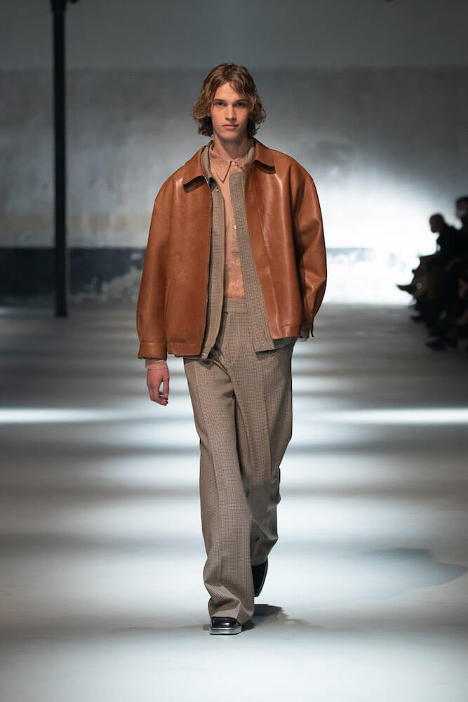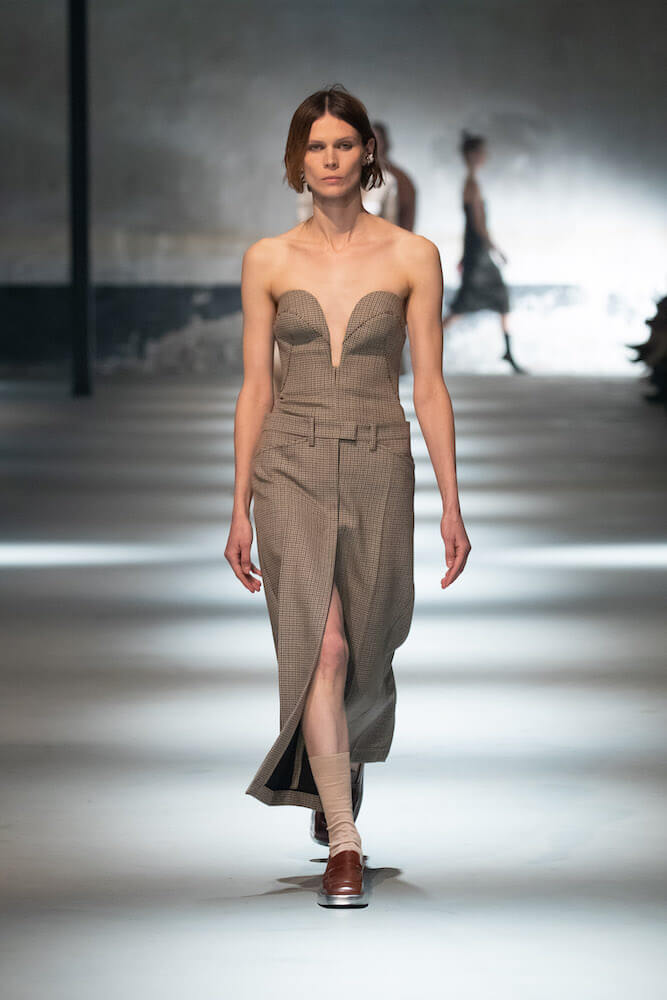 In the show notes, Dell’Acqua highlighted the importance of recovering the spontaneous character of fashion through rewriting the sartorial language surrounding clothes, creating a collective wardrobe undefined by gender. Dell’Acqua crafted chiffon dresses edged with Harris tweed, and men’s trousers slung around the hips, which came slashed at the seams to present flesh-baring skirts in sensual cuts. The No.21 customer is going out-out.