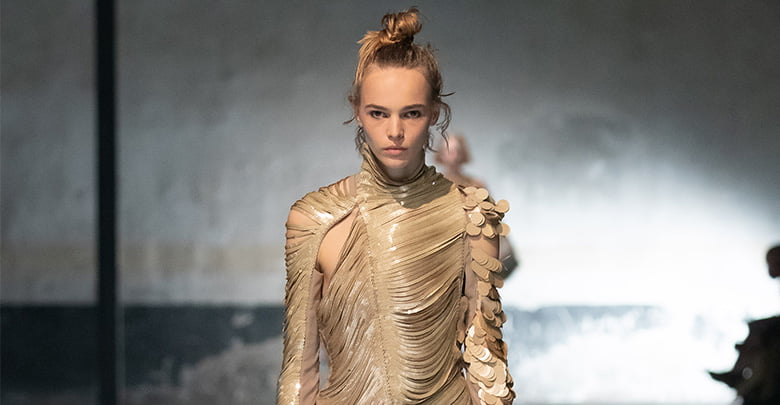 Alessandro Dell’Acqua summons dark academia through a sensual, post-apocalyptic lens in No.21’s AW22 collection. Voluptuous proportions were defined by either tapered contours or slouched fringing, coloured by a series of earthy shadows. Dell’Acqua elevates bias cuts with an extravagant eye via the use of macro-paillettes, which together with dripping crystal chains carve out serious glamour.