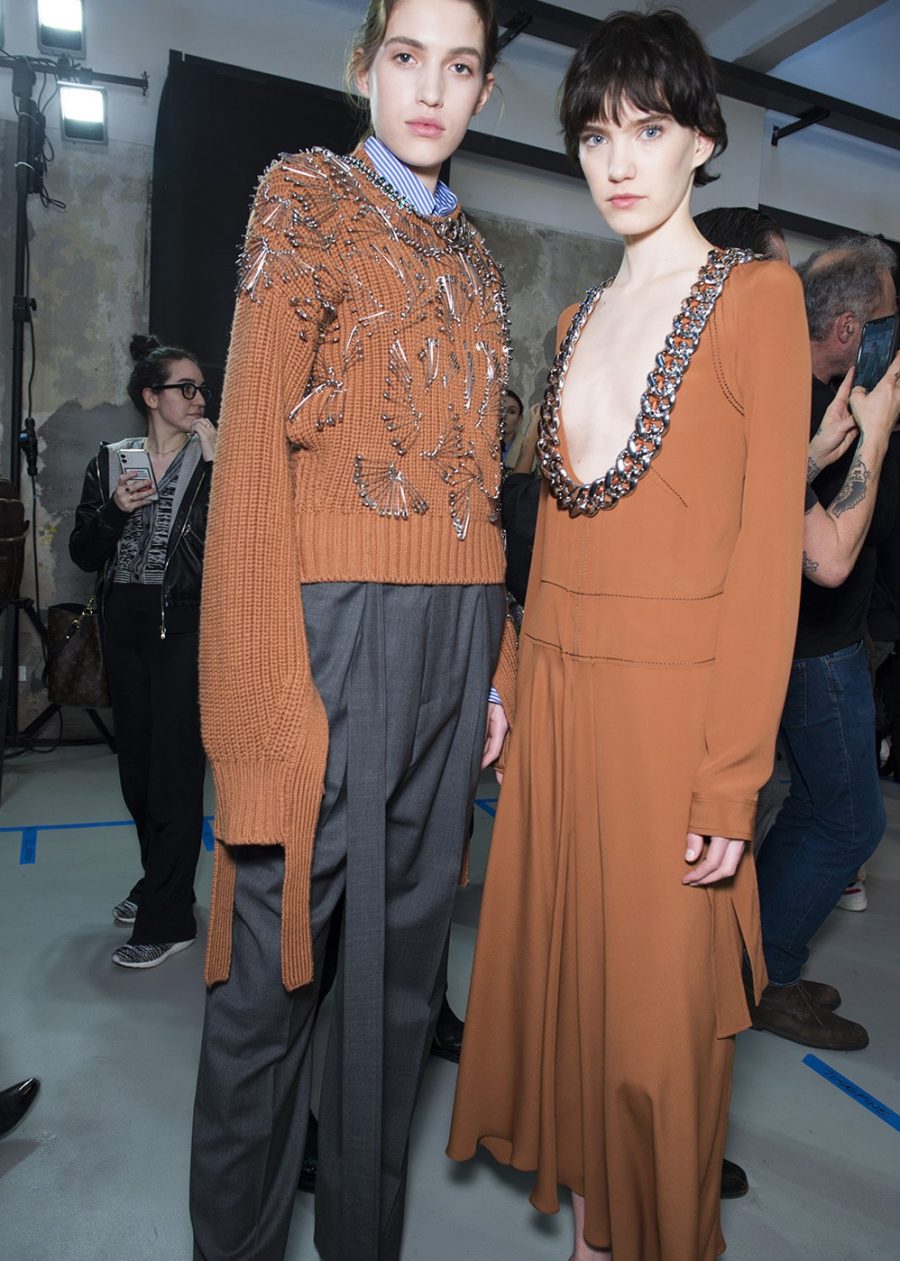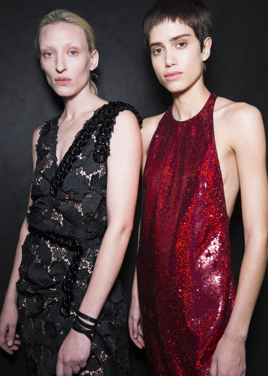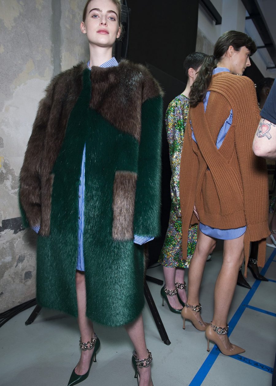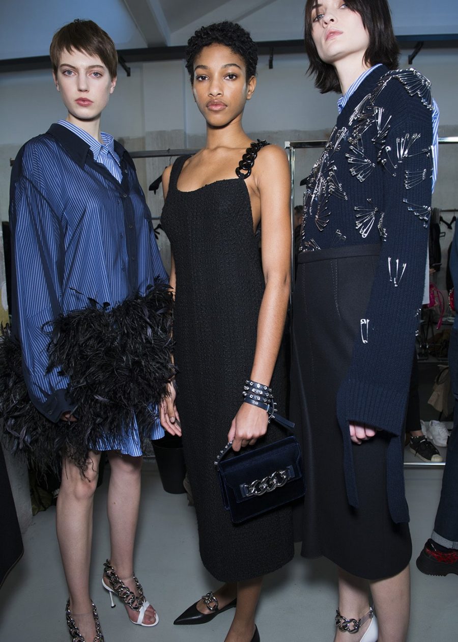 Alessandro Dell’acqua delivered a masterclass in Milanese dressing at his Numero Ventuno label. Take a shirt, but make it seductive. Not slutty, but hot, in a way that’s so sure of itself it doesn’t need to be overt. That means a man-size pinstripe shirt worn with nothing but a boyfriend knit and a classic pump. It also means a wool sheath dress that falls off the shoulder in a way that would get you talked about in parliament. Call it sass, but this collection packed a knowing punch. Finely dressed to the point of being adorned (how else do you explain a khaki feather chubby?). She’s not invisible. How could you be, in vivid green all-over sequins? The No21 woman likes her classics – she knows all about the virtues of tonal dressing (beige is her shade of choice) and embraces lace. You also won’t find a finer wool pencil skirt anywhere in Milan.