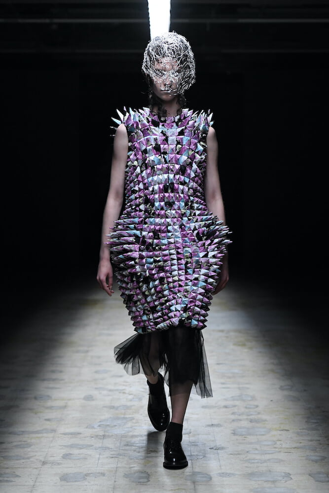 Bubblegum hues infused floral prints and juxtaposing geometric spikes, which moulded around the body between tulle. In a stark contrast, precise tailoring came undone with zips that fabricated flowing fringes and crisp peplum waists. Extraterrestrial headpieces created by Amazing JIRO encased models’ faces in wires which evoked a network of neurons that levitated around their heads. Nothing is conventional in Noir Kei Ninomiya’s world.