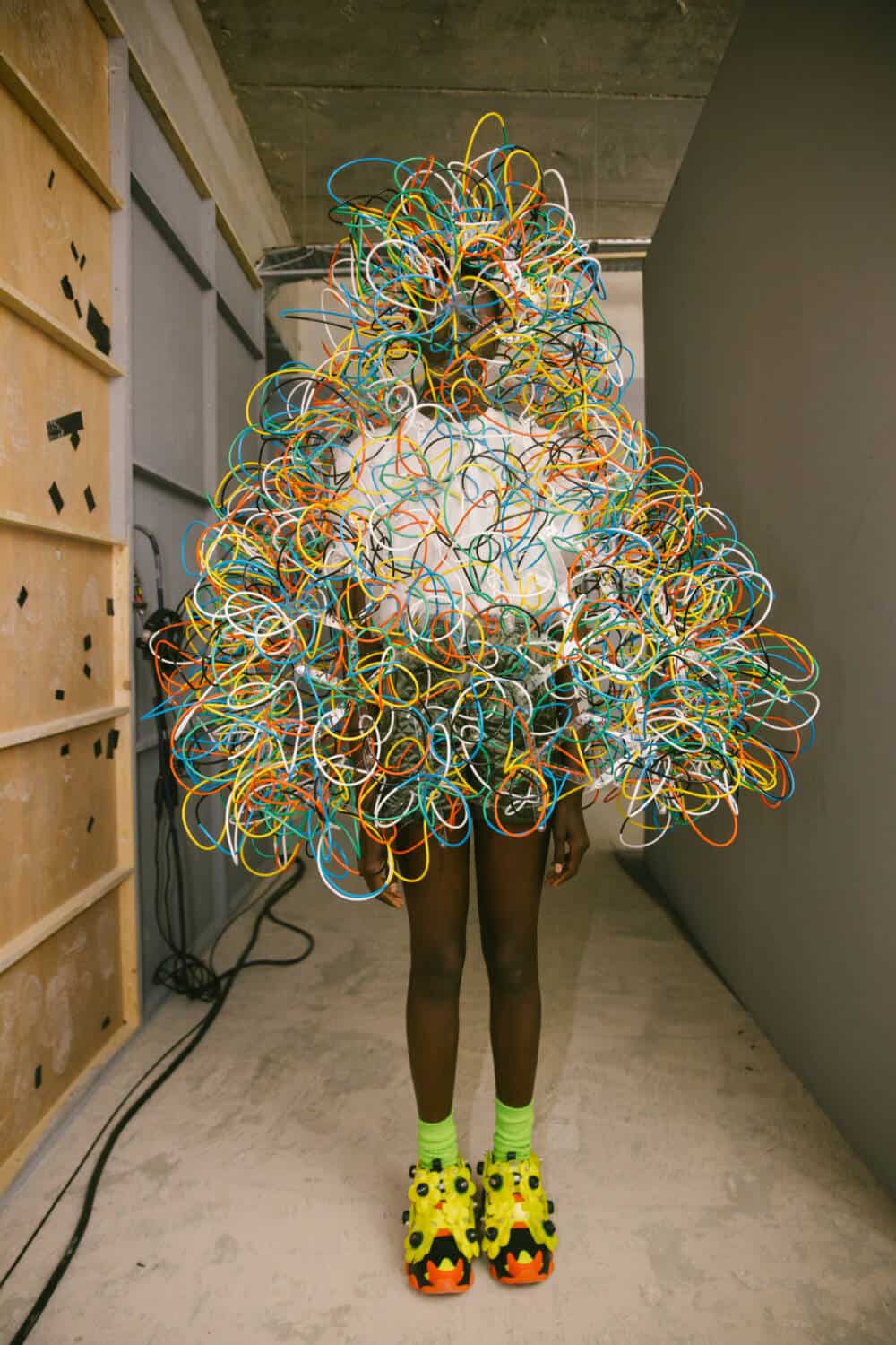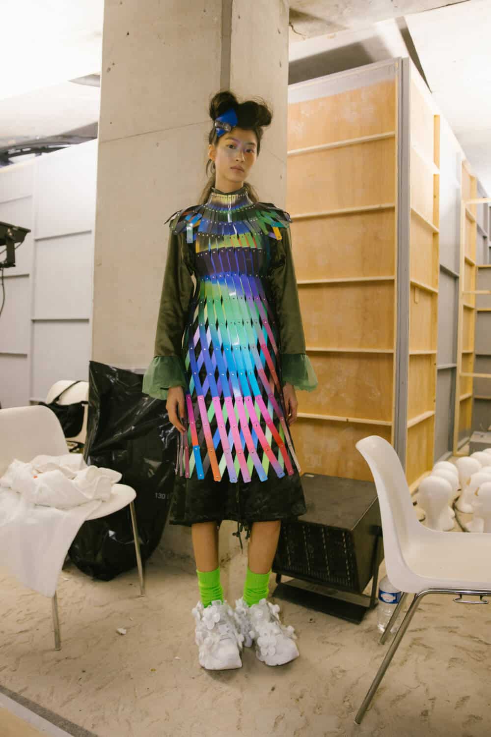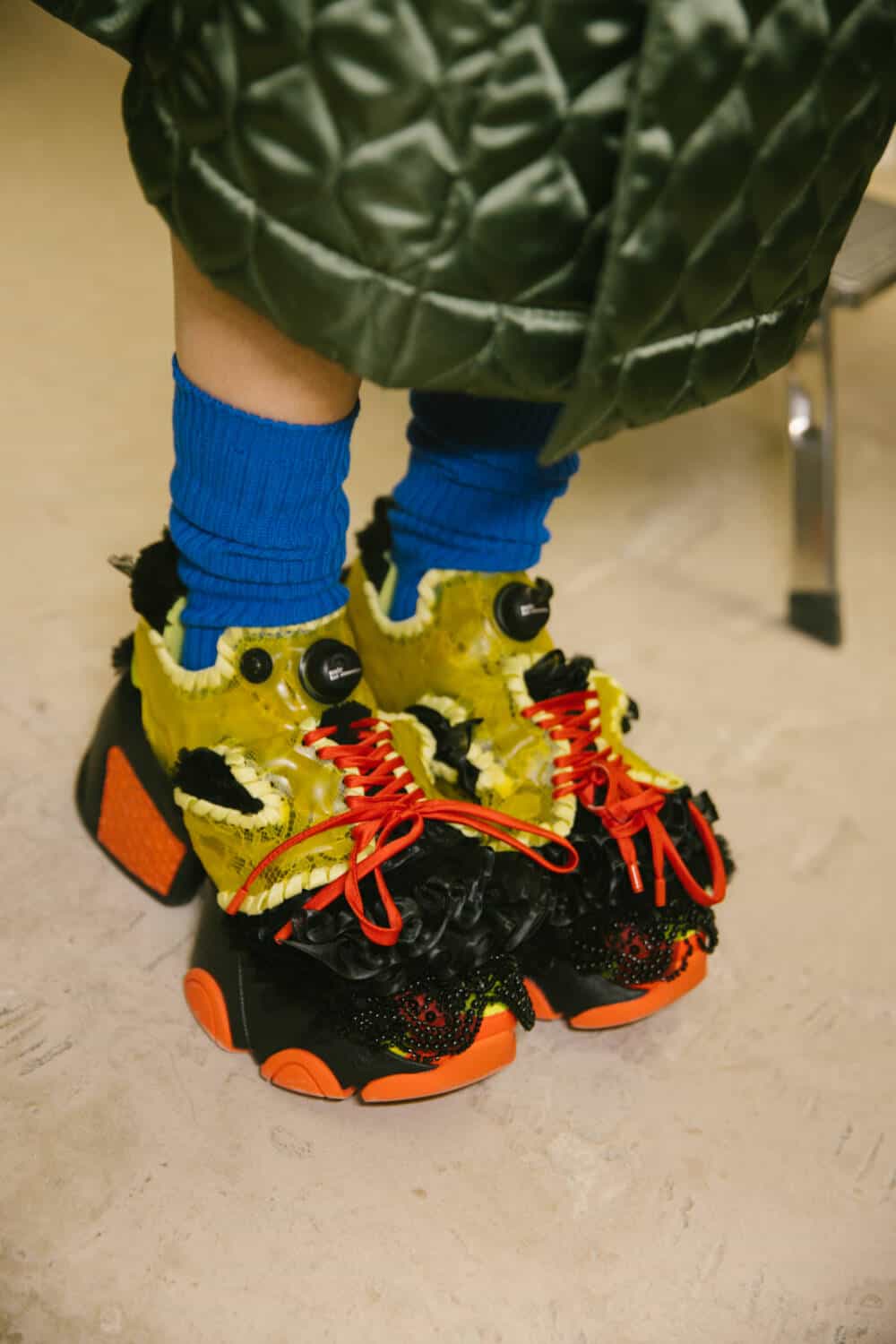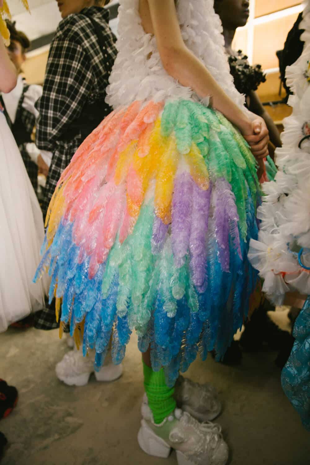 The gothic, alien-like stylings we’ve come to know and love from the Japanese designer were sidetracked for vivid, optimistic concoctions that unleashed one’s inner child. Think cocooning, orb-like dresses crafted from an explosion of primary-hued rubber bands. Or girly frocks made of tulle that was scrunched into what looked like sugar-coated ice pops in shades of raspberry pink, bubblegum blue and syrupy oranges. Ninomiya’s punk codes now came candy-wrapped. His caged dresses sprouted with black flowers before migrating into pink silk and tulle frothy goodness, while green quilted dresses and tartan waistcoats came paired with a new Reebok collab that saw Ninomiya dress up the sport giant’s Instapump Fury trainer with more florals. Things came to a glorious crescendo thanks to an iridescent cloak of shiny, multi-coloured flowers that entirely covered the model’s frame. It left guests beaming from ear to ear.