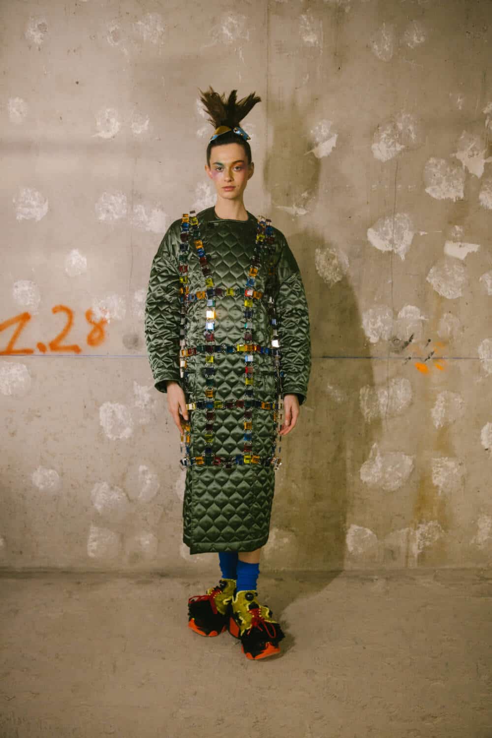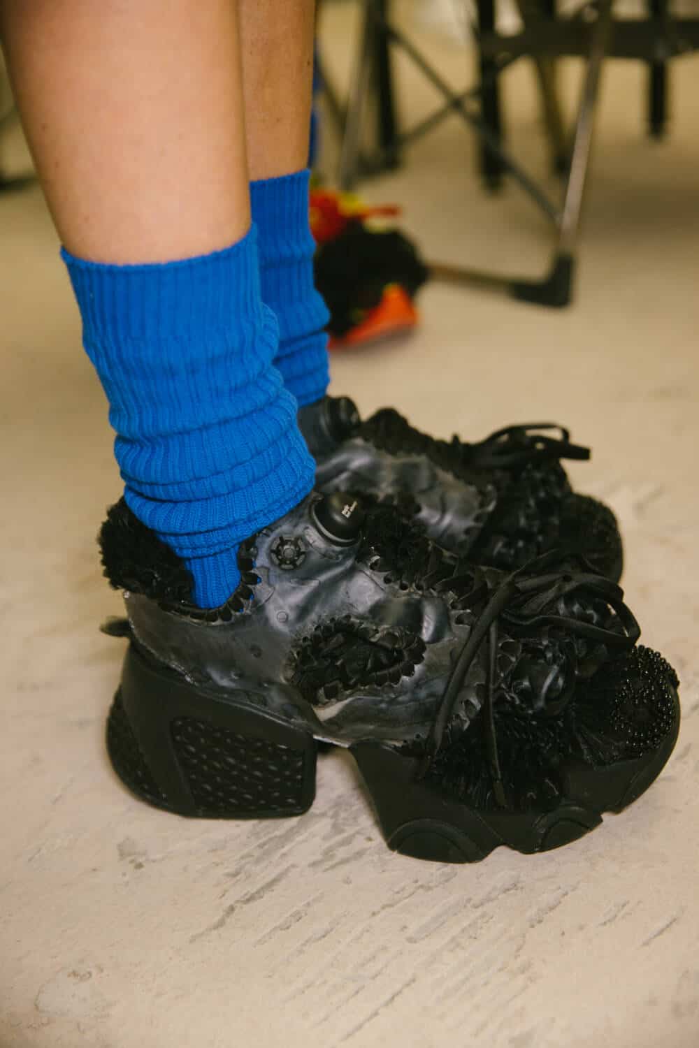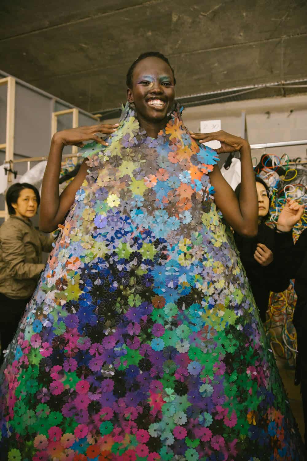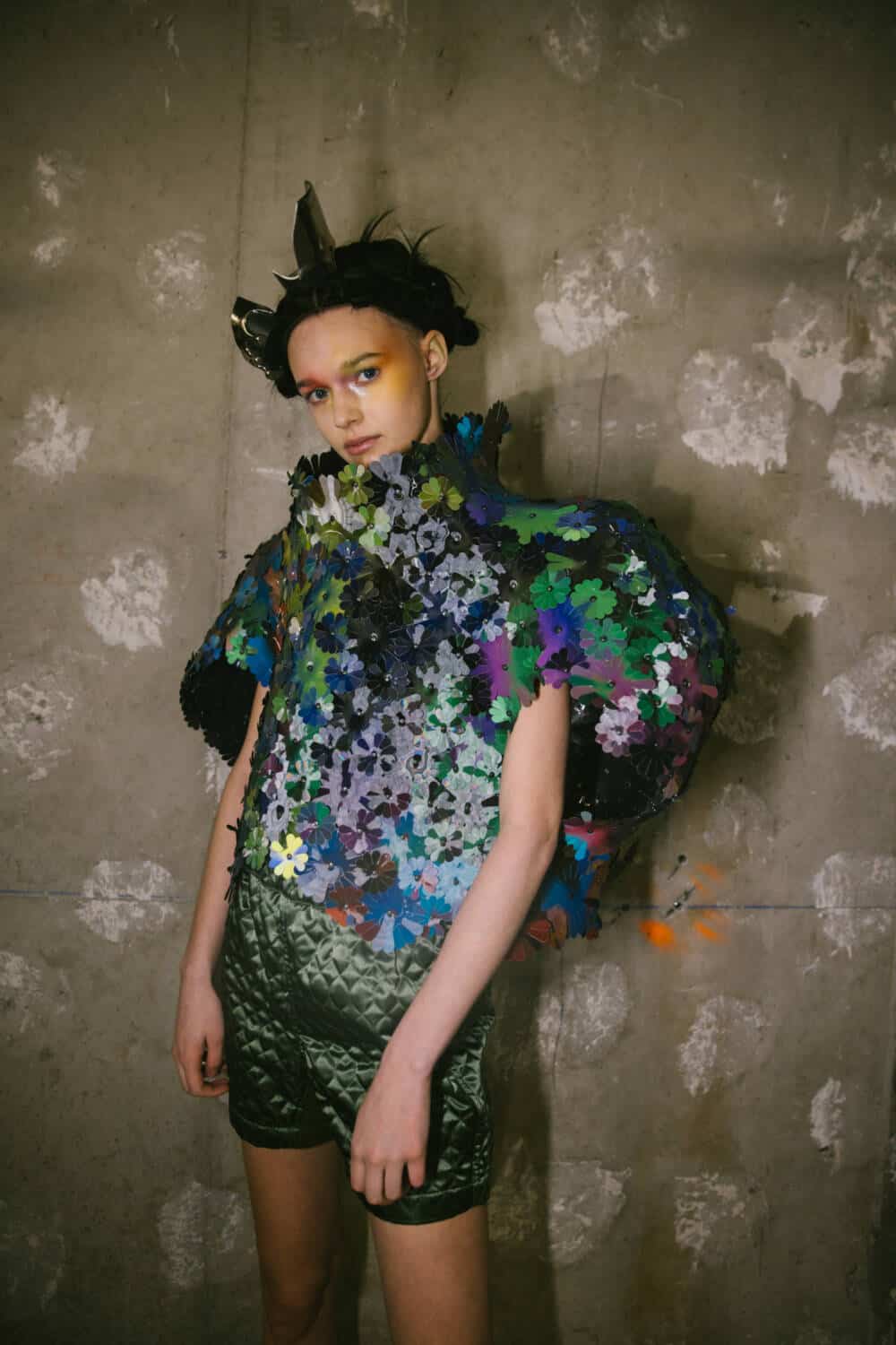 The gothic, alien-like stylings we’ve come to know and love from the Japanese designer were sidetracked for vivid, optimistic concoctions that unleashed one’s inner child. Think cocooning, orb-like dresses crafted from an explosion of primary-hued rubber bands. Or girly frocks made of tulle that was scrunched into what looked like sugar-coated ice pops in shades of raspberry pink, bubblegum blue and syrupy oranges. Ninomiya’s punk codes now came candy-wrapped. His caged dresses sprouted with black flowers before migrating into pink silk and tulle frothy goodness, while green quilted dresses and tartan waistcoats came paired with a new Reebok collab that saw Ninomiya dress up the sport giant’s Instapump Fury trainer with more florals. Things came to a glorious crescendo thanks to an iridescent cloak of shiny, multi-coloured flowers that entirely covered the model’s frame. It left guests beaming from ear to ear.