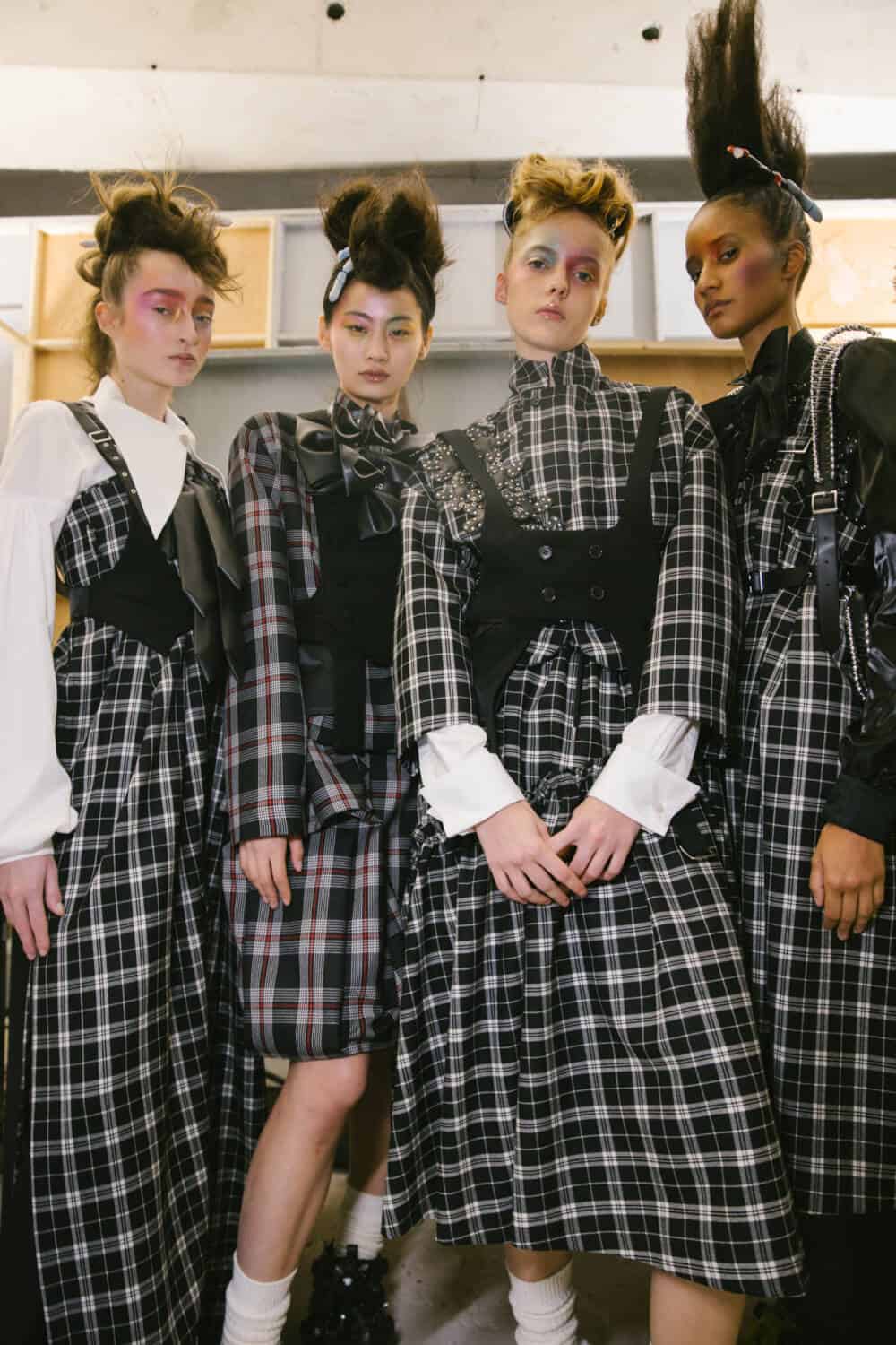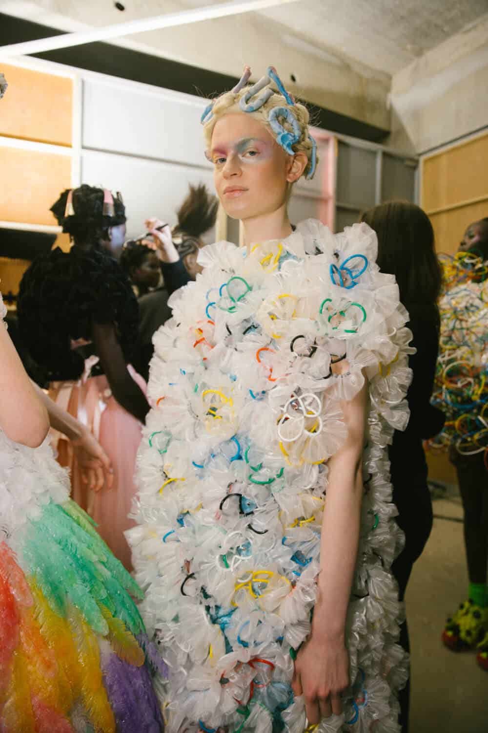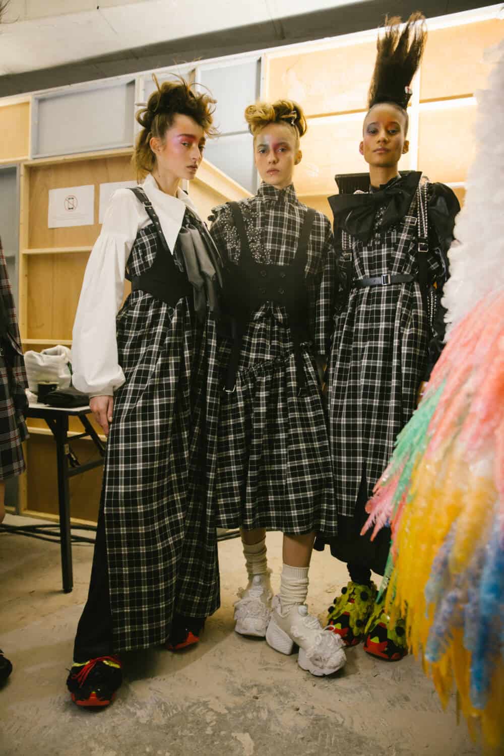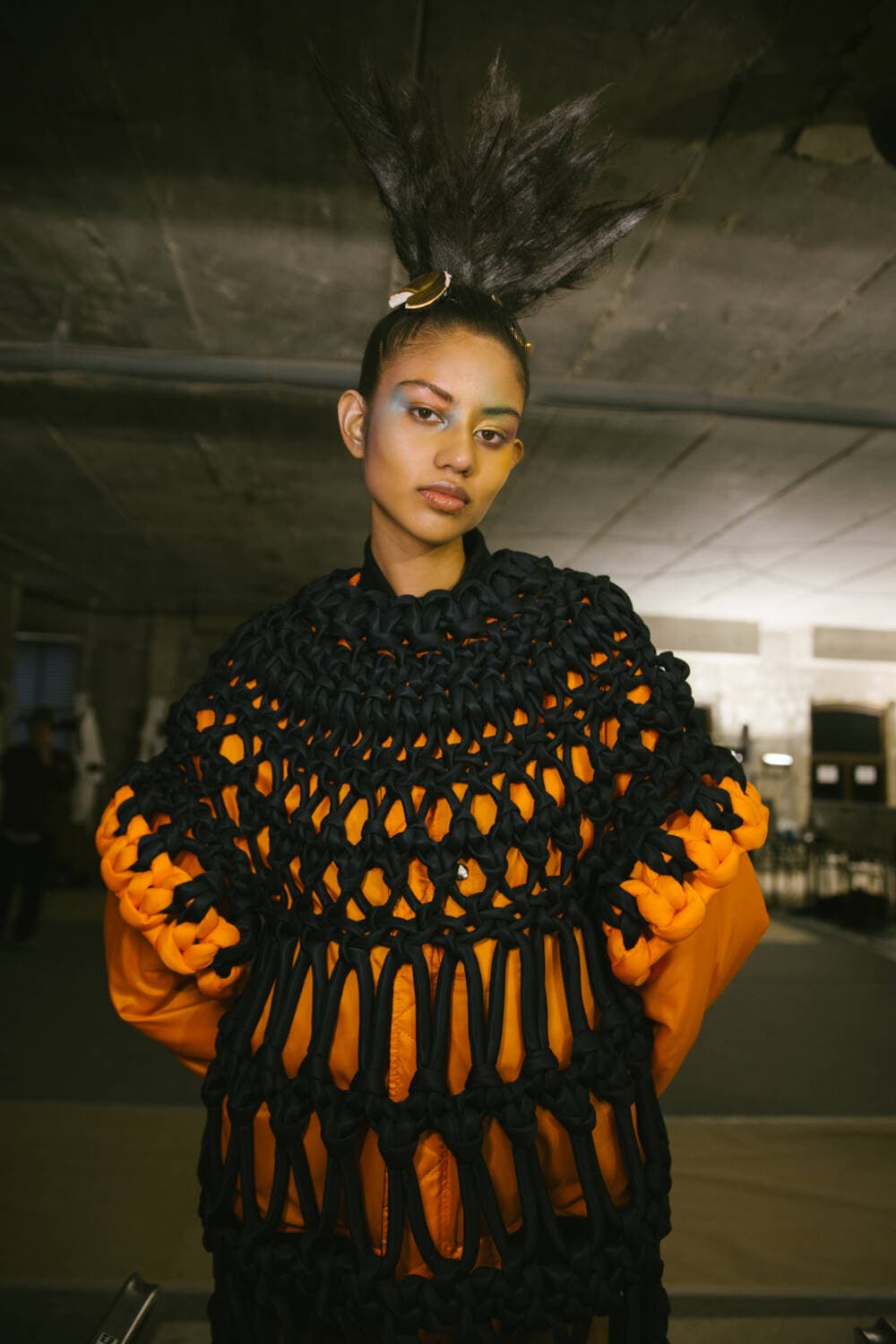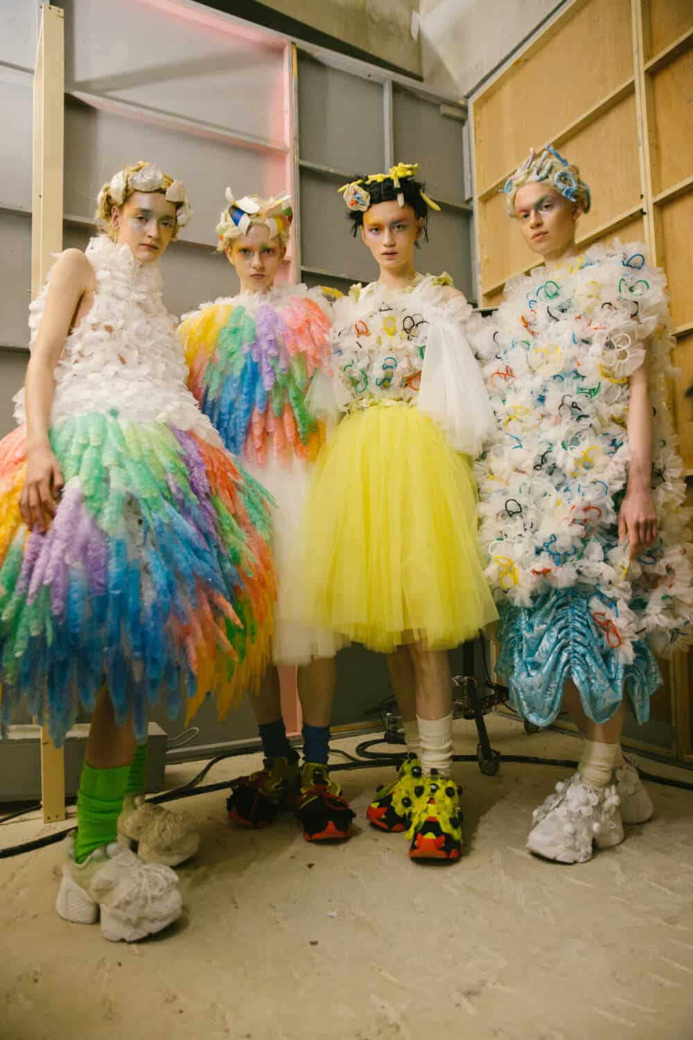 The gothic, alien-like stylings we’ve come to know and love from the Japanese designer were sidetracked for vivid, optimistic concoctions that unleashed one’s inner child. Think cocooning, orb-like dresses crafted from an explosion of primary-hued rubber bands. Or girly frocks made of tulle that was scrunched into what looked like sugar-coated ice pops in shades of raspberry pink, bubblegum blue and syrupy oranges. Ninomiya’s punk codes now came candy-wrapped. His caged dresses sprouted with black flowers before migrating into pink silk and tulle frothy goodness, while green quilted dresses and tartan waistcoats came paired with a new Reebok collab that saw Ninomiya dress up the sport giant’s Instapump Fury trainer with more florals. Things came to a glorious crescendo thanks to an iridescent cloak of shiny, multi-coloured flowers that entirely covered the model’s frame. It left guests beaming from ear to ear.