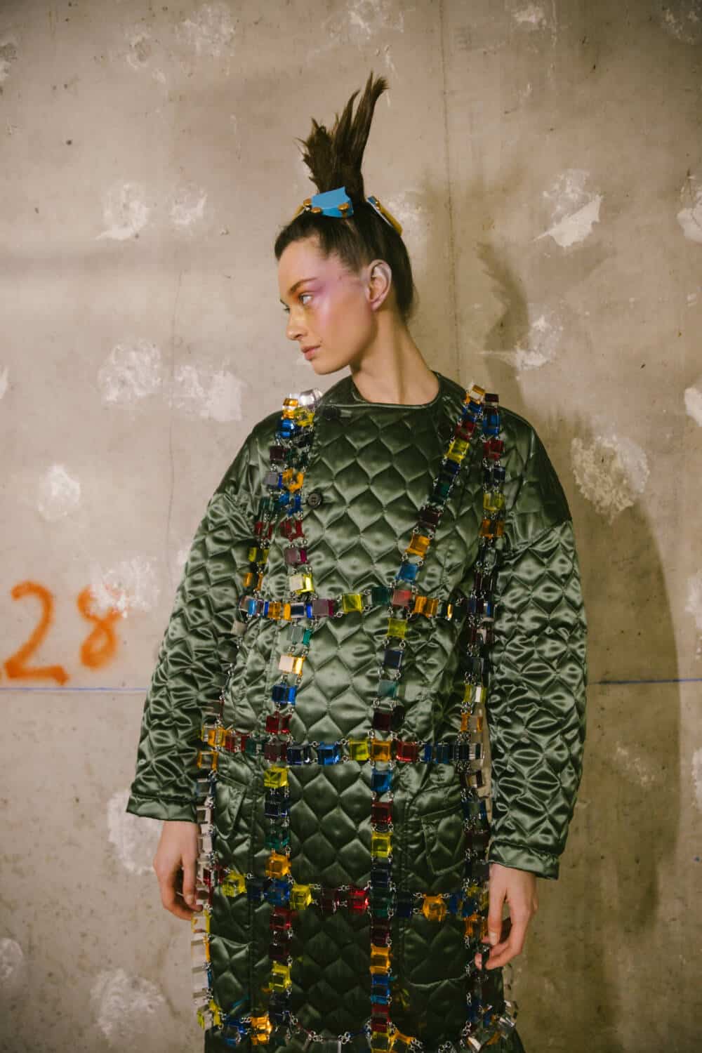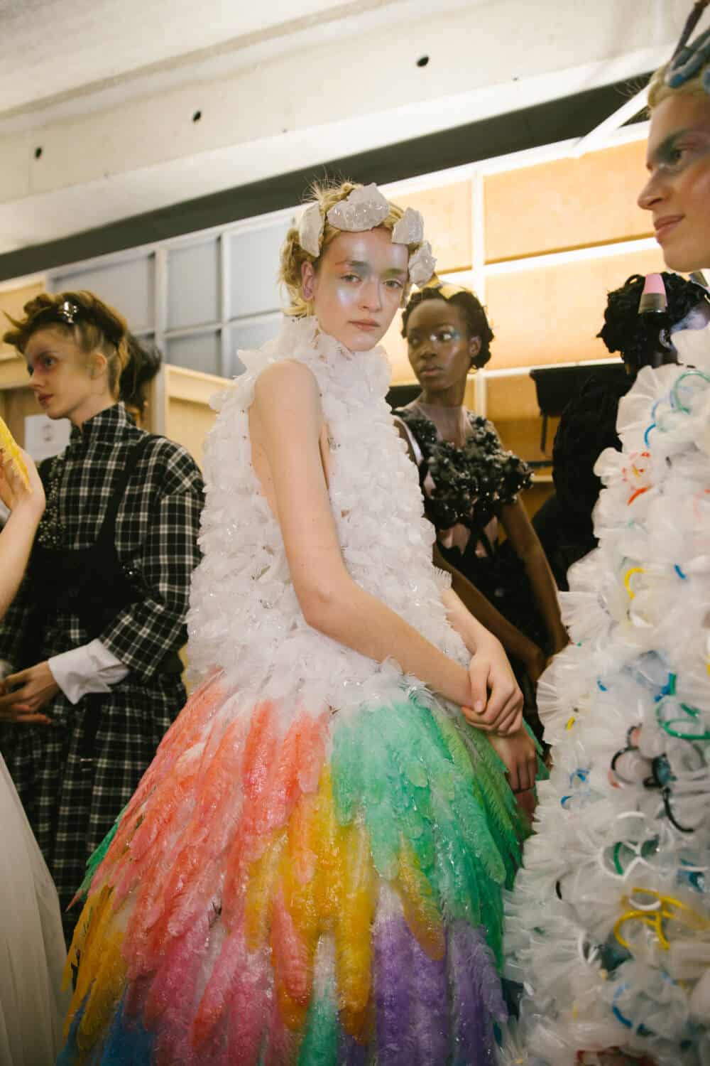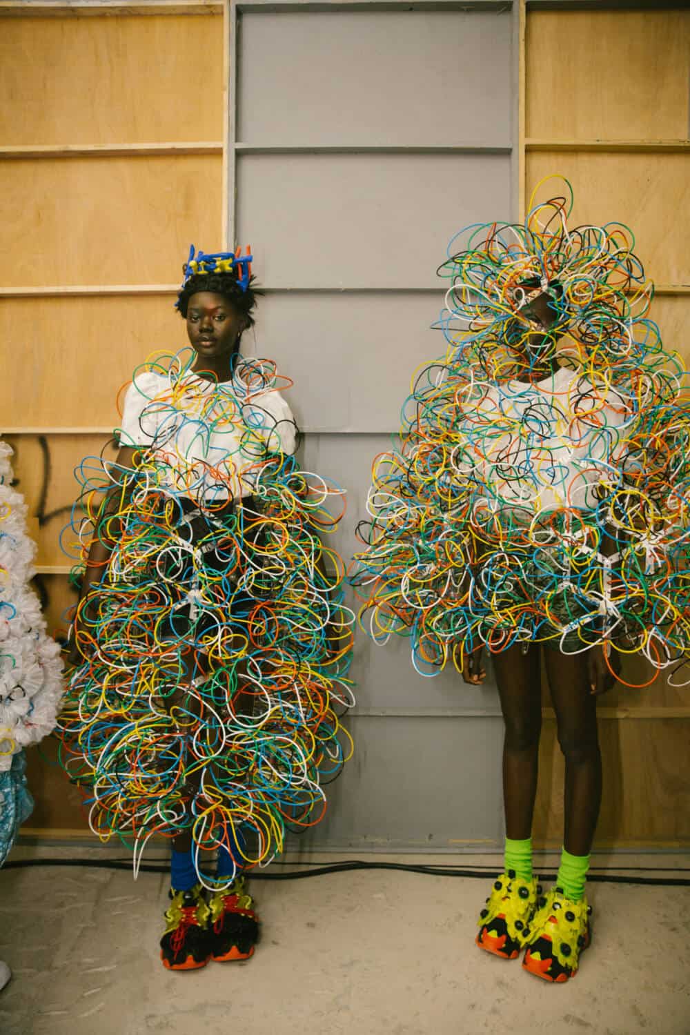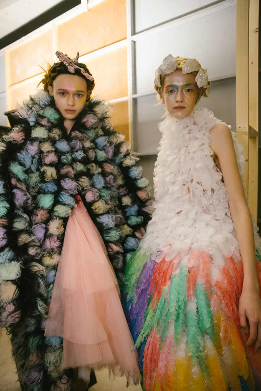 The gothic, alien-like stylings we’ve come to know and love from the Japanese designer were sidetracked for vivid, optimistic concoctions that unleashed one’s inner child. Think cocooning, orb-like dresses crafted from an explosion of primary-hued rubber bands. Or girly frocks made of tulle that was scrunched into what looked like sugar-coated ice pops in shades of raspberry pink, bubblegum blue and syrupy oranges. Ninomiya’s punk codes now came candy-wrapped. His caged dresses sprouted with black flowers before migrating into pink silk and tulle frothy goodness, while green quilted dresses and tartan waistcoats came paired with a new Reebok collab that saw Ninomiya dress up the sport giant’s Instapump Fury trainer with more florals. Things came to a glorious crescendo thanks to an iridescent cloak of shiny, multi-coloured flowers that entirely covered the model’s frame. It left guests beaming from ear to ear.