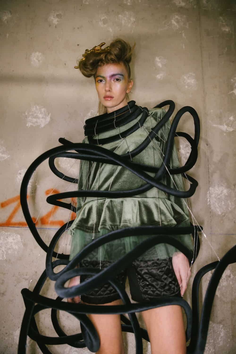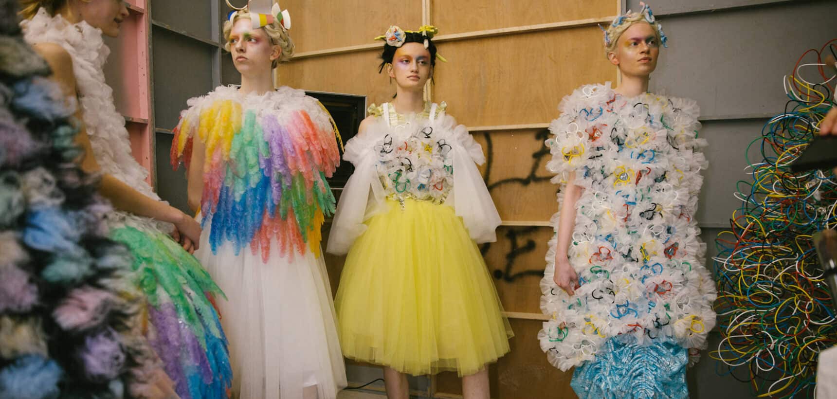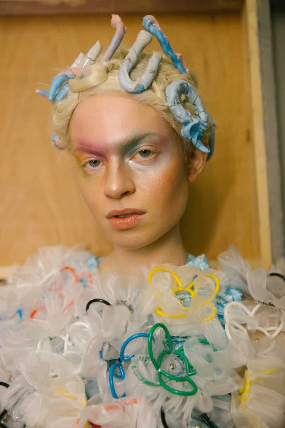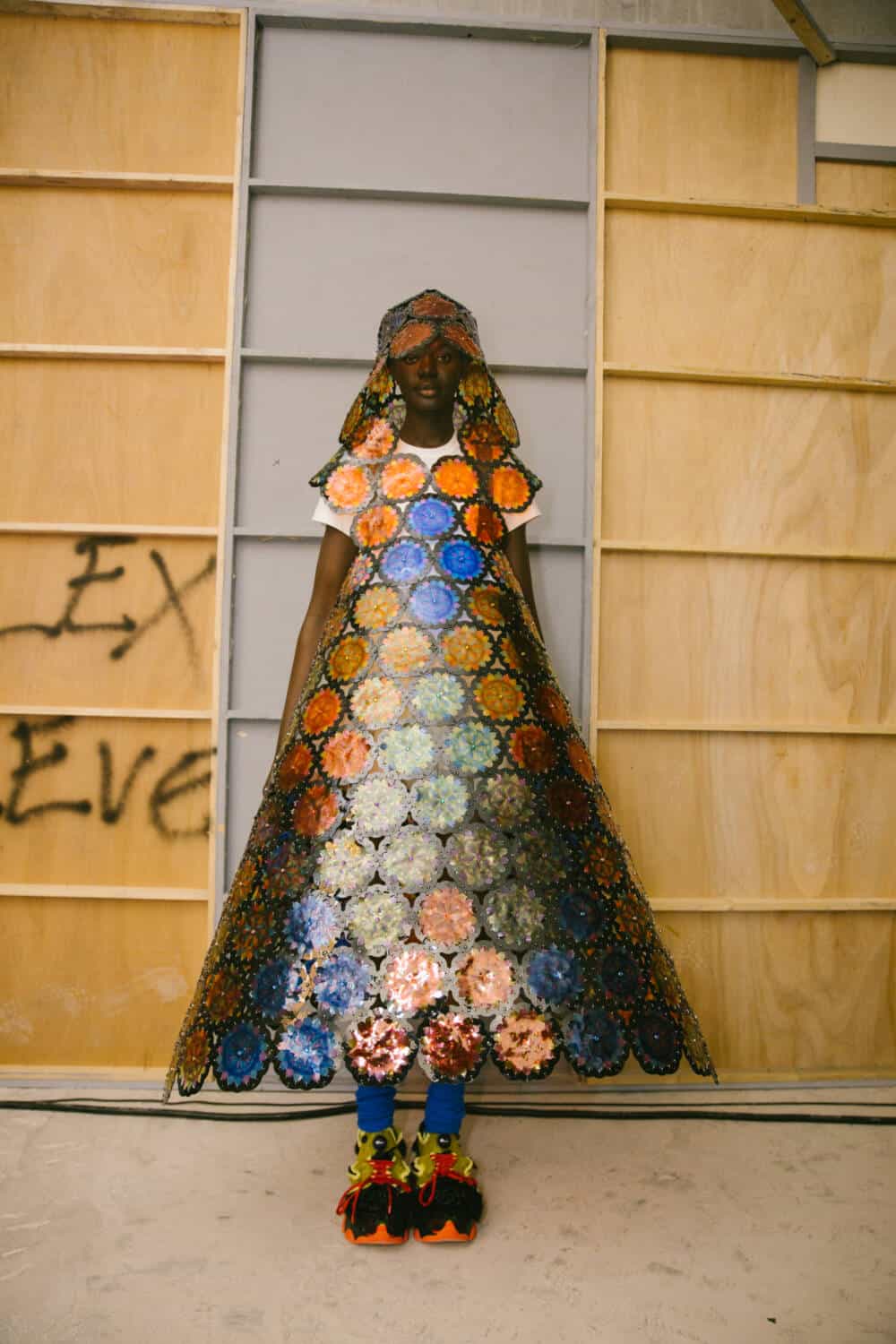 The gothic, alien-like stylings we’ve come to know and love from the Japanese designer were sidetracked for vivid, optimistic concoctions that unleashed one’s inner child. Think cocooning, orb-like dresses crafted from an explosion of primary-hued rubber bands. Or girly frocks made of tulle that was scrunched into what looked like sugar-coated ice pops in shades of raspberry pink, bubblegum blue and syrupy oranges. Ninomiya’s punk codes now came candy-wrapped. His caged dresses sprouted with black flowers before migrating into pink silk and tulle frothy goodness, while green quilted dresses and tartan waistcoats came paired with a new Reebok collab that saw Ninomiya dress up the sport giant’s Instapump Fury trainer with more florals. Things came to a glorious crescendo thanks to an iridescent cloak of shiny, multi-coloured flowers that entirely covered the model’s frame. It left guests beaming from ear to ear.