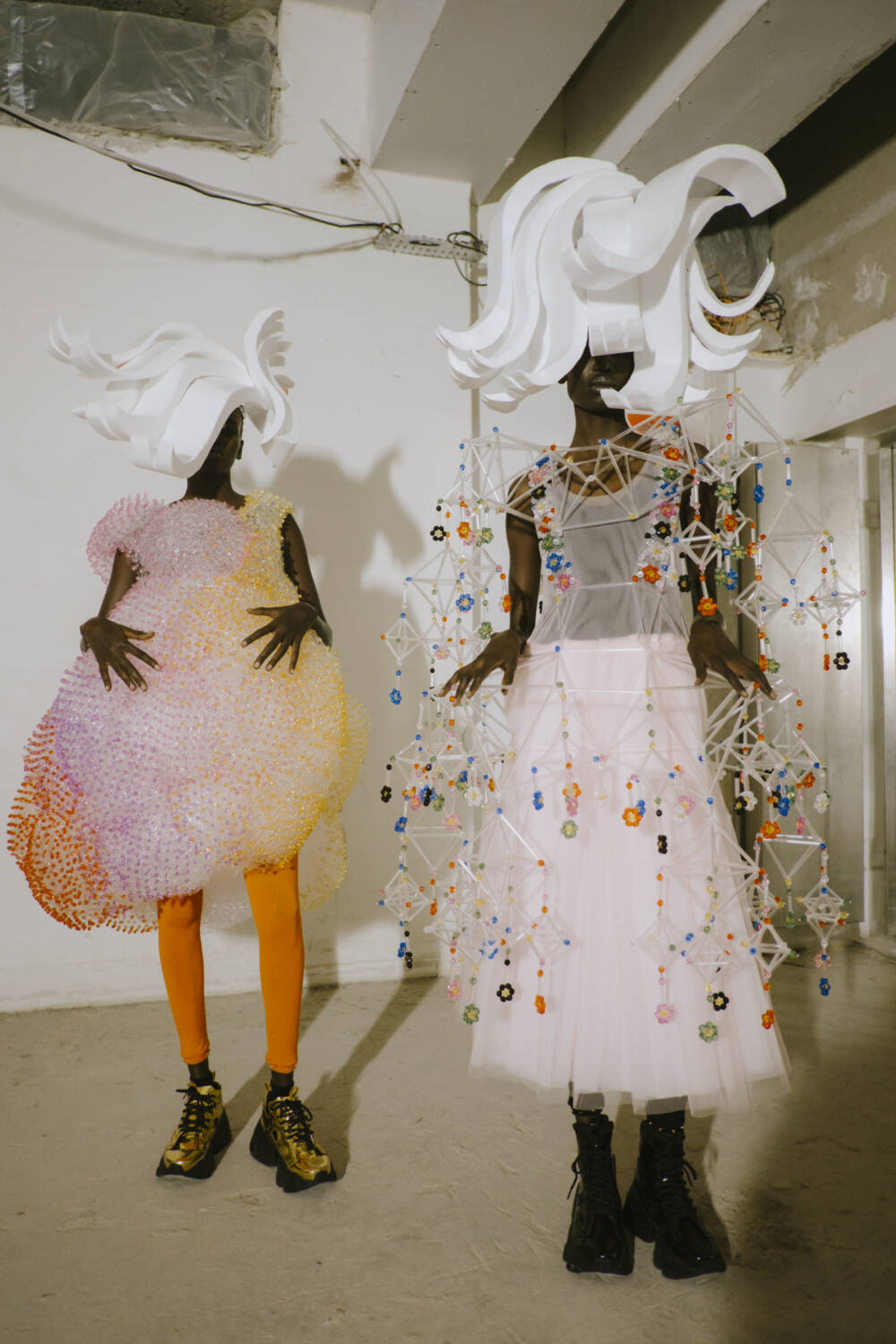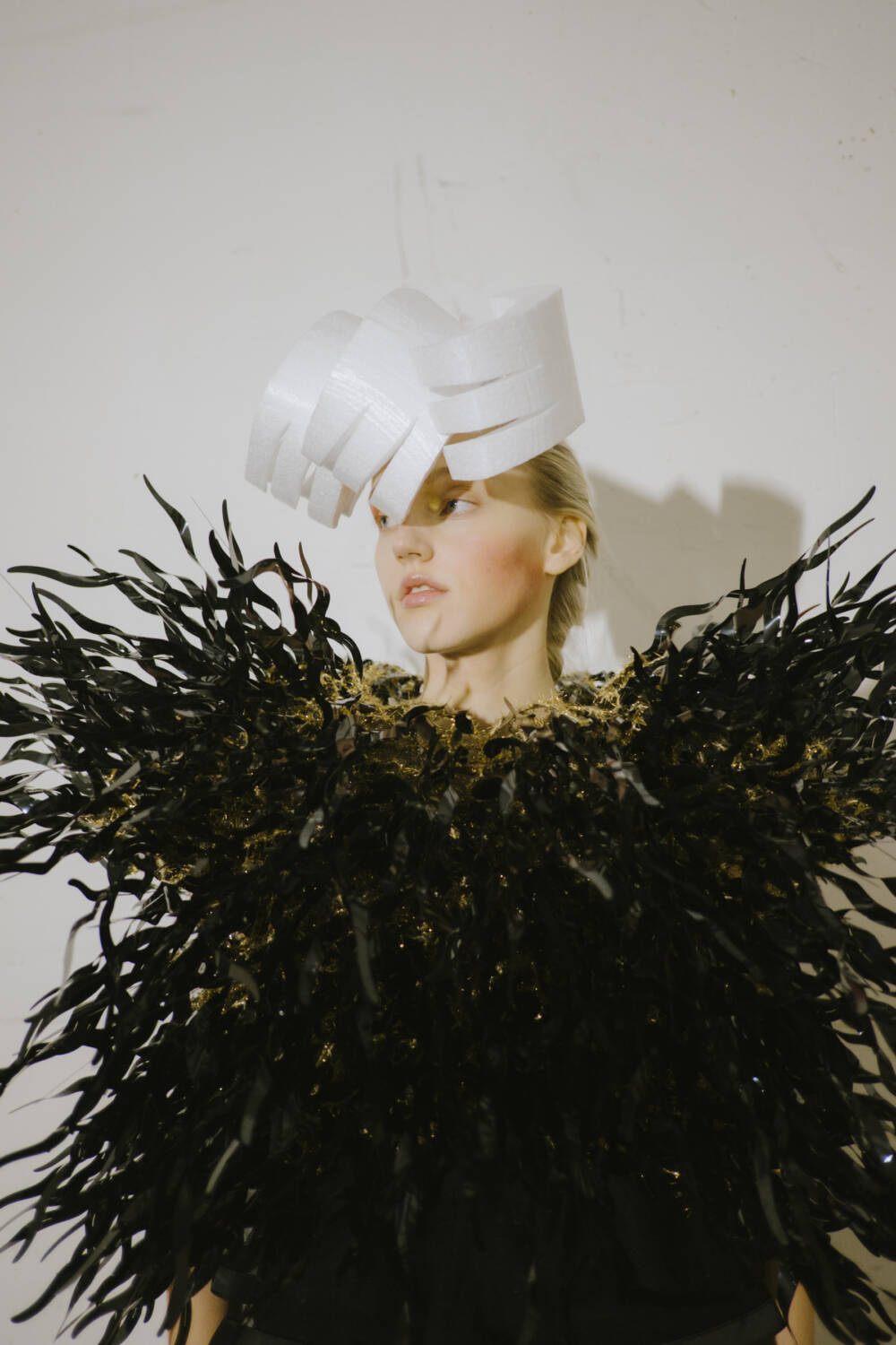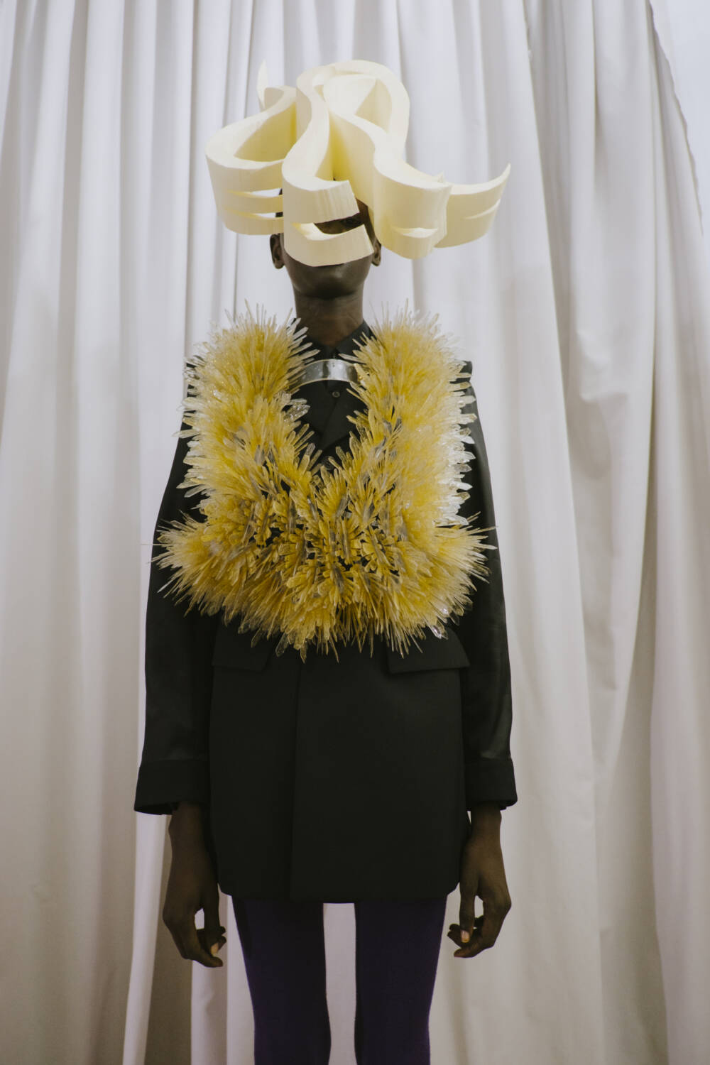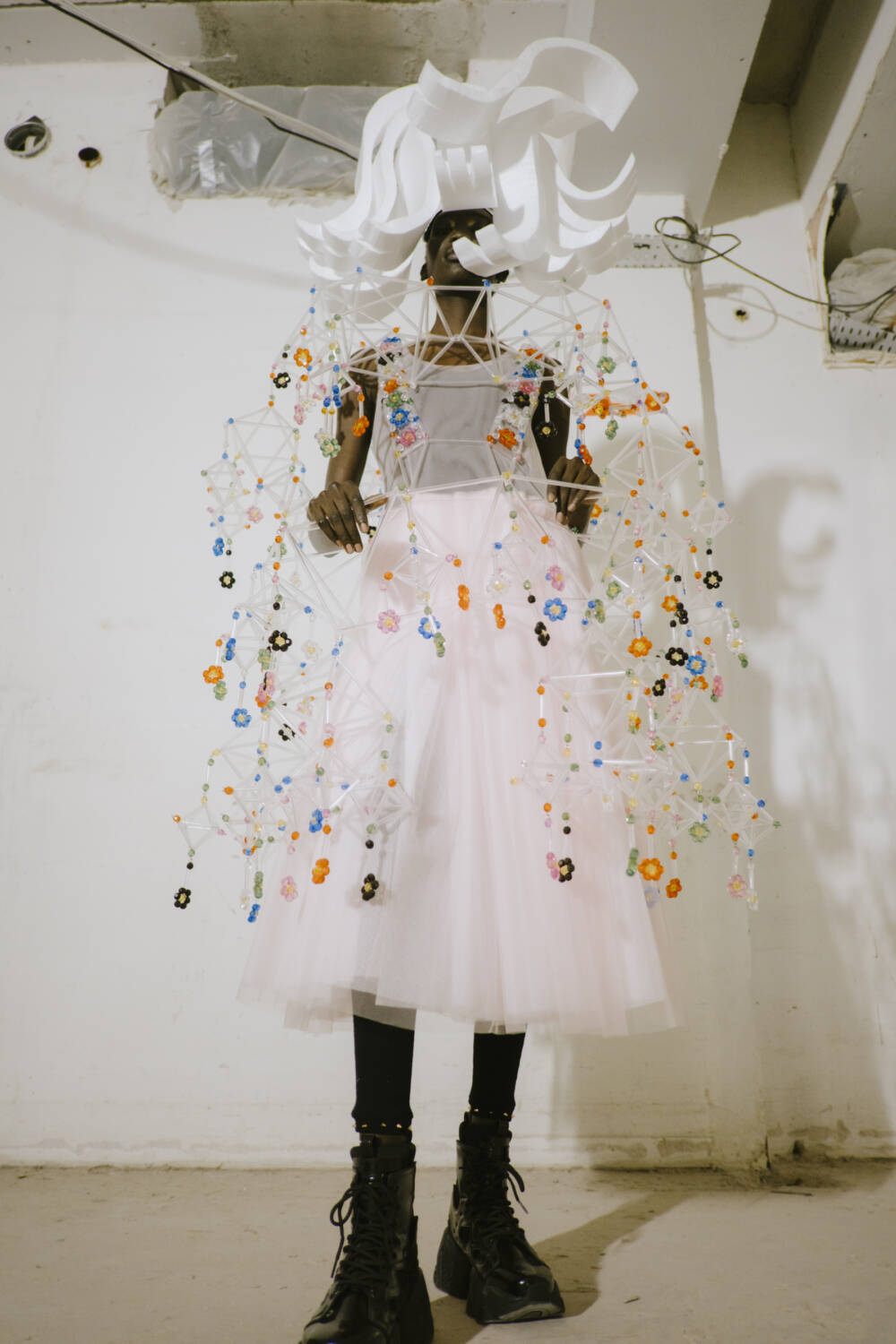 Textures were at the forefront, with cascading tulle, tangled metalwork and architectural floral structures transforming models into walking art pieces. Feathers erupted from shoulders, while oversized, bulbous silhouettes gave an almost otherworldly effect. There was movement, drama and a touch of chaos – controlled, of course, with the precision that has become synonymous with Ninomiya’s name.