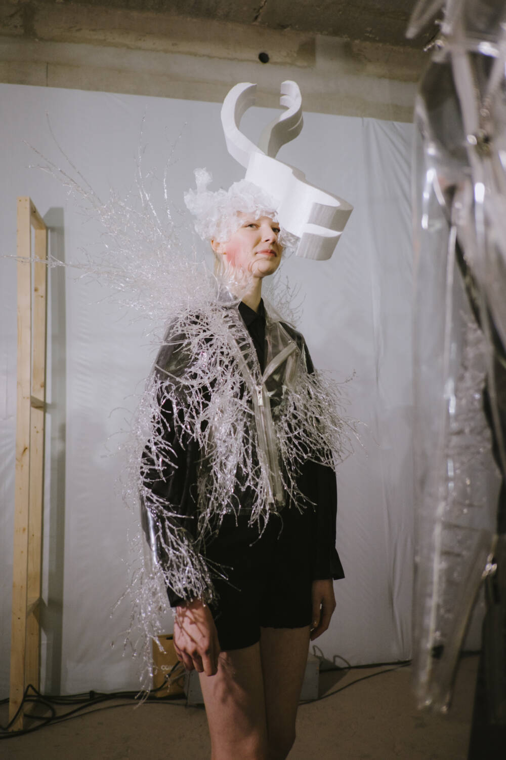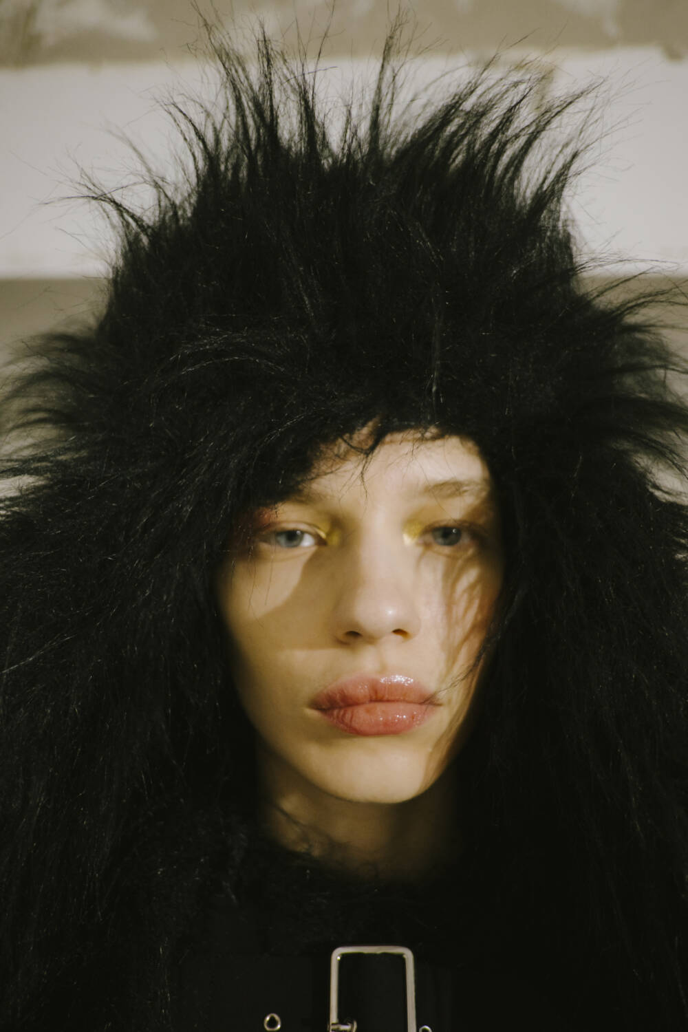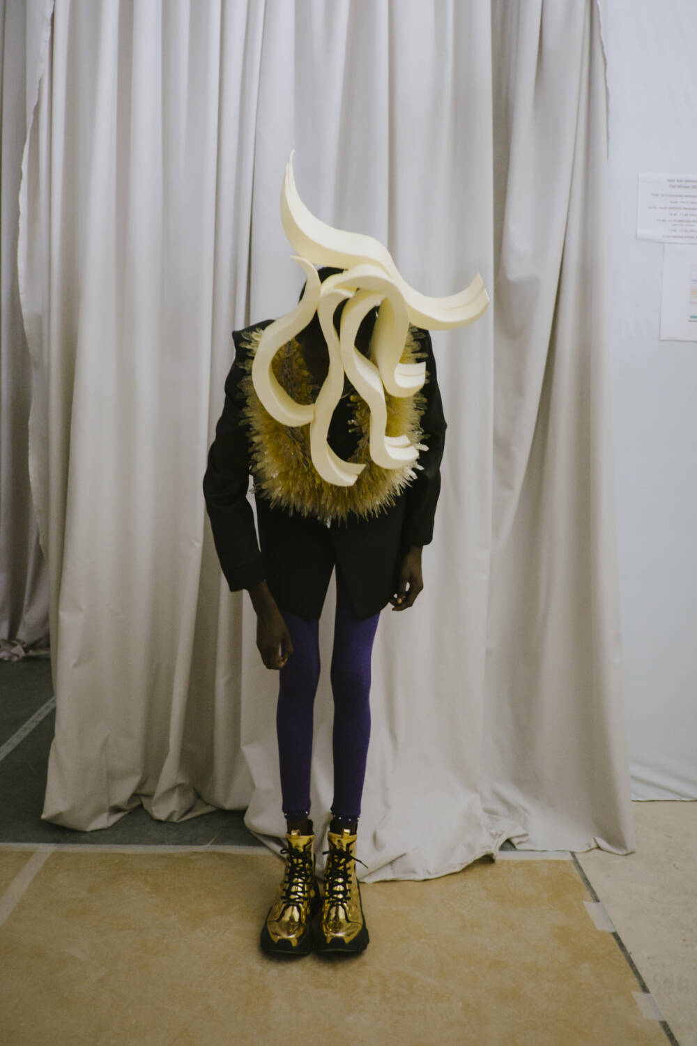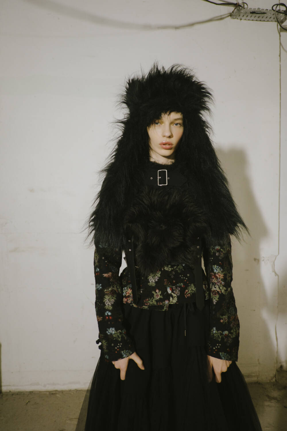 Footwear played a crucial role, with experimental platform boots and a continuation of last season’s collaboration with Reebok, reinterpreting the Instapump Fury with exaggerated proportions. Accessories followed suit, from spiked headpieces to veiled masks, reinforcing the collection’s darkly romantic edge.