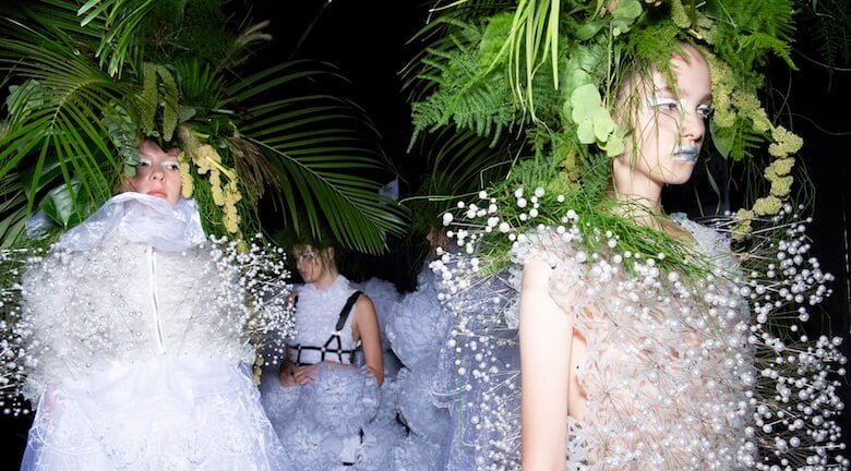 There were remarkable moss skullcaps grass fern headdresses and clusters of cacti fashioned into hats. As the show developed, this virginal purity was disrupted by S&M leather harnesses and by nature itself. Several model’s faces were entirely obliterated by moss and petal masks, as if they’d been reclaimed by nature and become a strange plant/human hybrid. One white ballooning dress featured sharp cactus spikes (fashion as protection) others looked like spiderweb clusters (fashion to ensnare). Nothing was quite what it seemed. Heavy bondage straps cinched a net column to create the silhouette of a classic ball gown. The show ended with snowflake assemblage dresses gently clinking down the catwalk. It was yet another mesmerising fashion moment from designer, Noir Kei Ninomiya.