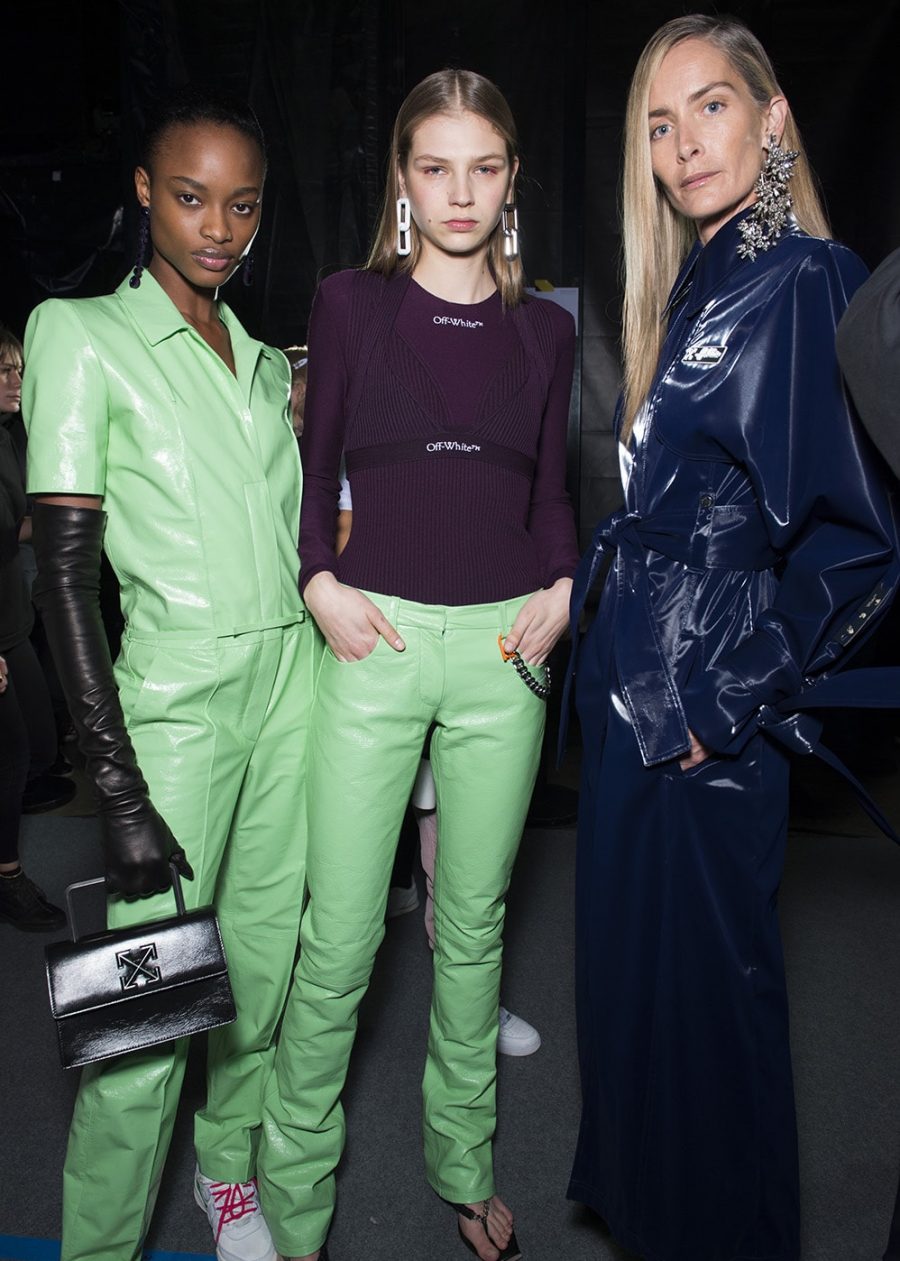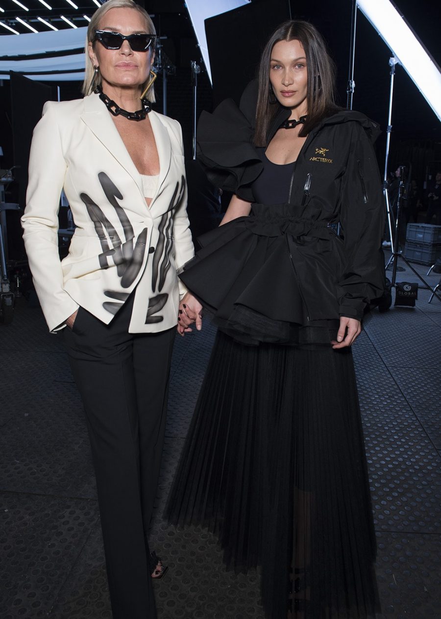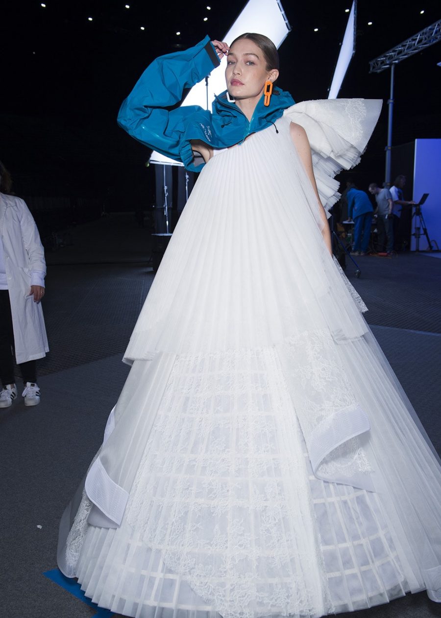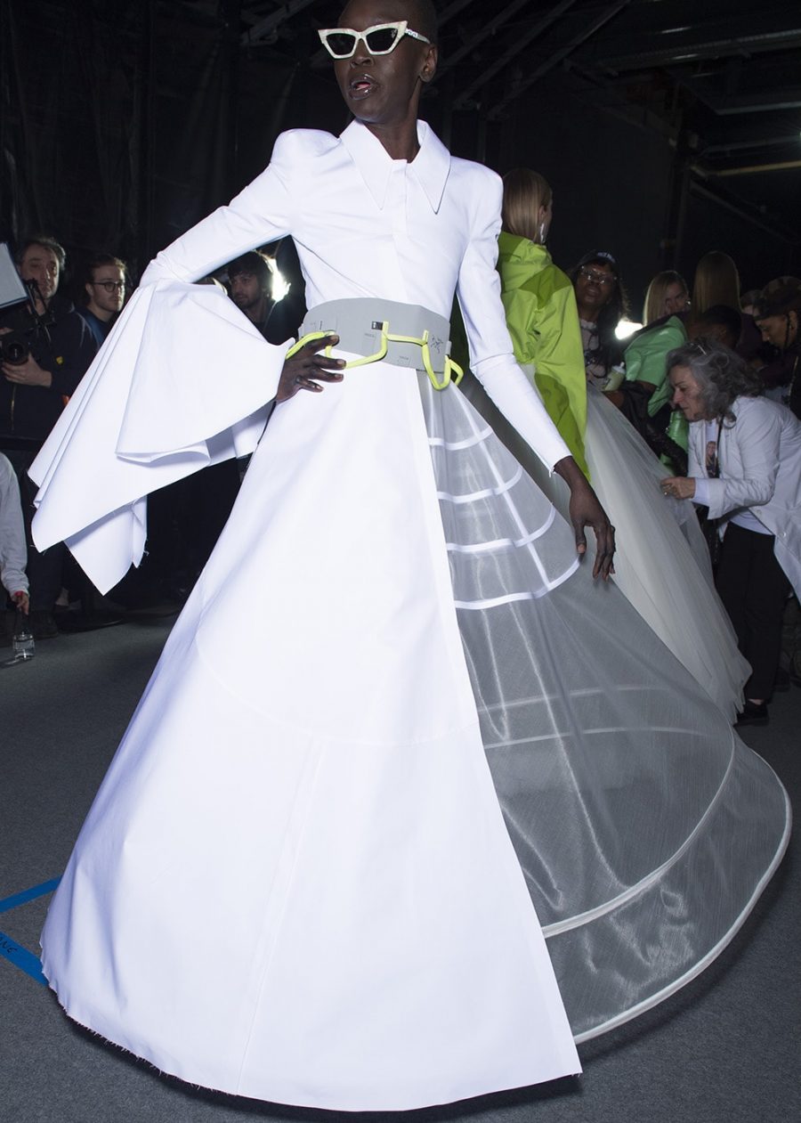 Abloh is now back and ready to design a post-streetwear world (he declared it dead in 2020). What replaces it? The first look, worn by Bella Hadid, was a tulle ball gown. Abloh does love a grand gown and hit Instagram gold last year with Hailey Beiber’s wedding dress. It was worn with an Arc’teryx jacket – the Canadian outdoor performance-wear brand is Abloh’s latest collaborator. There was tailoring, but not the stuffy kind. A lean black coat with a low slung garter-frill belt, was slit to the hip. Another skirt suit came swimming with distorted houndstooth checks.  The post streetwear future isn’t just for kids. Yolanda Hadid walked the show in a white leather jacket with a spray paint motif and Carolyn Murphy reprised a cut-out slinky white dress she wore on Tom Ford’s Gucci runway in the 1990s (one of Abloh’s design “quotations”). Apple green leather overalls brought a souped-up workwear element. The next chapter for Off-White starts here.