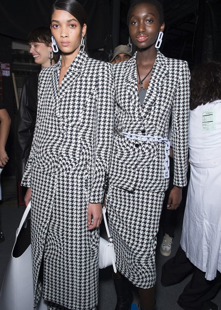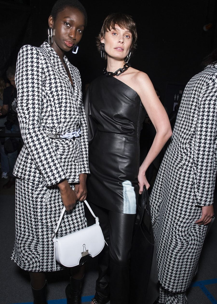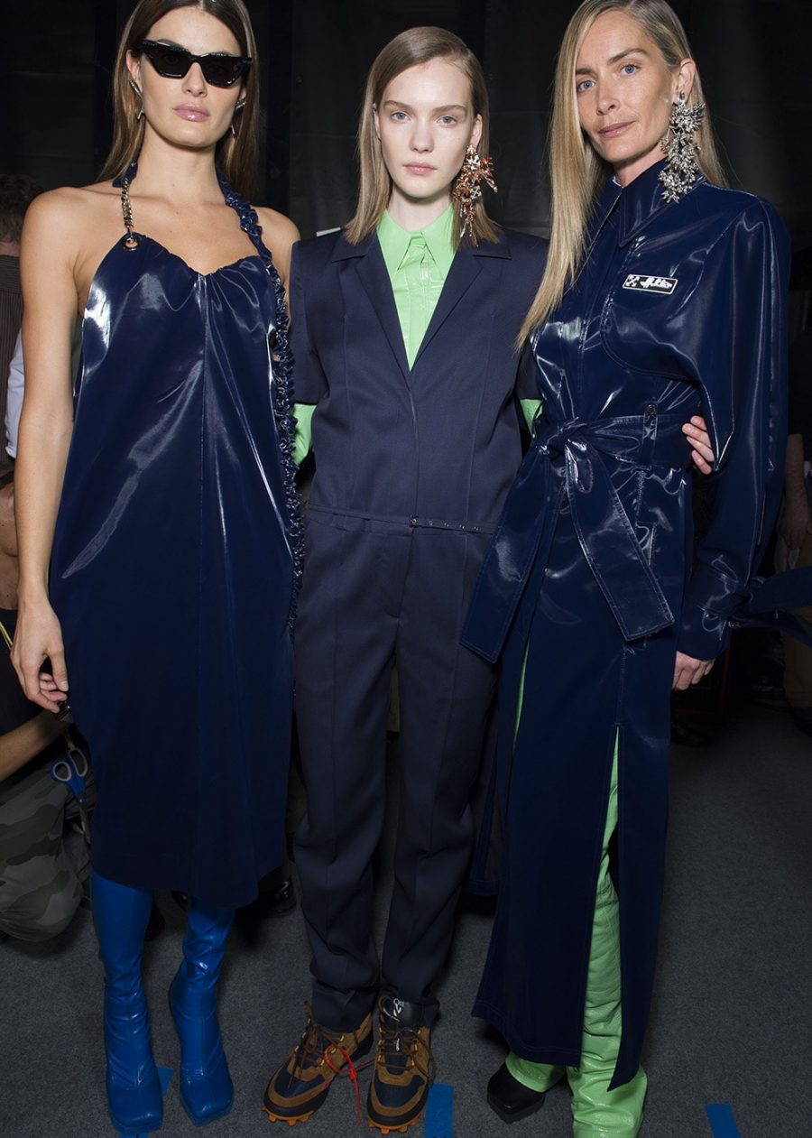 Abloh is now back and ready to design a post-streetwear world (he declared it dead in 2020). What replaces it? The first look, worn by Bella Hadid, was a tulle ball gown. Abloh does love a grand gown and hit Instagram gold last year with Hailey Beiber’s wedding dress. It was worn with an Arc’teryx jacket – the Canadian outdoor performance-wear brand is Abloh’s latest collaborator. There was tailoring, but not the stuffy kind. A lean black coat with a low slung garter-frill belt, was slit to the hip. Another skirt suit came swimming with distorted houndstooth checks.  The post streetwear future isn’t just for kids. Yolanda Hadid walked the show in a white leather jacket with a spray paint motif and Carolyn Murphy reprised a cut-out slinky white dress she wore on Tom Ford’s Gucci runway in the 1990s (one of Abloh’s design “quotations”). Apple green leather overalls brought a souped-up workwear element. The next chapter for Off-White starts here.