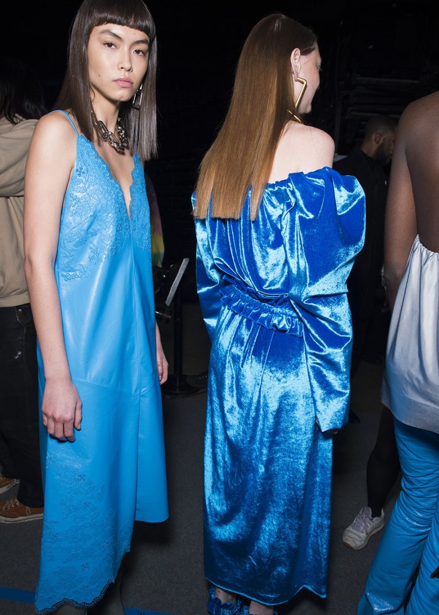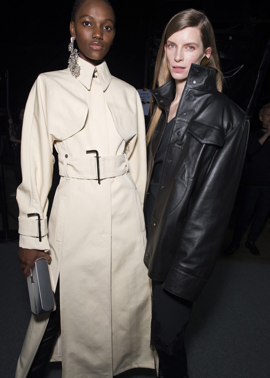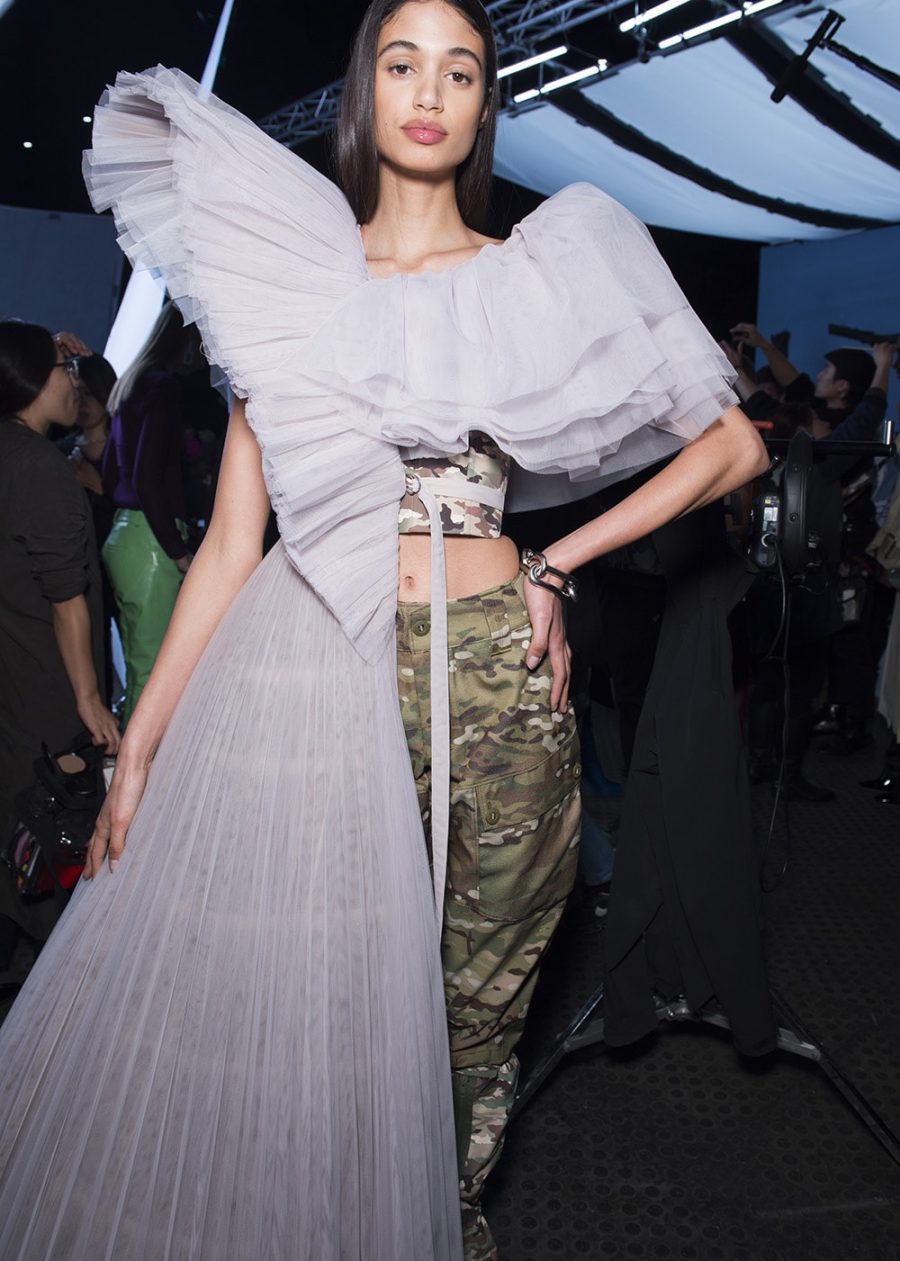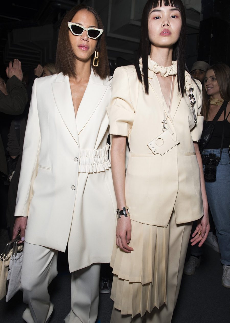 Abloh is now back and ready to design a post-streetwear world (he declared it dead in 2020). What replaces it? The first look, worn by Bella Hadid, was a tulle ball gown. Abloh does love a grand gown and hit Instagram gold last year with Hailey Beiber’s wedding dress. It was worn with an Arc’teryx jacket – the Canadian outdoor performance-wear brand is Abloh’s latest collaborator. There was tailoring, but not the stuffy kind. A lean black coat with a low slung garter-frill belt, was slit to the hip. Another skirt suit came swimming with distorted houndstooth checks.  The post streetwear future isn’t just for kids. Yolanda Hadid walked the show in a white leather jacket with a spray paint motif and Carolyn Murphy reprised a cut-out slinky white dress she wore on Tom Ford’s Gucci runway in the 1990s (one of Abloh’s design “quotations”). Apple green leather overalls brought a souped-up workwear element. The next chapter for Off-White starts here.