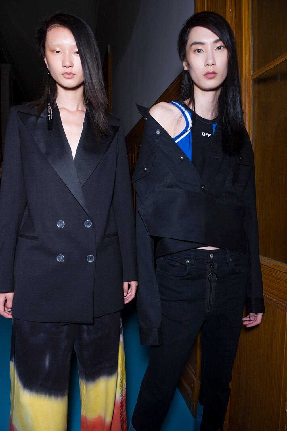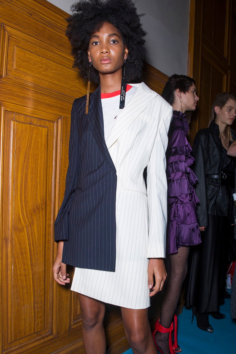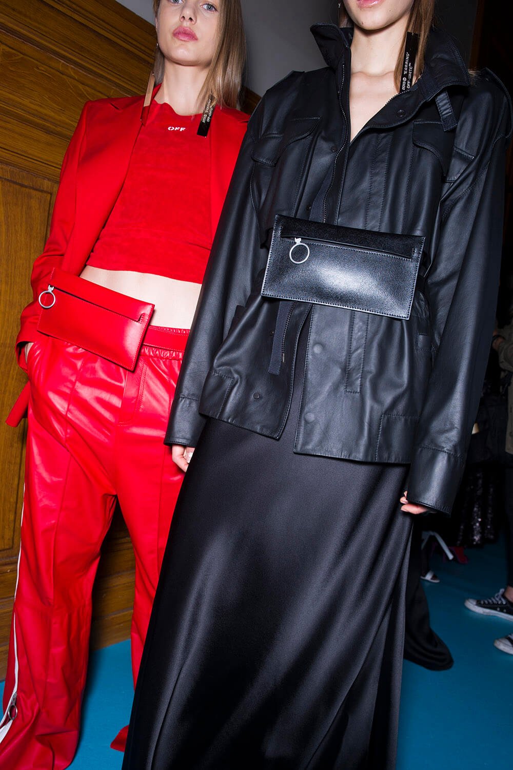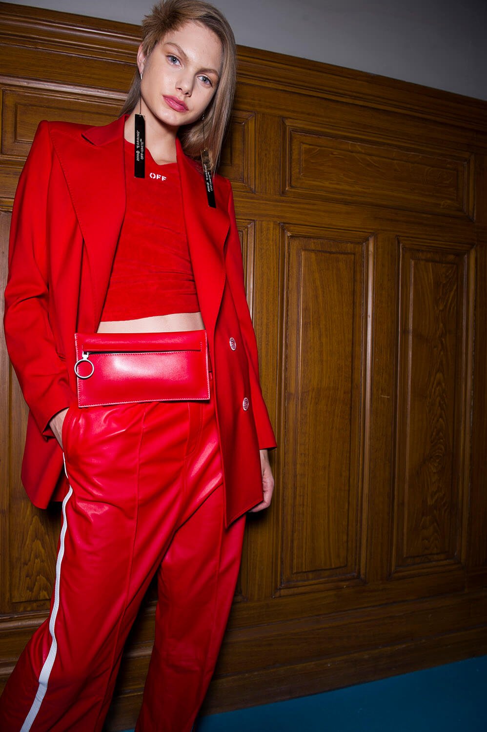 It’s all about being in the moment and Off-white is the pinnacle of this moment. On the surface it’s street style, but it’s so much more than that. If we do say so ourselves. So were so intrigued when we learnt that this time, Off-white’s girl is a “Business Woman.” This girl is going places. This is the business woman for right here right now. She dresses how she wants to dress because today, in this moment, no one dresses how you might expect. That’s the best part about riding this moment of total freedom. You can do what you want. And so Virgil does what he wants, so cleverly. Inside, the runway ran deep, swimming pool blue. Fresh, clean. So Off-white. Not literally. “I definitely didn’t grow up thinking I was cool,” a voice said, beginning the show. Well, good, because neither did we. “I had a lot of self independence from a young age.” That set the tone. This collection was a big fuck you to pre conceived ideas of how any woman going about her business should be dress like. To what women should be dressed like, full stop. Virgil has it all. Blazers paired with baseball caps, red leather dresses and cropped jackets, white stripe easy please nouveau track pants. He defined the pant of the season, high but flared and slouchy. Deep purple fringe dresses and tshirts under black satin slip dresses. Double denim and of course, sweaters branded with OFF WHITE, the word ‘woman’ everywhere. Because being a woman is so good, right, yes, we need to celebrate. And we must add in the music. Oh, the music. Only Virgil nails a collection that is exhilarated by Kate Bush’s Running Up That Hill and ends in Frank Ocean’s Solo, much to Kanye’s delight. This is the Off-white generation. Virgil Abloh is our leader. We are following.
