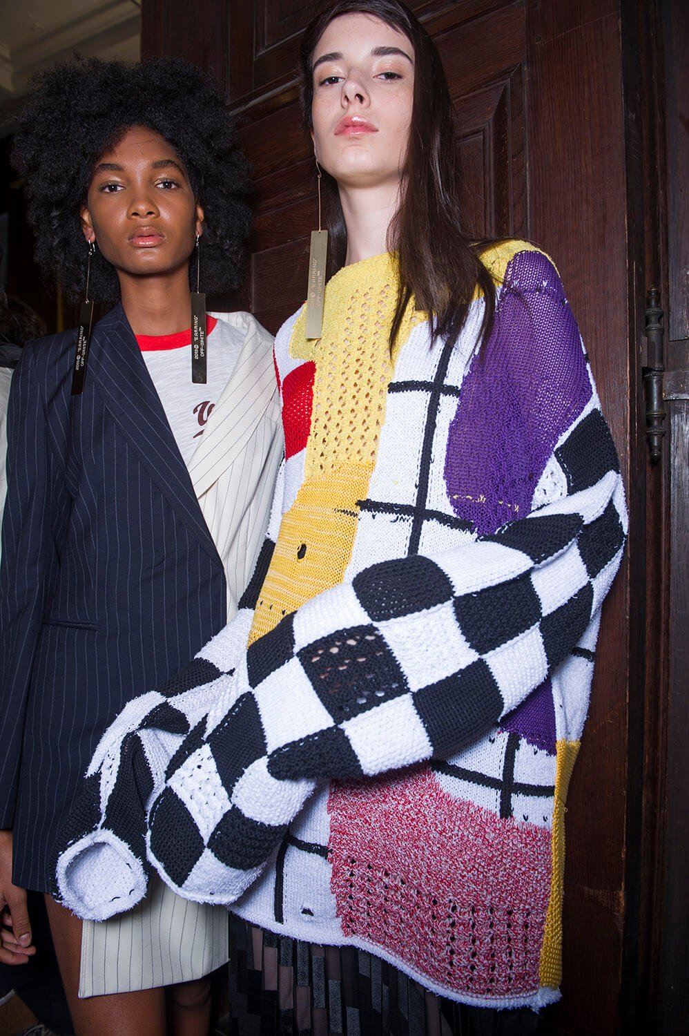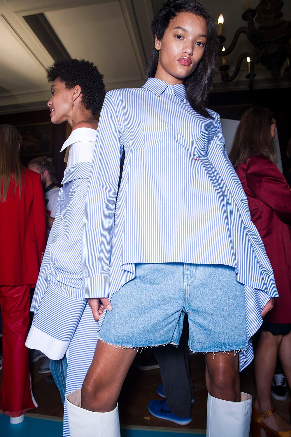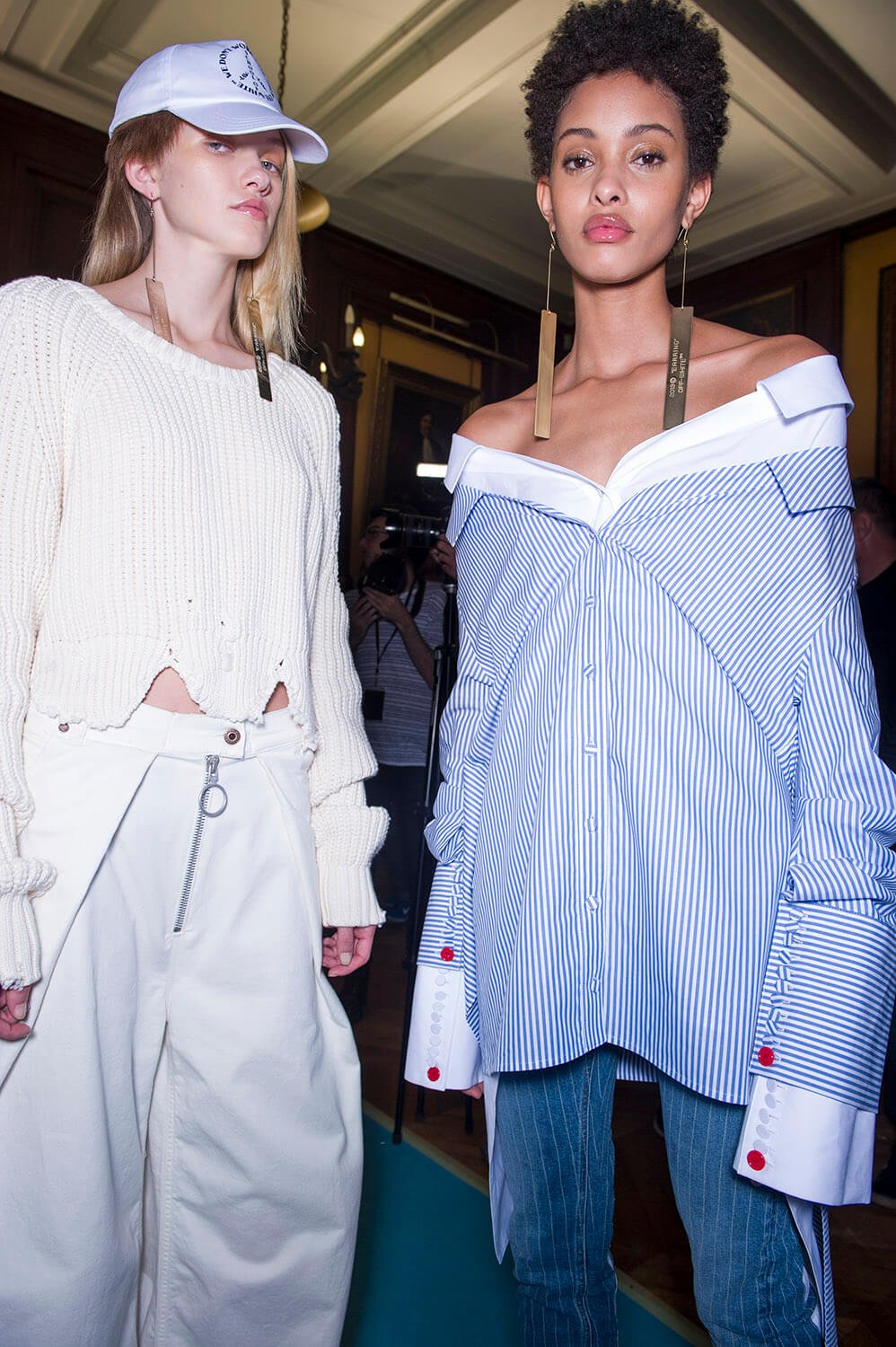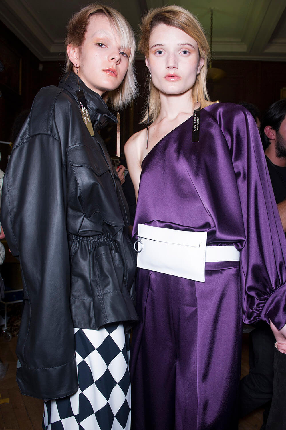 It’s all about being in the moment and Off-white is the pinnacle of this moment. On the surface it’s street style, but it’s so much more than that. If we do say so ourselves. So were so intrigued when we learnt that this time, Off-white’s girl is a “Business Woman.” This girl is going places. This is the business woman for right here right now. She dresses how she wants to dress because today, in this moment, no one dresses how you might expect. That’s the best part about riding this moment of total freedom. You can do what you want. And so Virgil does what he wants, so cleverly. Inside, the runway ran deep, swimming pool blue. Fresh, clean. So Off-white. Not literally. “I definitely didn’t grow up thinking I was cool,” a voice said, beginning the show. Well, good, because neither did we. “I had a lot of self independence from a young age.” That set the tone. This collection was a big fuck you to pre conceived ideas of how any woman going about her business should be dress like. To what women should be dressed like, full stop. Virgil has it all. Blazers paired with baseball caps, red leather dresses and cropped jackets, white stripe easy please nouveau track pants. He defined the pant of the season, high but flared and slouchy. Deep purple fringe dresses and tshirts under black satin slip dresses. Double denim and of course, sweaters branded with OFF WHITE, the word ‘woman’ everywhere. Because being a woman is so good, right, yes, we need to celebrate. And we must add in the music. Oh, the music. Only Virgil nails a collection that is exhilarated by Kate Bush’s Running Up That Hill and ends in Frank Ocean’s Solo, much to Kanye’s delight. This is the Off-white generation. Virgil Abloh is our leader. We are following.