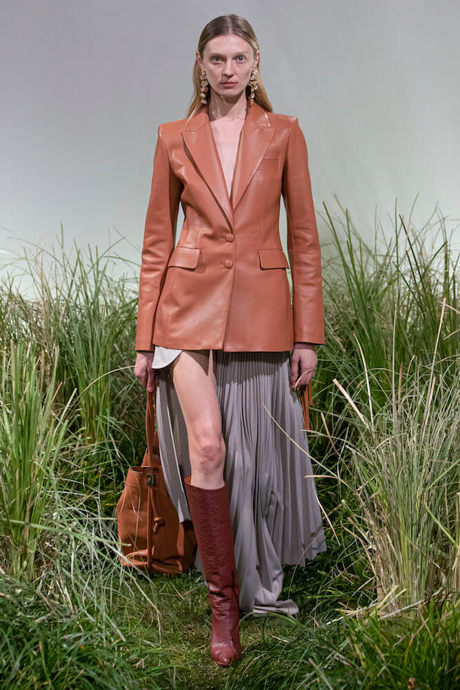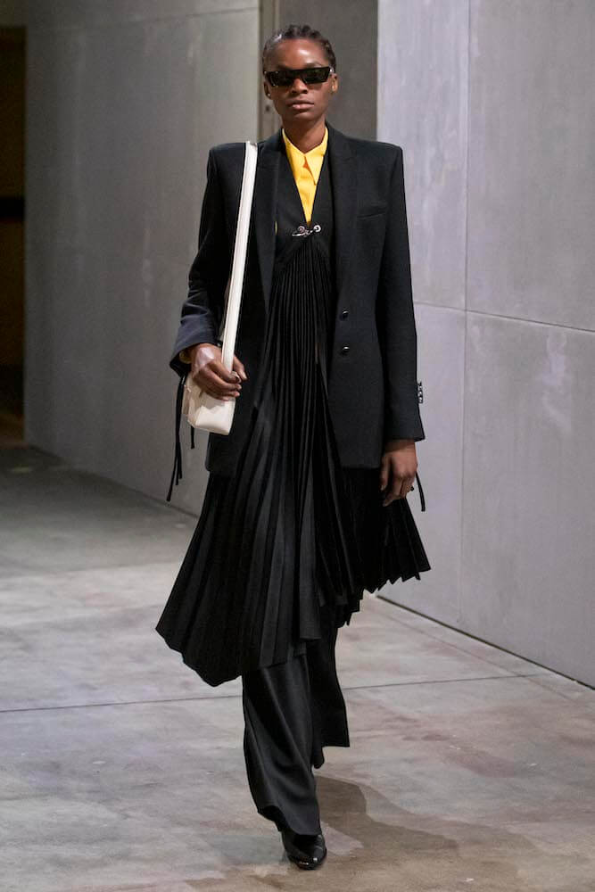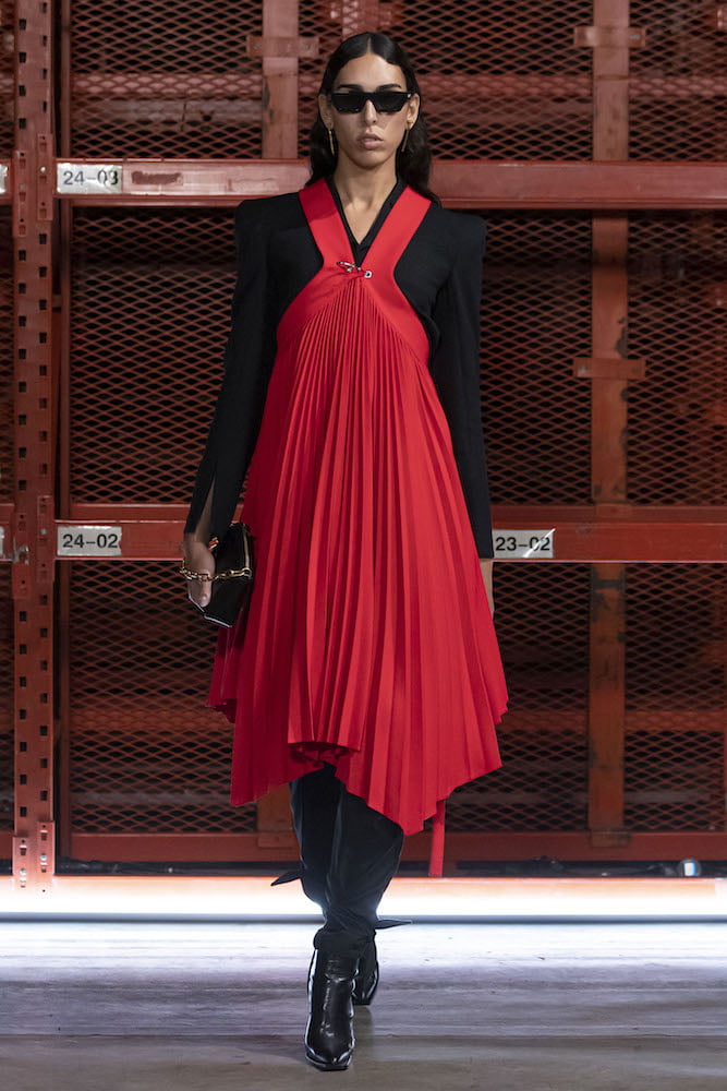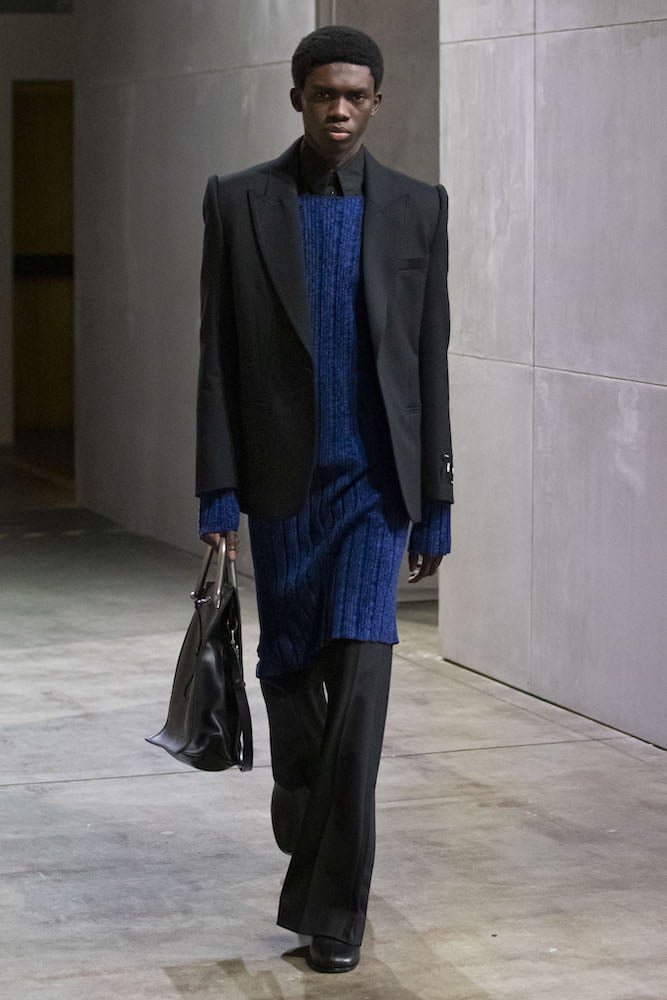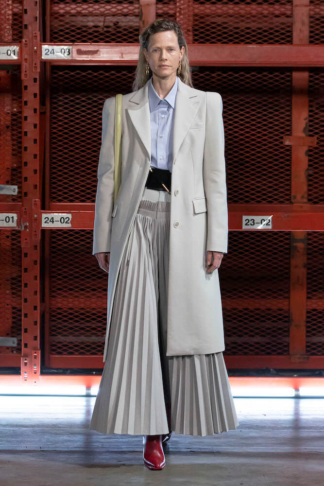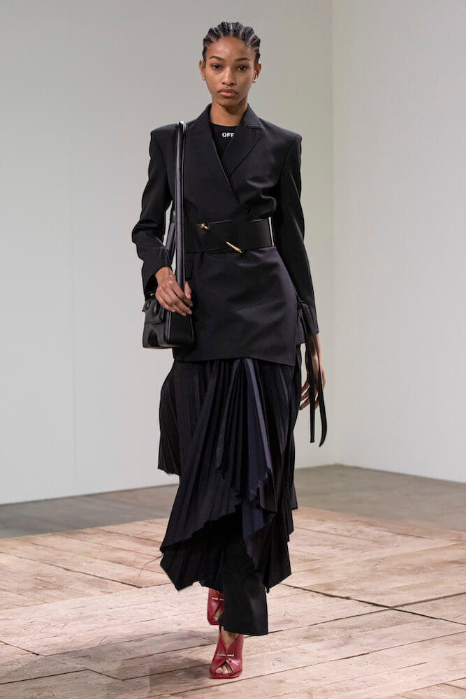 The merging of Off-White’s mens- and womenswear design studios this season has created a fluid collection; free from the shackles of strict, gendered tropes. When it comes to the stars of Imaginary TV, girls wear mannish blazers and boys don elongated pleated skirts. Guys were halternecks over crimson red office shirts, and the ladies sport razer sharp leather trenches.