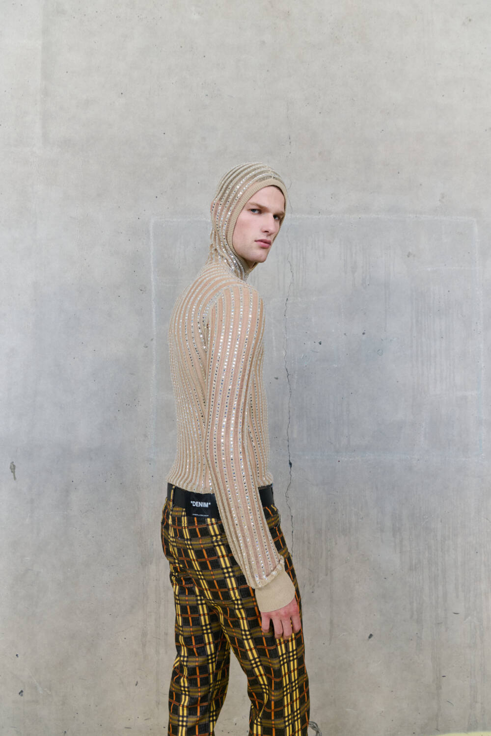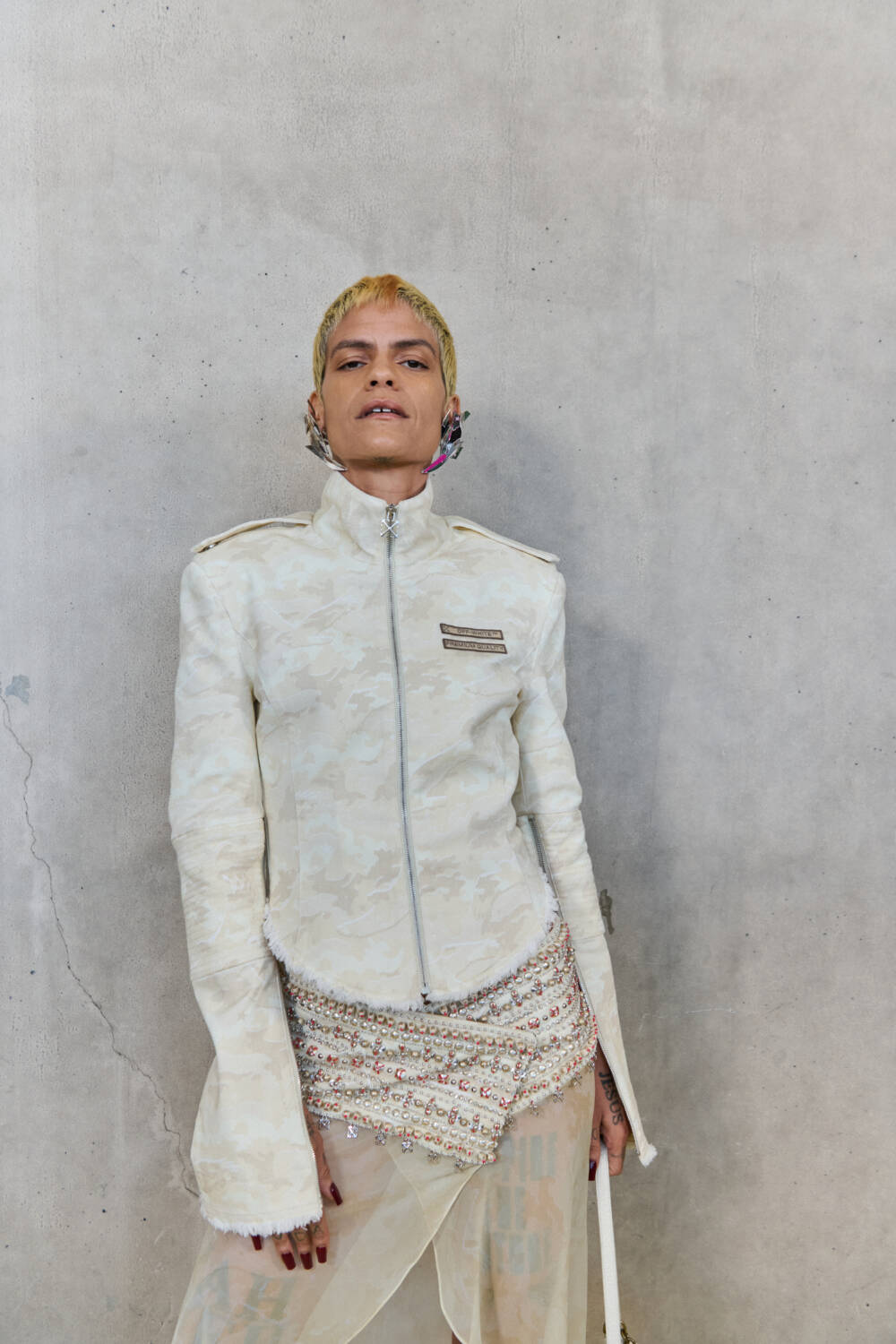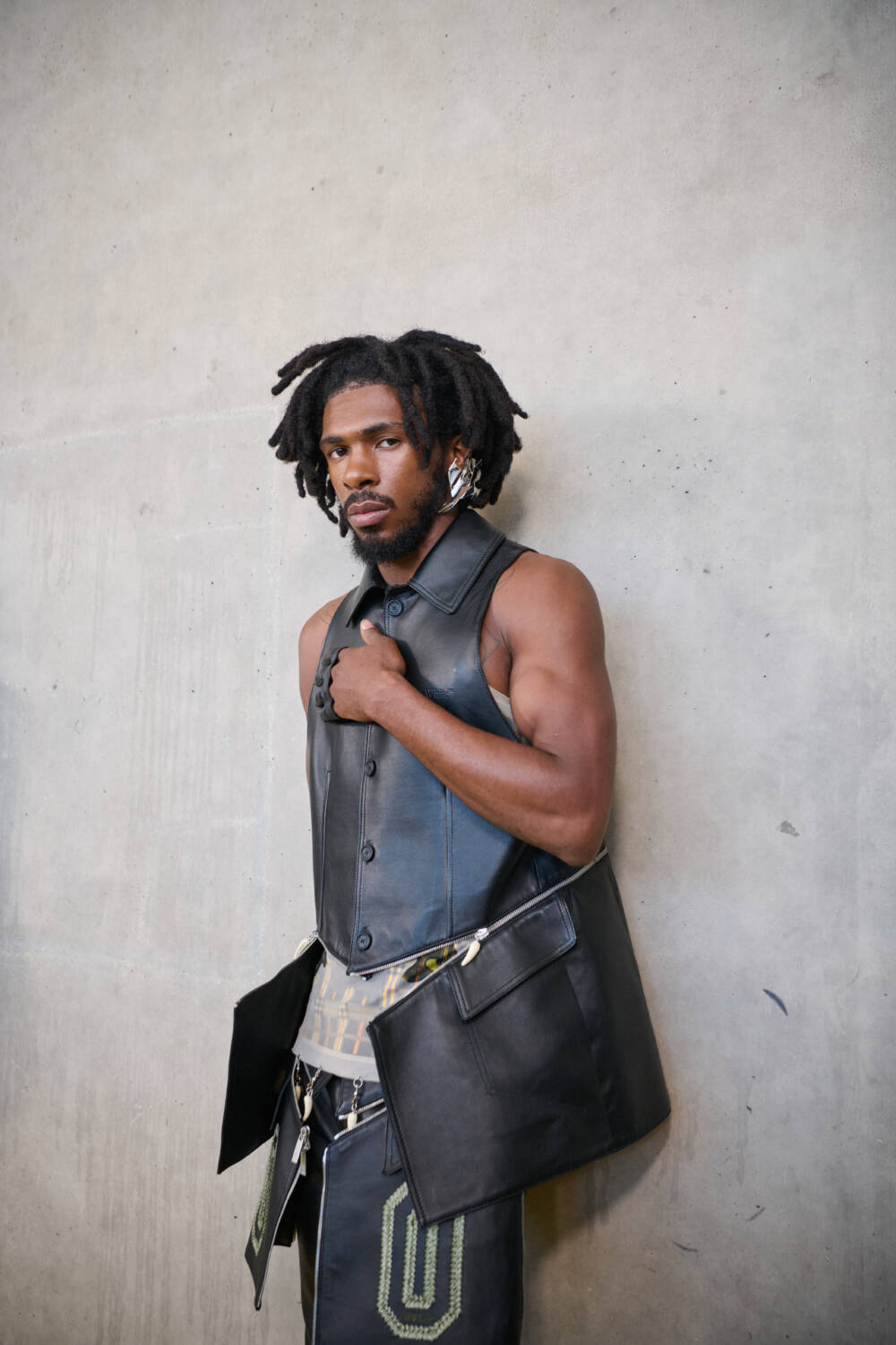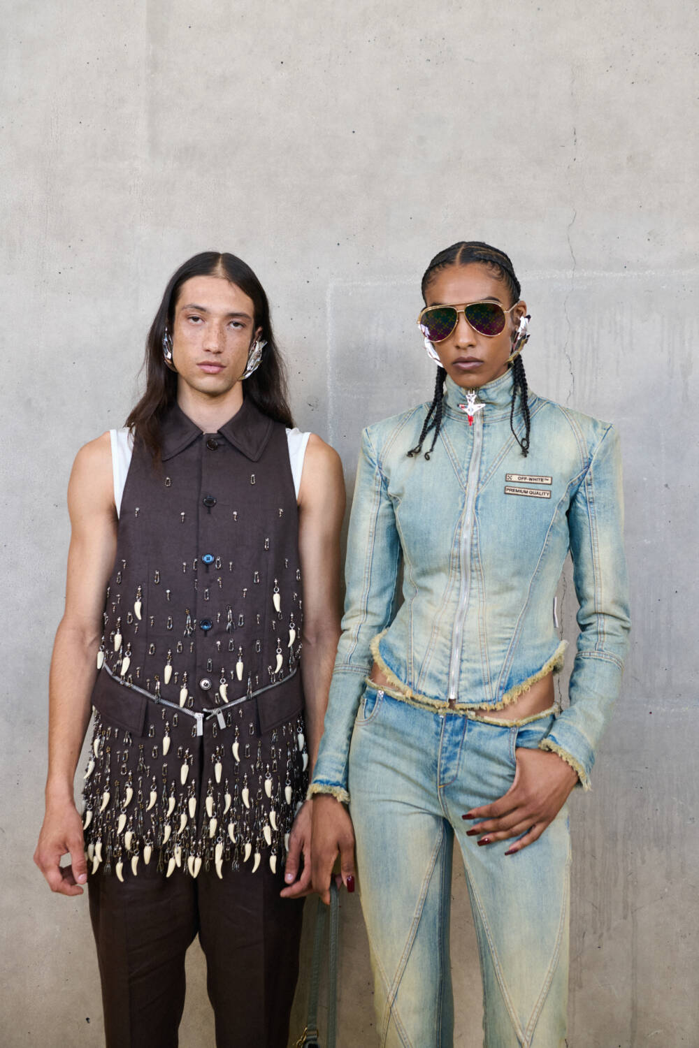 Standout looks included ultra-thin, rhinestone-ribbed hoodies, bead-embellished vests and star-shaped skirts, all in an African colour palette. Many of the looks were worn with ‘sex’ belts, while distorted or shredded denim and leather heavy with zippers were a key feature throughout. Utilitarian lines were sharp and architectural across men’s and womenswear, with a prevailing sense of athletic Afro-futurism in every look. Shoulders were padded, transparencies were seductive, and prints included camouflage and orange plaid while a new ‘arrows’ motif and hand-painted graphics were created by Ghanaian contemporary artist Nana Danso.