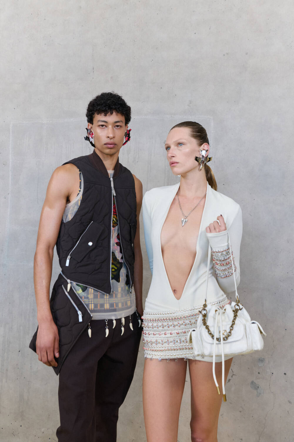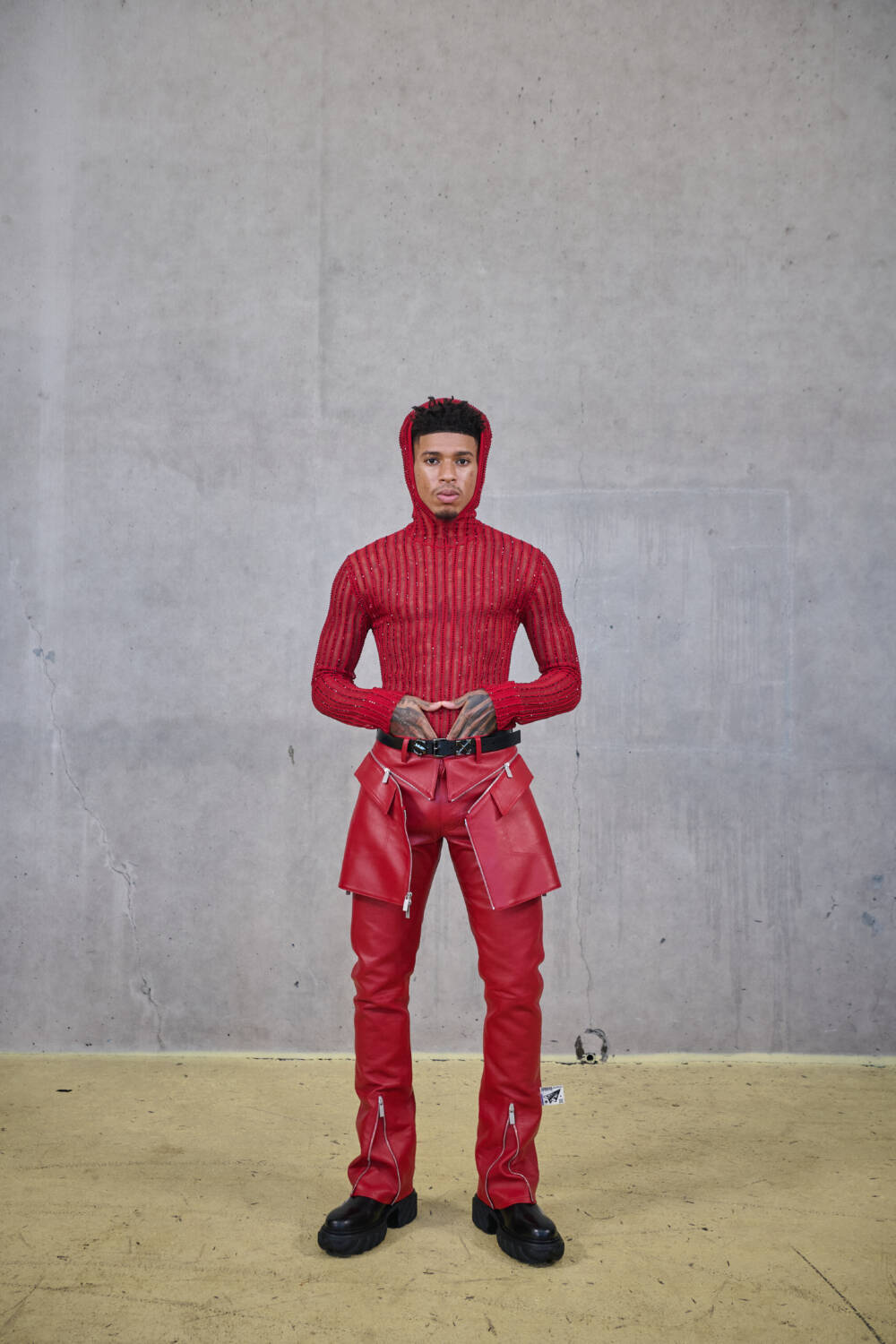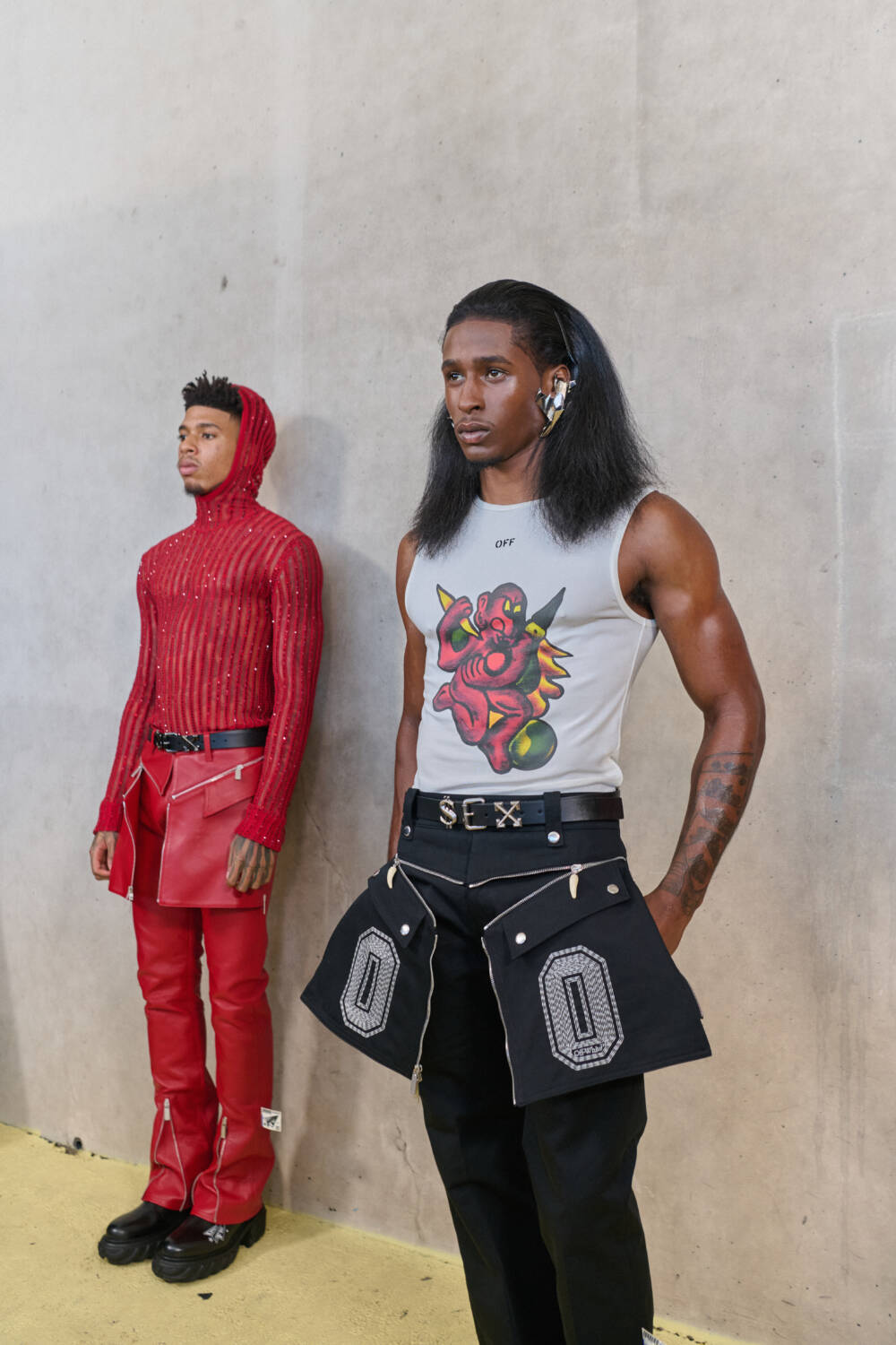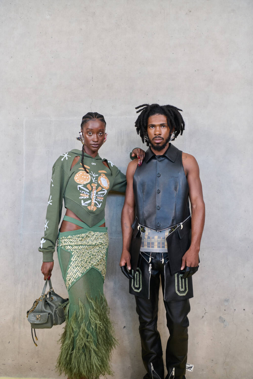 Standout looks included ultra-thin, rhinestone-ribbed hoodies, bead-embellished vests and star-shaped skirts, all in an African colour palette. Many of the looks were worn with ‘sex’ belts, while distorted or shredded denim and leather heavy with zippers were a key feature throughout. Utilitarian lines were sharp and architectural across men’s and womenswear, with a prevailing sense of athletic Afro-futurism in every look. Shoulders were padded, transparencies were seductive, and prints included camouflage and orange plaid while a new ‘arrows’ motif and hand-painted graphics were created by Ghanaian contemporary artist Nana Danso.