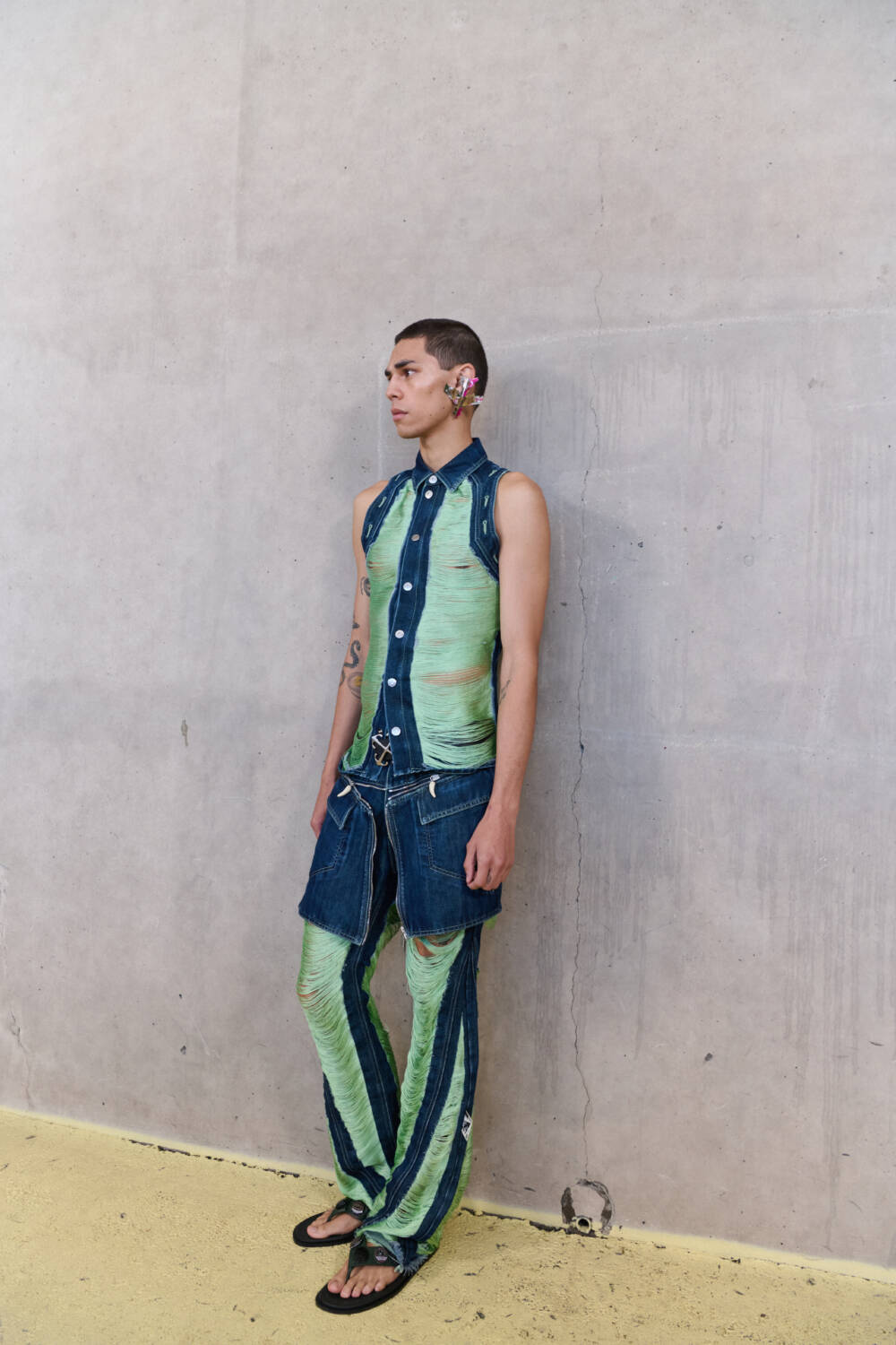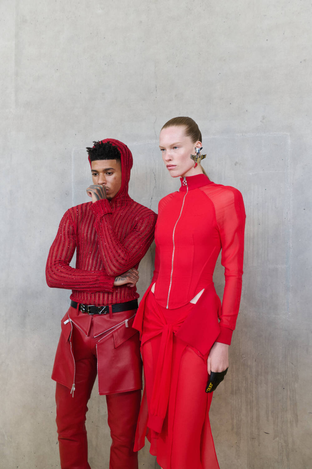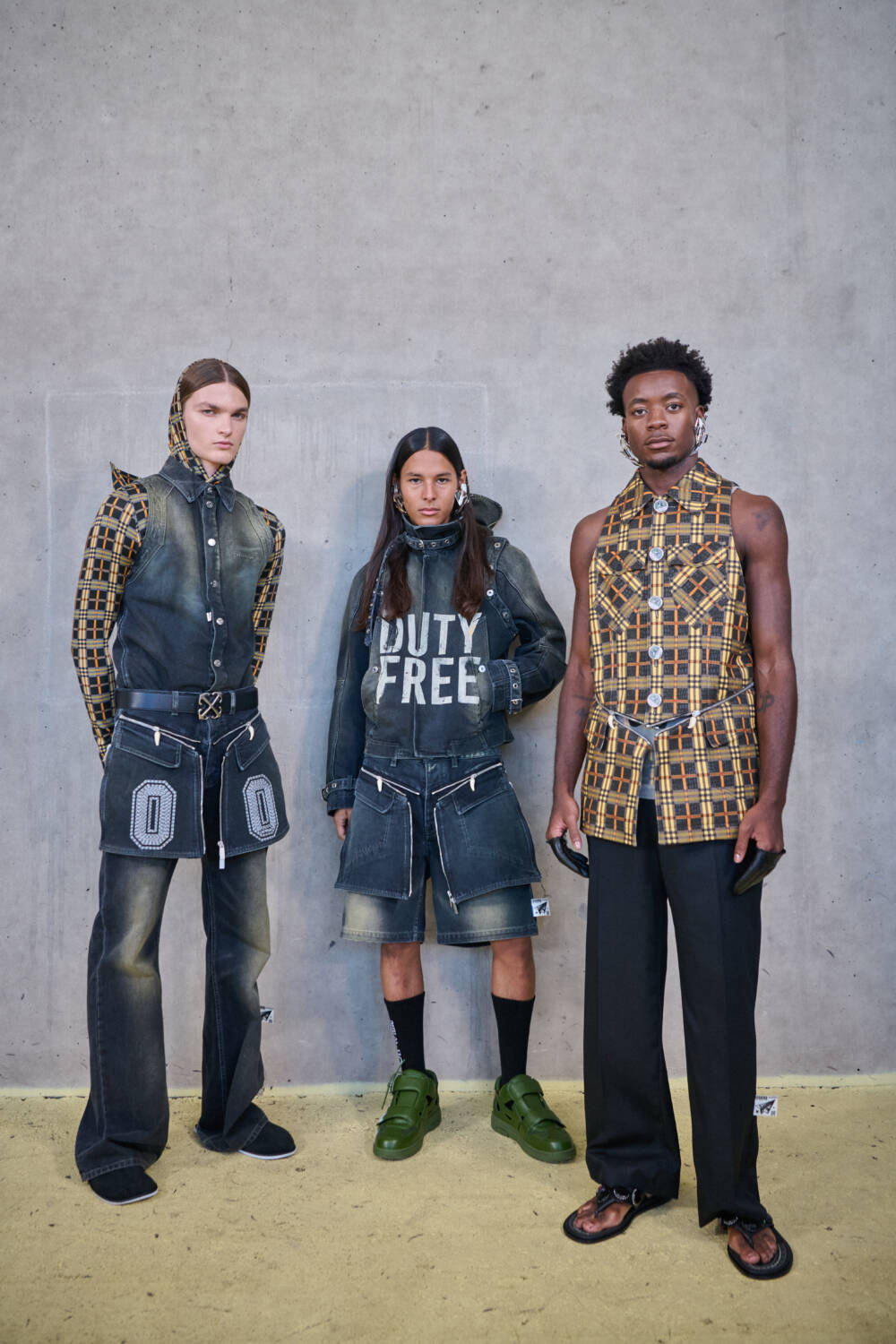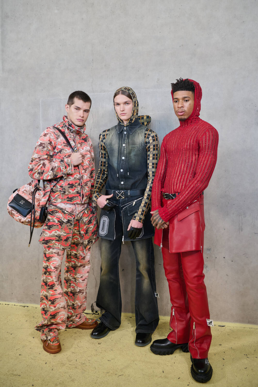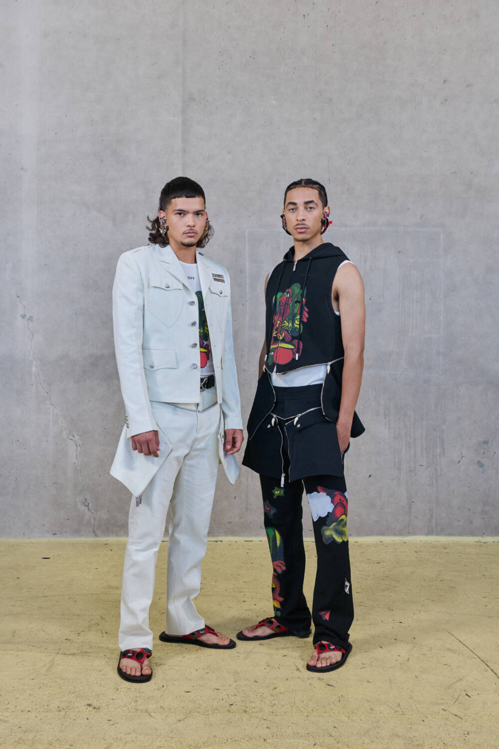 Standout looks included ultra-thin, rhinestone-ribbed hoodies, bead-embellished vests and star-shaped skirts, all in an African colour palette. Many of the looks were worn with ‘sex’ belts, while distorted or shredded denim and leather heavy with zippers were a key feature throughout. Utilitarian lines were sharp and architectural across men’s and womenswear, with a prevailing sense of athletic Afro-futurism in every look. Shoulders were padded, transparencies were seductive, and prints included camouflage and orange plaid while a new ‘arrows’ motif and hand-painted graphics were created by Ghanaian contemporary artist Nana Danso.