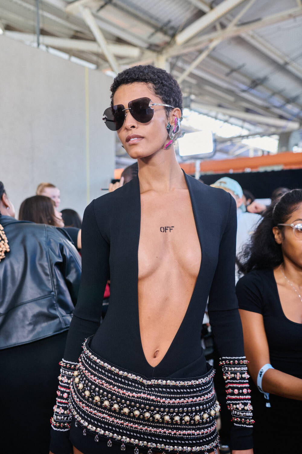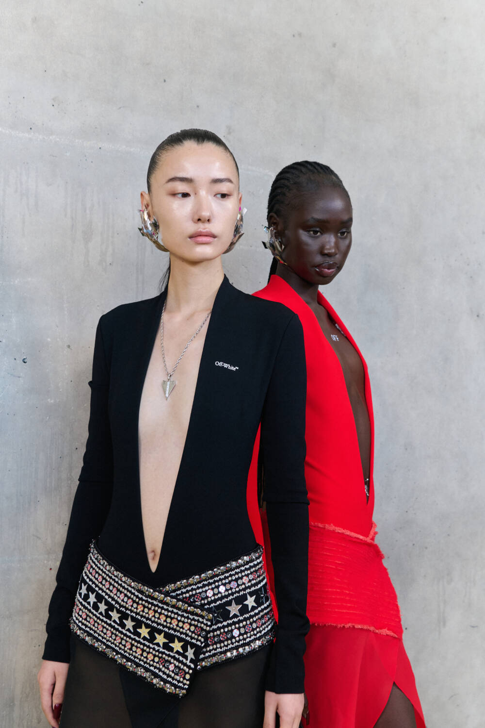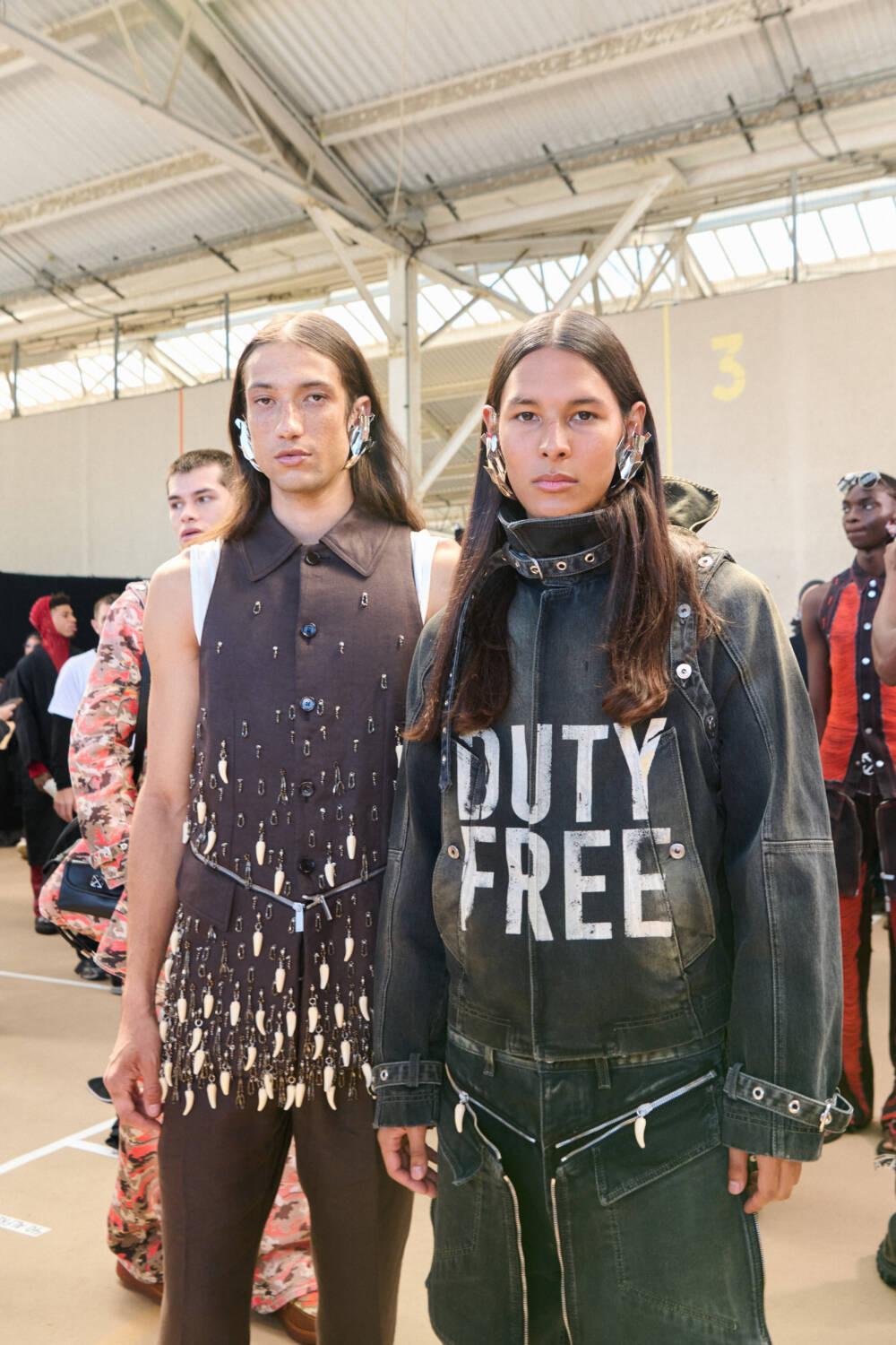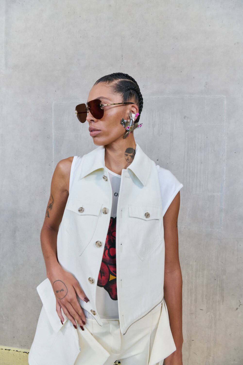 Standout looks included ultra-thin, rhinestone-ribbed hoodies, bead-embellished vests and star-shaped skirts, all in an African colour palette. Many of the looks were worn with ‘sex’ belts, while distorted or shredded denim and leather heavy with zippers were a key feature throughout. Utilitarian lines were sharp and architectural across men’s and womenswear, with a prevailing sense of athletic Afro-futurism in every look. Shoulders were padded, transparencies were seductive, and prints included camouflage and orange plaid while a new ‘arrows’ motif and hand-painted graphics were created by Ghanaian contemporary artist Nana Danso.