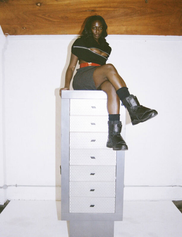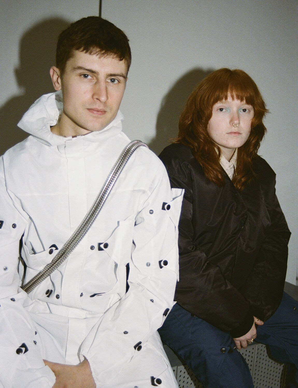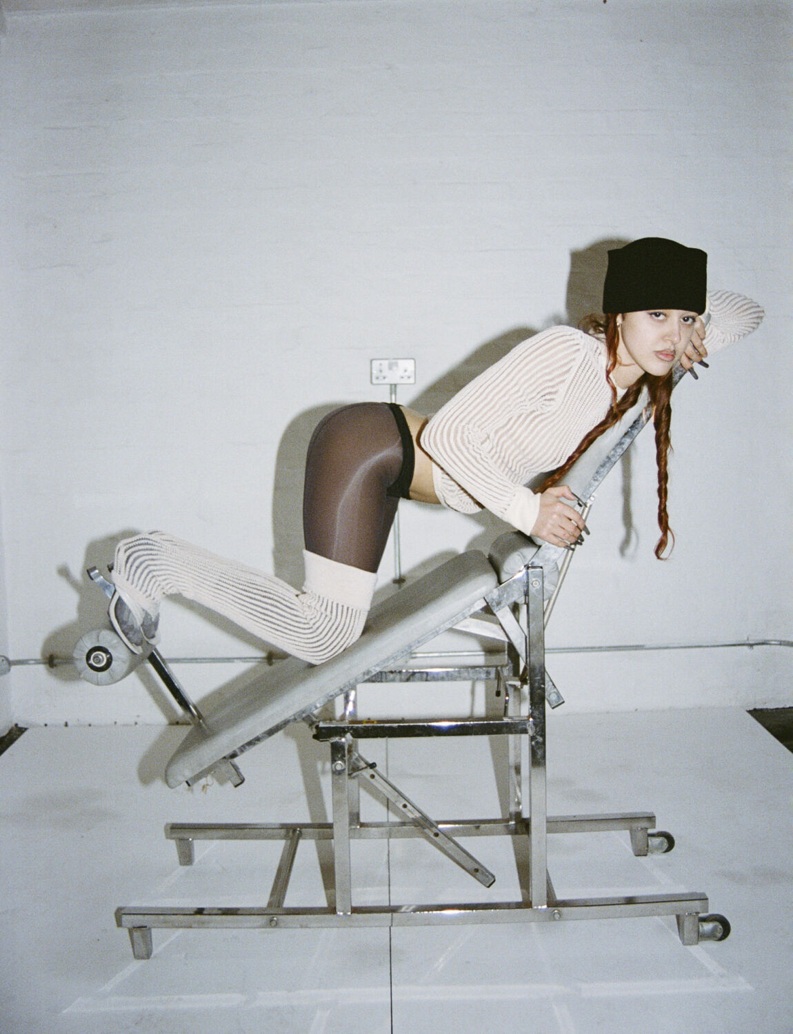 “I’ve always been obsessed with uniforms. I find endless inspiration from them,” says Shinder, who calls me from his studio. He’s well versed in peppering all things butch with a fetishistic garnish. Think the sort of garb you wear in a lab (aprons, hazmat suits) repositioned as flesh-coloured latex girdles and buttoned-up tracksuits, or high-vis jackets that could taking you from the building site to the bedroom.