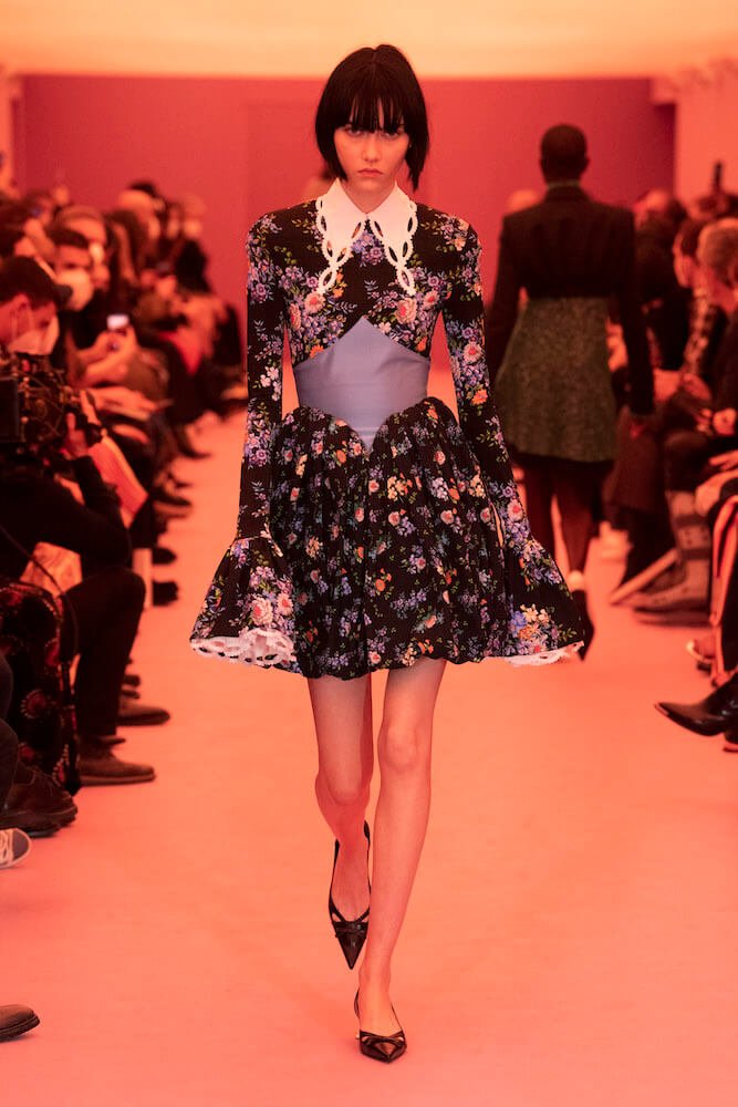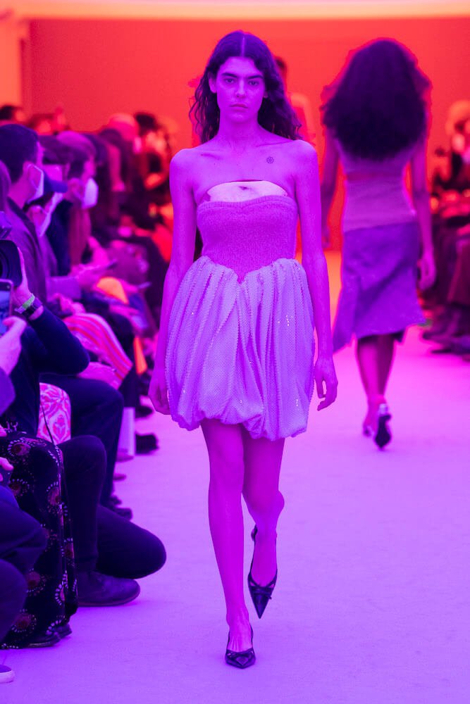 Julien Dossena’s Paco Rabanne AW22 show was a big splash of 1980s fashion. An explosion of classic Paco Rabanne – chainmail, pleats and ruffles – were futuristic and steeped in romance. Add a dose of sensory overload thanks to a light-changing set and we were left wondering, ‘Are we in the Virgin Atlantic upper class or in an optic therapy room?’