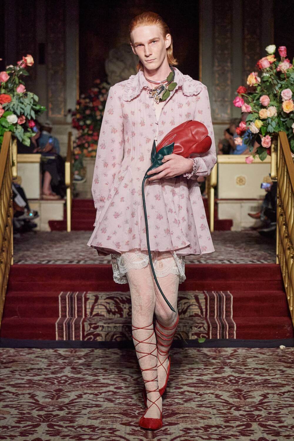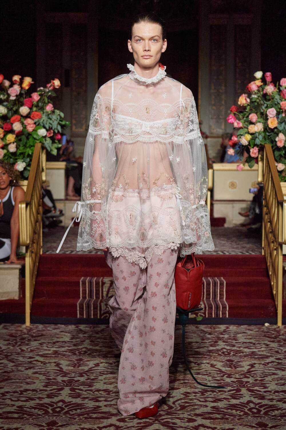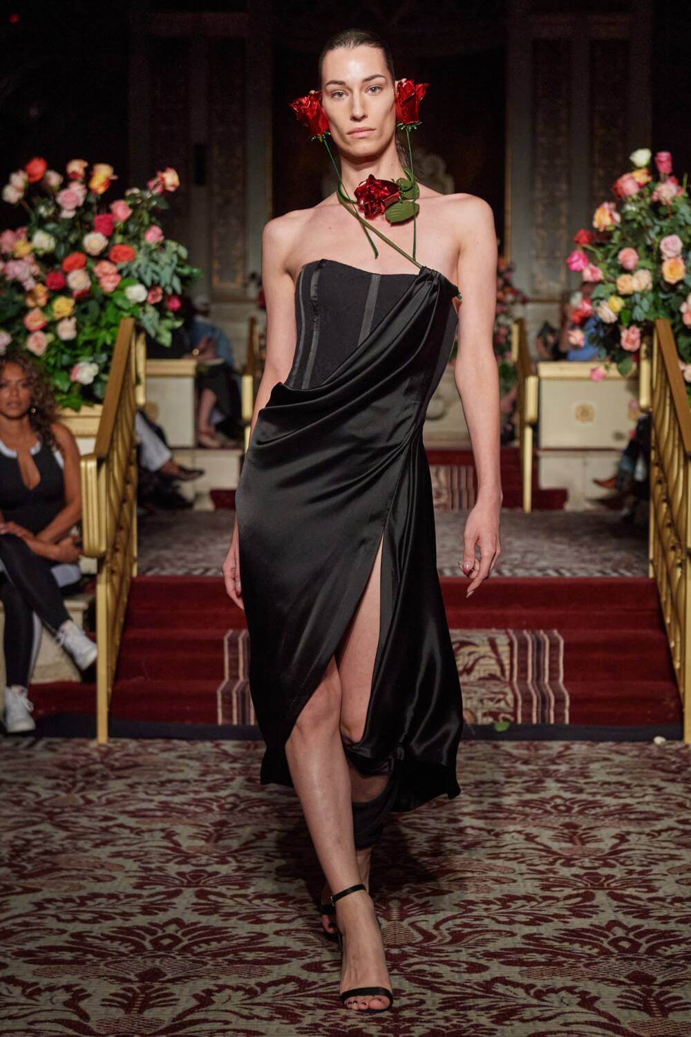 Laced into almost every look, the romantic flora danced up dressed and skirts with a sort of sentience. Whether embroidered with sequins on garments inspired by vintage lingerie, strung to a black choker necklace, laser printed onto elegant lacy twinsets and corsetry or generously ruched and clustered together to form a flamenco-esc mini dress. Those roses were red-hot, but the blossoms of pink that popped up were sweet enough to be the frosting on a wedding cake.