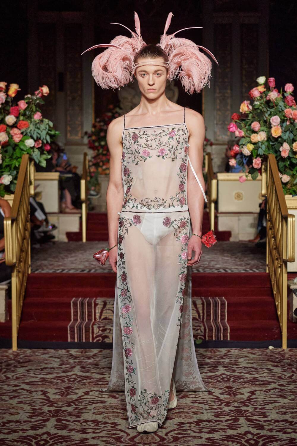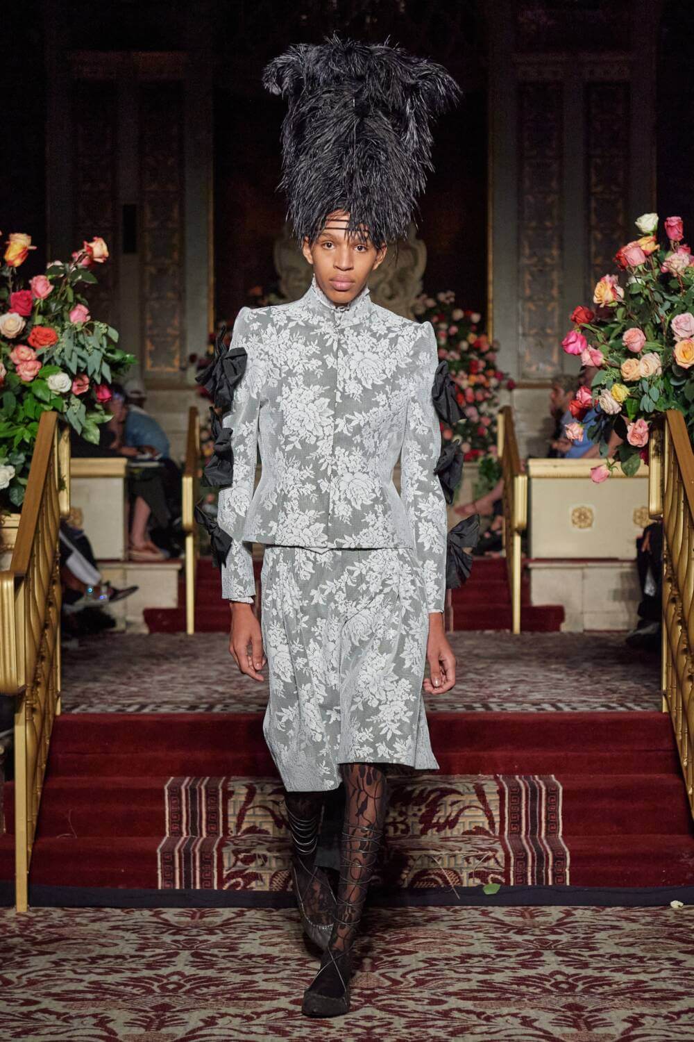 The show, which took place at The Plaza, in Manhattan, was also abound with feathery plumes – most of which arrived in Marie Antoinette style as decadent headdresses under the hotel’s chandeliers. Similarly, tufts of ostrich feathers wrapped around necks and waists as scarves and modern cummerbunds respectively.