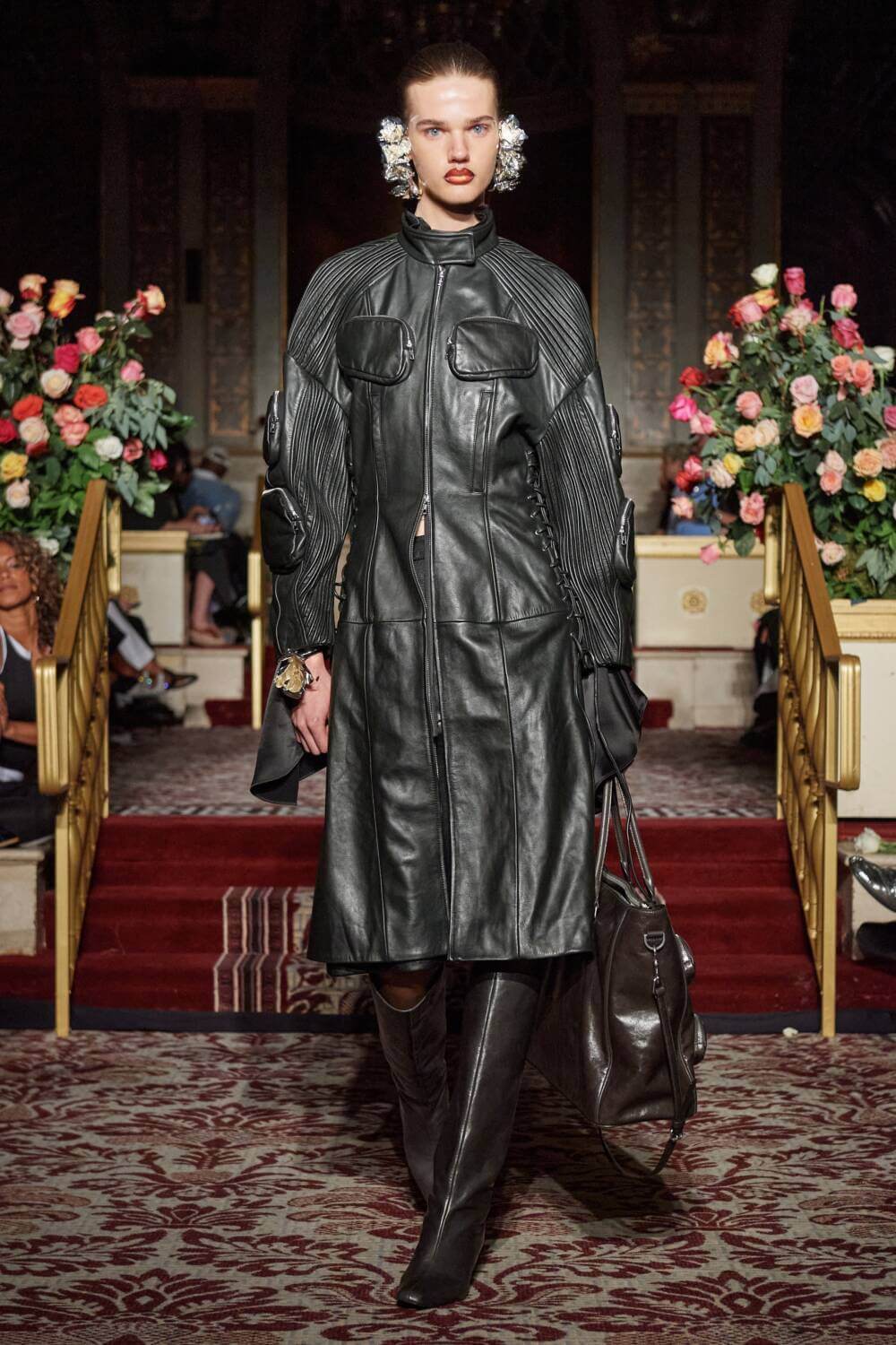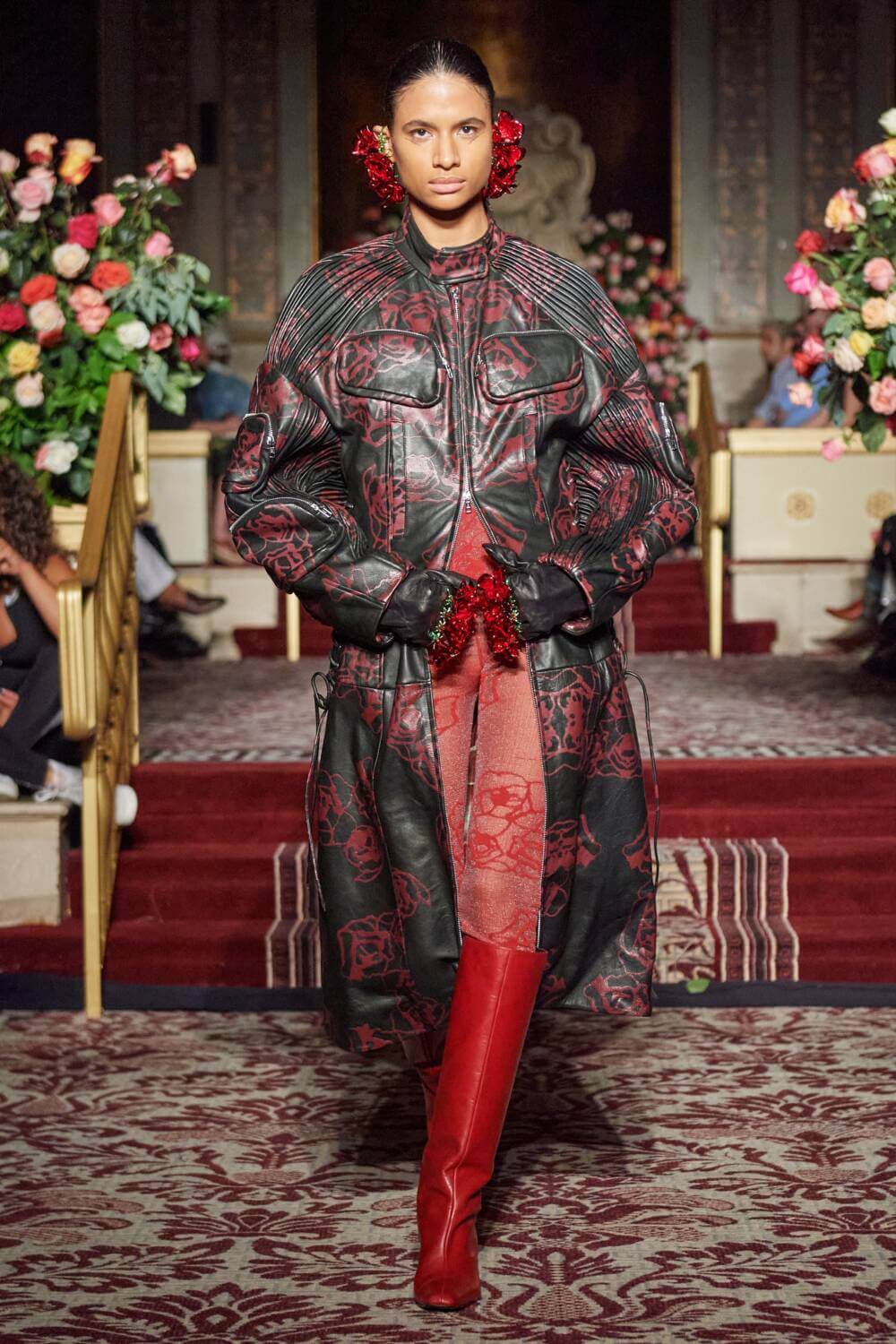 Special to the collection was a surprise team-up with Bimba Y Lola which also holds strong roots in Spain. It seems that every food craze nowadays focuses on turning plants into meat, but what about turning ‘meat’ into plants? Bimba Y Lola answered that curious question with its brown leather rose-shaped bag created in collaboration with Gómez Palomo, that twined from wrist to elbow with green leather vines and leaves, and contributed its expert leatherwork to massive motto-trench dresses and jackets.