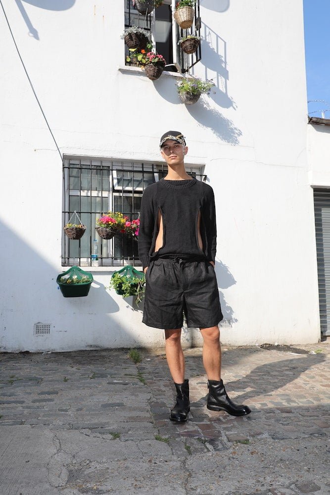 The deeply personal set of looks sees the designer revisit beloved silhouettes from previous collections – acid-washed t-shirts that swoop low below the groin or knits that are sliced up the torso – as well more innovative takes on classic denim wear. Swollen tracksuits with chunky waistbands are spliced with denim panels from the thigh down and the designer even had a go at crafting a denim single-breasted blazer. This season also saw Götesson produce his first logo t-shirt, featuring the rope tattoo that can be found on his left forearm, repurposed as a badge of honour.