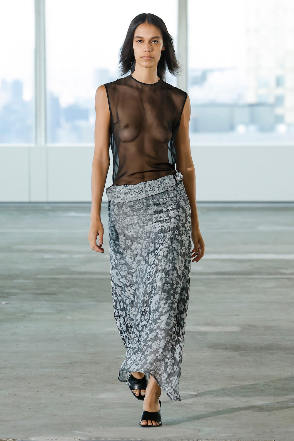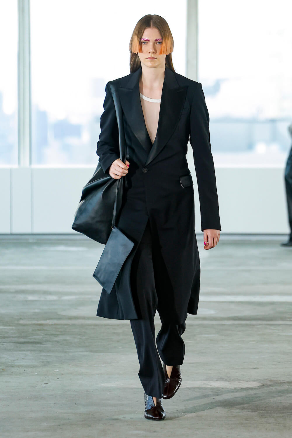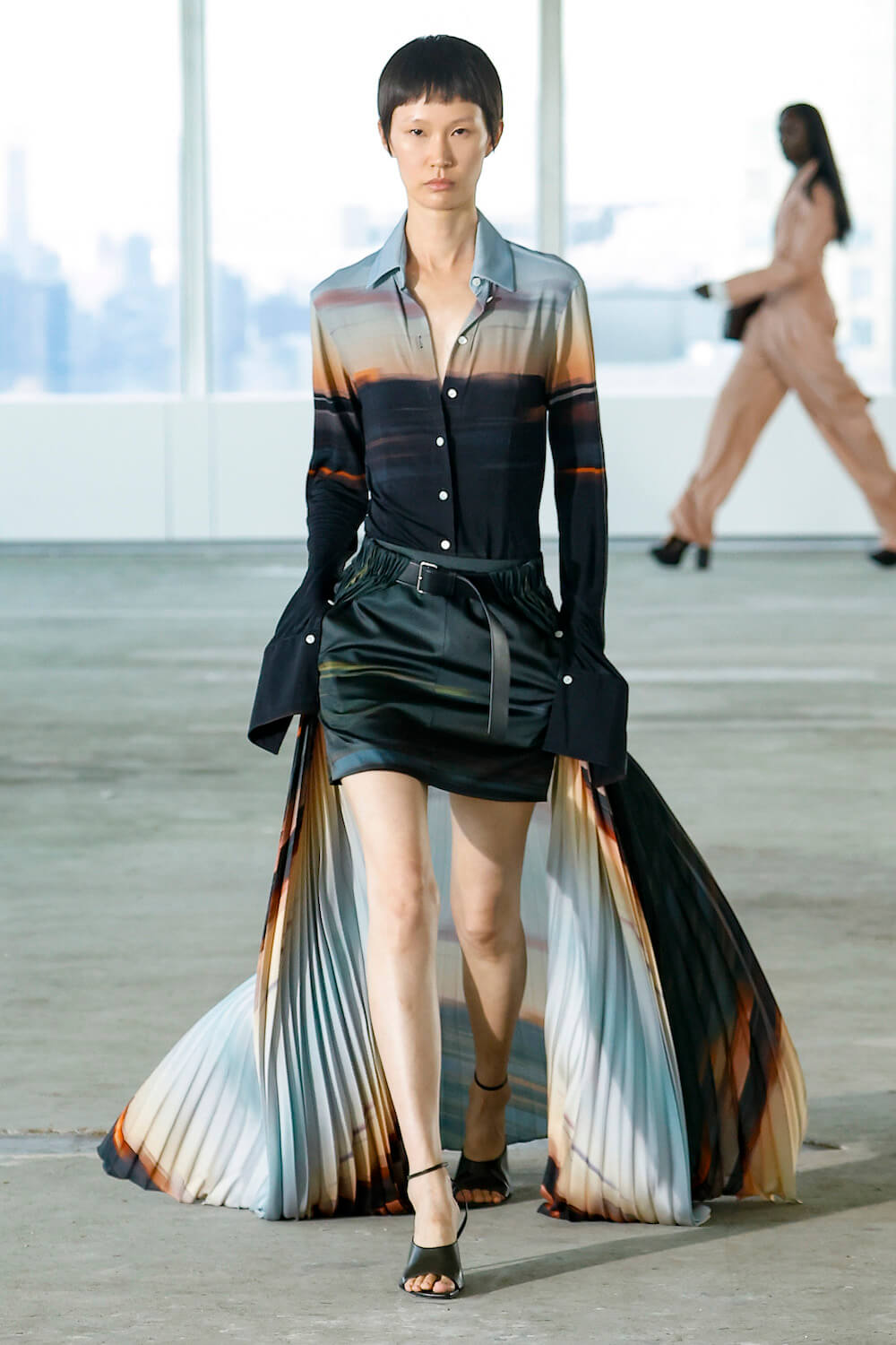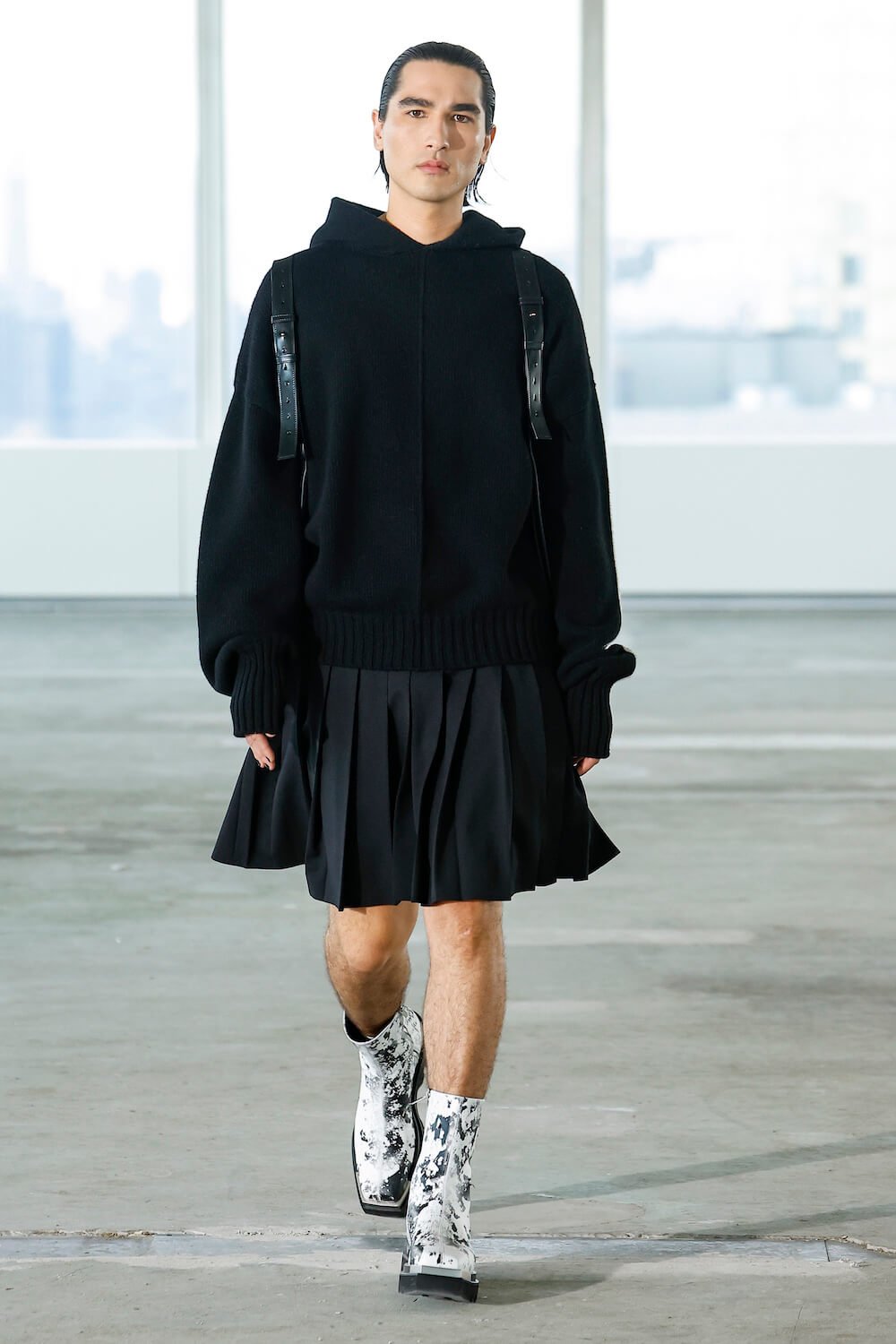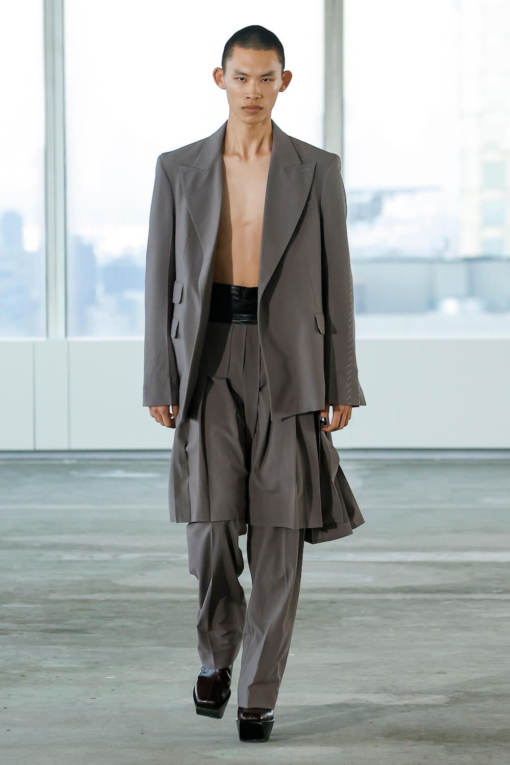 The two-or three-in-one versatility that’s always played an imperative role in defining Do’s unambiguous aesthetic also arrived, delivered in the form of knits with button-up sleeves that doubled as ponchos when undone and pleated skirts attached to belts that could be opened and closed like highfalutin curtains. What was especially enthralling was how, in an effort key to achieving climate consciousness, a vest and trousers in a patent leather-like material were actually made out of discarded shrimp exoskeletons – we hope you like shellfish! For him, for her, for them, for Mother Earth – Peter Do is boundless.