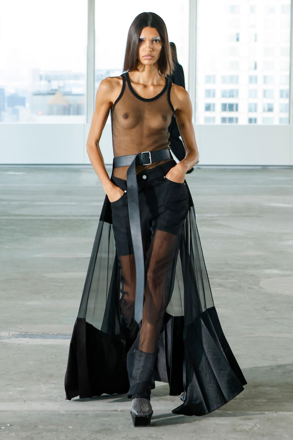As the 60-looks-strong show unfolded, Do managed to maintain a minimalistic treatment whilst also bringing dramatic, exaggerated silhouettes and extremely androgynous sartorial audacity to the table; crisp woollen tailoring formed a gigantic black blazer with white contrast stitching; billowing deconstructed trousers had sharp slits revealling their inner workings extending from the high-thigh all the way to the ankle; visible nipples peaked out from underneath liquid mesh tanks and trousers; swollen shirts and double breasted blazers boasted large triangular cutouts on the upper back, exposing a flash of chiselled muscles and turning heads as Do’s troupe passed by.