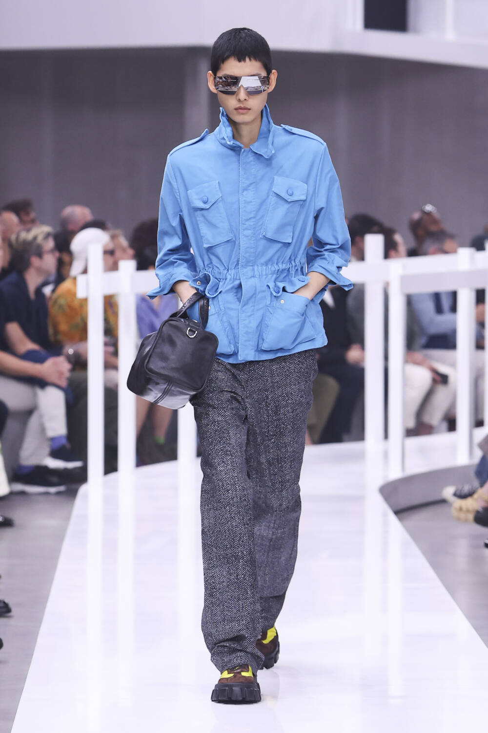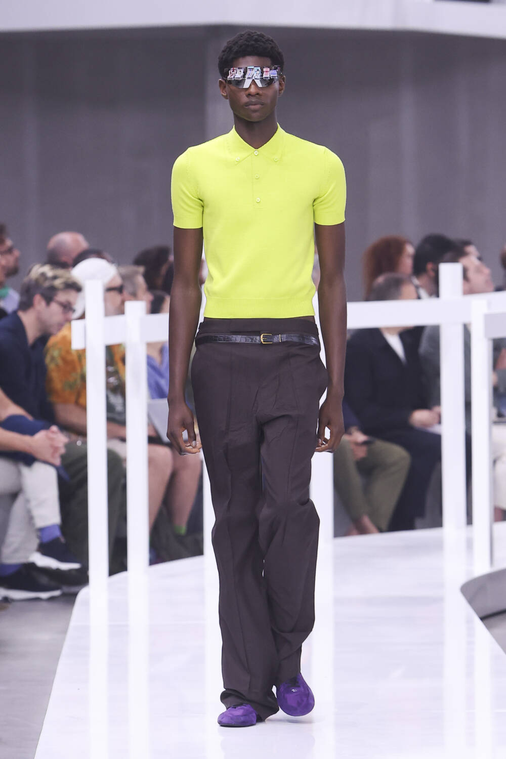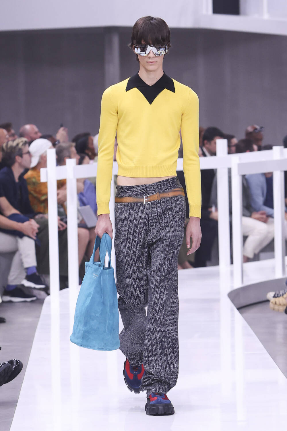 The cavernous showspace inside Fondazione Prada, with its vast concrete walls, looks like it could house a rave of spectacular proportions. Though this season, Miuccia Prada and Raf Simons had their sights on a more intimate get-together. A white shack resembling that of a house party watched over the winding catwalk, as the basslines of Faithless’s ‘Insomnia’ thumped from within. Describing it as their own “fairytale ravescape”, in their show notes, the pair spoke of the “the human urge for proximity, to share space and commune”. Many pieces on display warranted you to lean in closer to get a proper look at their construction. Like what appeared to be shirts worn under jumpers that were actually singular primary coloured knits. Or baggy, bootcut slacks that had belts built into their dropped waistlines.