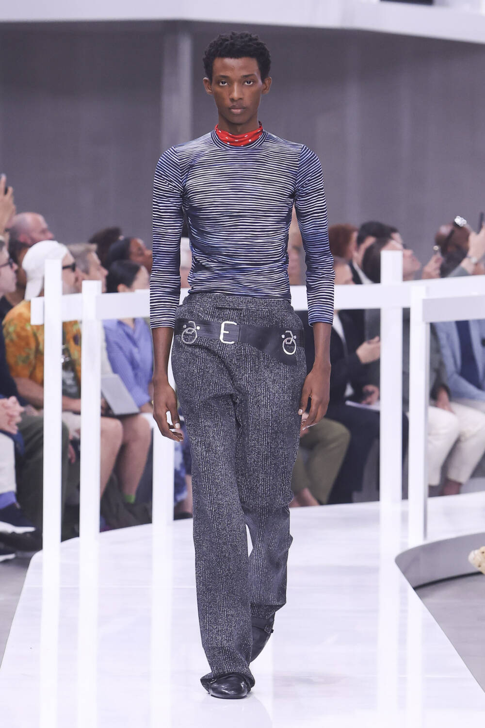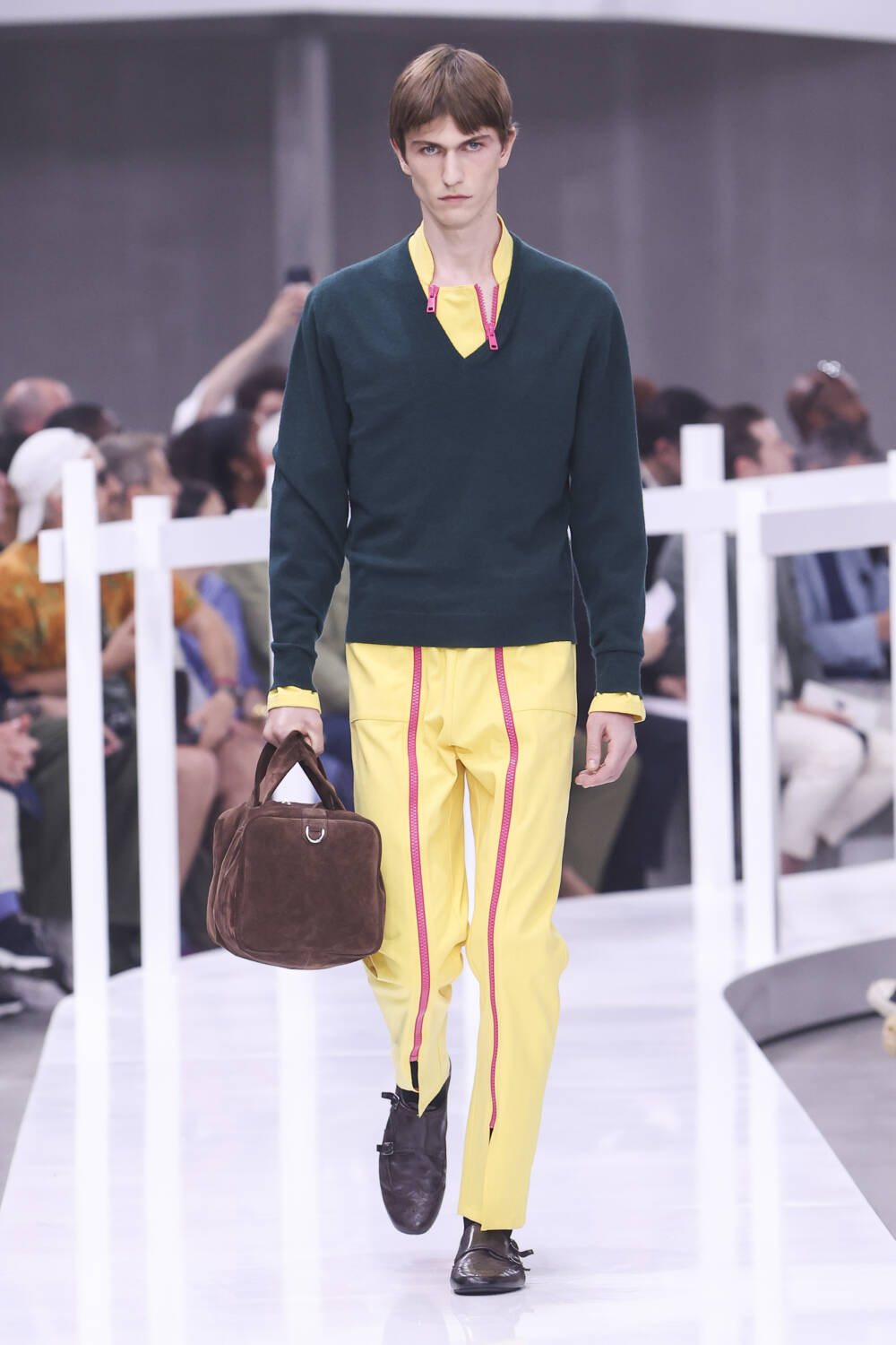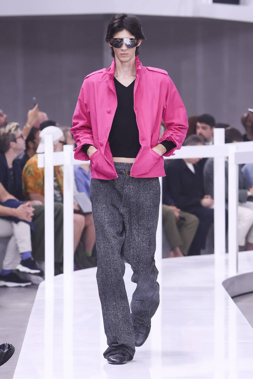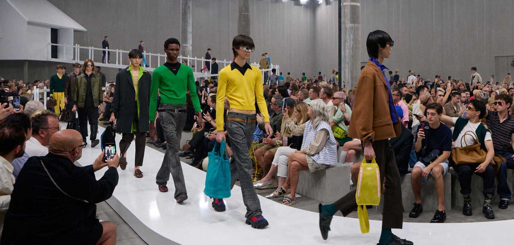 The cavernous showspace inside Fondazione Prada, with its vast concrete walls, looks like it could house a rave of spectacular proportions. Though this season, Miuccia Prada and Raf Simons had their sights on a more intimate get-together. A white shack resembling that of a house party watched over the winding catwalk, as the basslines of Faithless’s ‘Insomnia’ thumped from within. Describing it as their own “fairytale ravescape”, in their show notes, the pair spoke of the “the human urge for proximity, to share space and commune”. Many pieces on display warranted you to lean in closer to get a proper look at their construction. Like what appeared to be shirts worn under jumpers that were actually singular primary coloured knits. Or baggy, bootcut slacks that had belts built into their dropped waistlines.