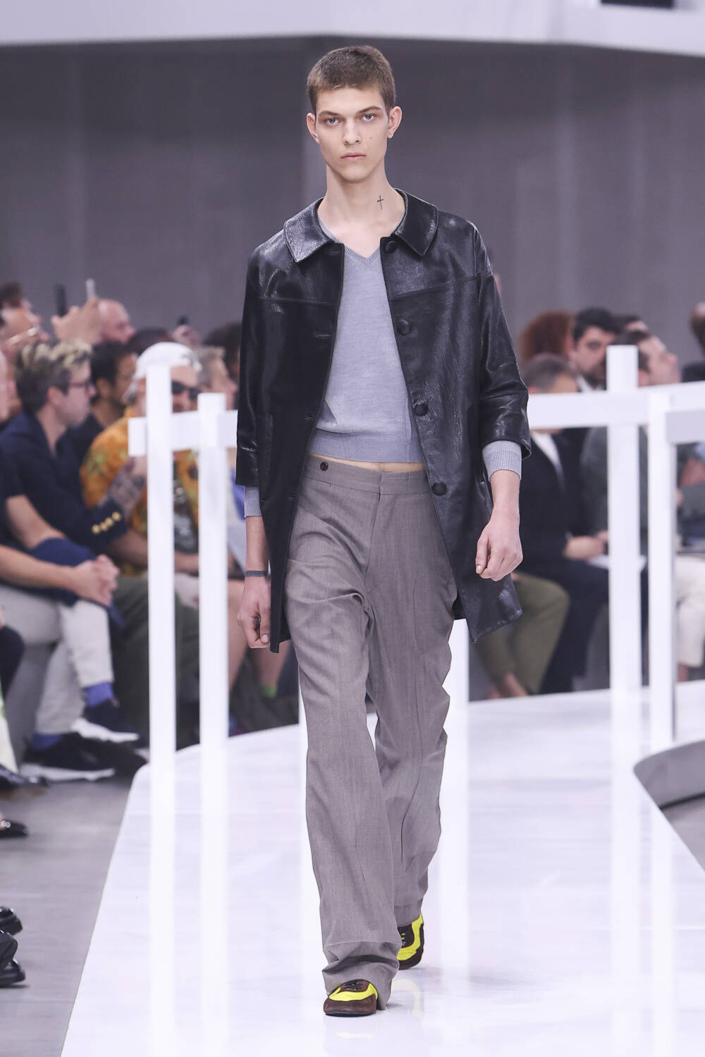 Backstage, the design duo spoke of a “youthful optimism” that was laced throughout the collection, leaning into a spontaneous approach to dressing. Shrunken V-neck knits, creased suiting and womanly pea coats crumpled and squished in delightfully awkward formations looked as if the Prada boy had rummaged through his parents’ wardrobe before heading to the party. “We wanted to create clothes that have lived a life, that are alive in themselves,” said the pair.
