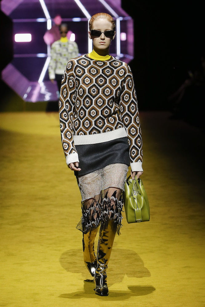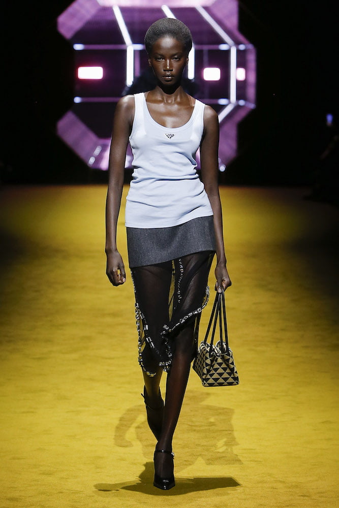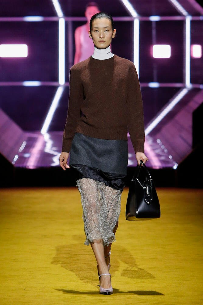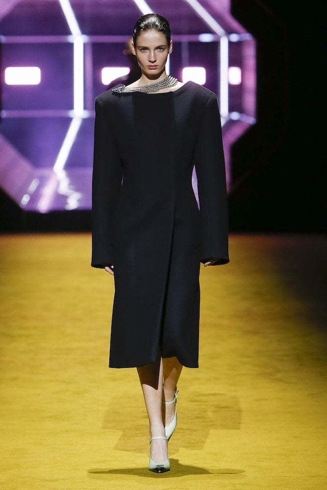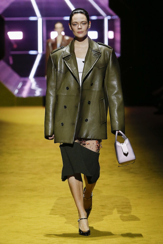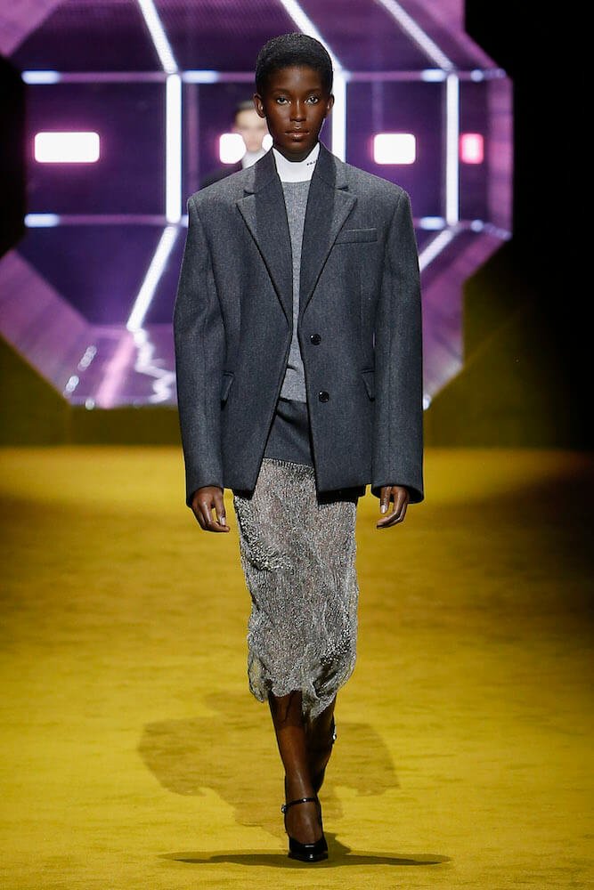 There were plenty of favourite Prada styling tricks, too – including oversized blazers worn with delicate sheer skirts. Utilitarian and fancy pieces also kept close company with layered dresses starting as simple white vests before descending into bands of silk, heavy wool and peekaboo-sheer strips embellished with crunchy sequins. The joy of odd combinations has always been a Prada calling card, as Simons puts it: “There are never direct recreations, but there is a reflection of something you know, a language of Prada.” Well said.