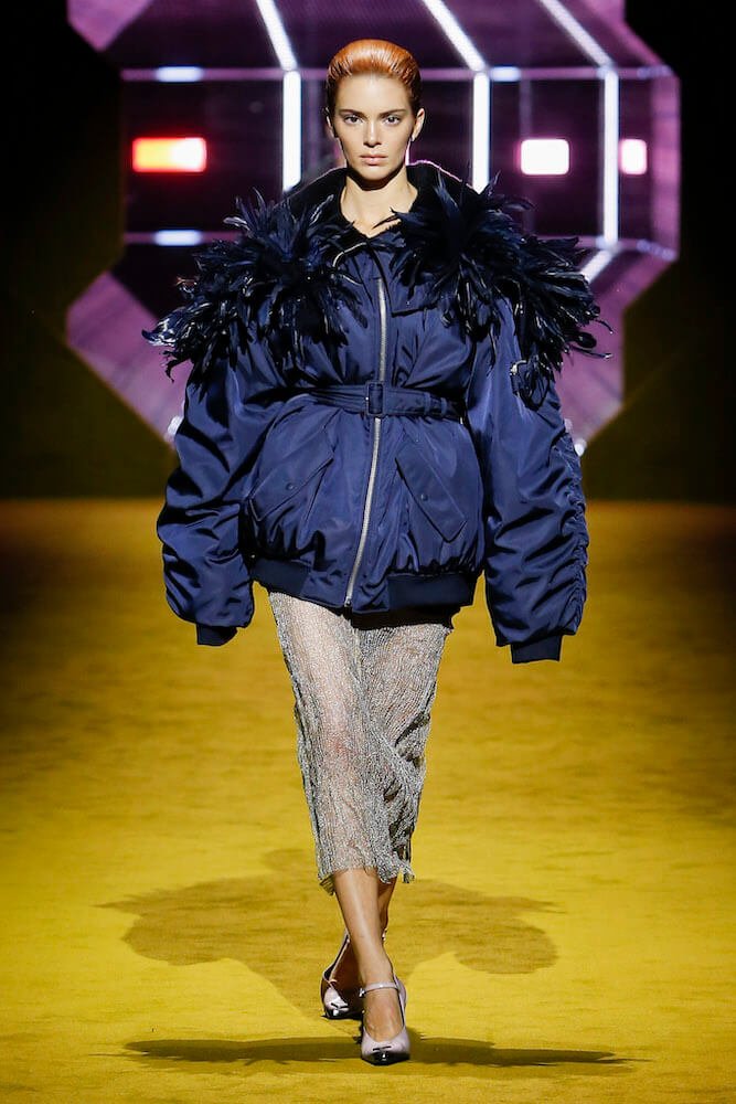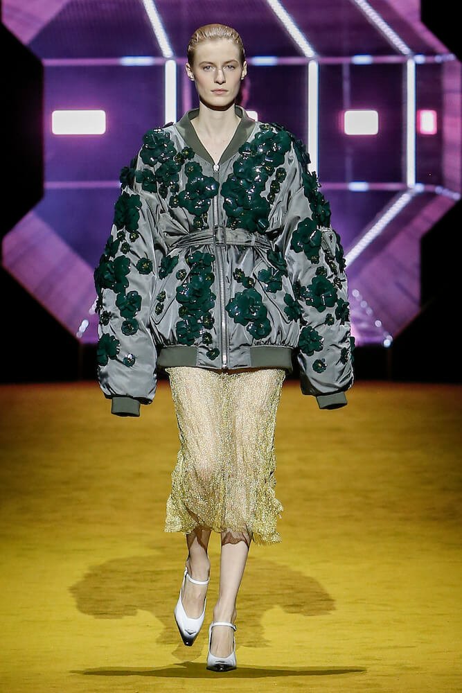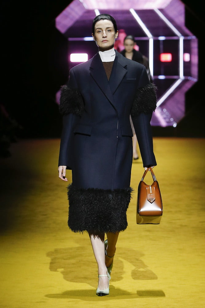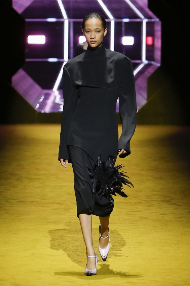 Embellishment (which the notes described as “an eccentricity of surface”) and serious silhouette combined for a tour de force collection that touched on many Prada-isms. Masculine and feminine worked together – often in the same look. Boyfriend knits were worn with feminine skirts, oversized flight jackets were encrusted with exuberant decoration and city coats burst at the hem or elbow with feathers, or were cut away at the neck to create elegant picture necklines.