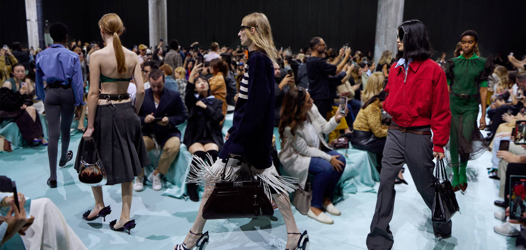 Call it cultural chaos theory, or a high fashion-era shuffle, but Prada’s SS25 show had it all. A deliberately bonkers mix of heavy duty S&M leathers jangling with rings, pussy bow blouses, cowgirl fringing, space age silhouettes and bourgeois sixties tweeds trimmed with fur – all vied for attention.