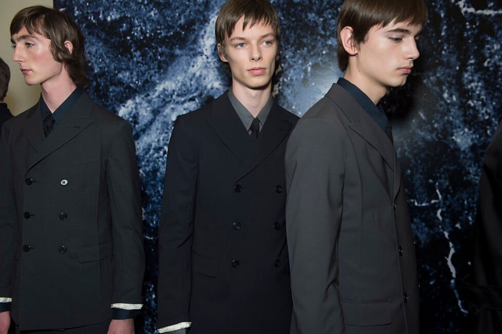 Uniform: a distinctive set of clothing intended to identify the members of a specific group. The Prada show was, it must be said, very evocative of the idea of uniform. Not in the school- or work-uniform sense, but more in the uniformity sense. This was stark. A collection of separates in black nylon, something hinted at with the invitations: black nylon squares. Think of this as a return to more traditional tailoring. Classically cut coats and jackets worn with tailored trousers in sombre shades. The only lightening of colour coming from the cuffs, rolled up to reveal a flash of white. There was a utilitarianism to this, a functionality further emphasised by the introduction of women to the catwalk, who were essentially dressed in the same coats, the same jackets, as the boys. This isn’t gender-bending in the sense of guys in ladies’ clothes and vice versa. This feels more like a social commentary, a reflection of what is happening in the streets, where the traditional lines of what differentiates a man’s wardrobe from a woman’s wardrobe are being blurred. Where the prevalent mood seems to be more geared towards a functional aesthetic. Or maybe it’s just simply a case of, as Mrs Prada said backstage, “Uniform, severe, elegant – this is the fashion I like at this moment.”