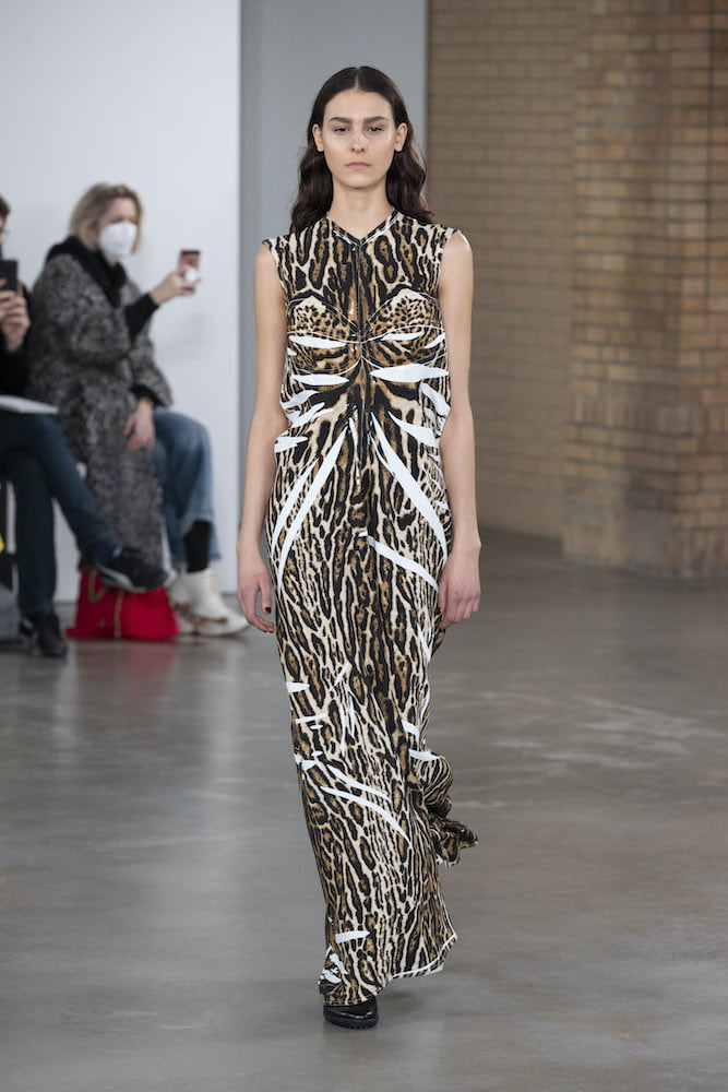 In a quest to find beauty amidst the chaos of day-to-day life, the twosome took to toying with the human form. The brand’s usual understated cuts came narrow at the waist before falling into bias-cut skirts that ballooned into elegant formations at the ankle. “Experimentation and play are key, perhaps now more than ever,” said the pair, meeting their reliance on neutral hues with vivid lilacs, shimmering cornflower blues and a crimson red animal print that glitched as the models walked.