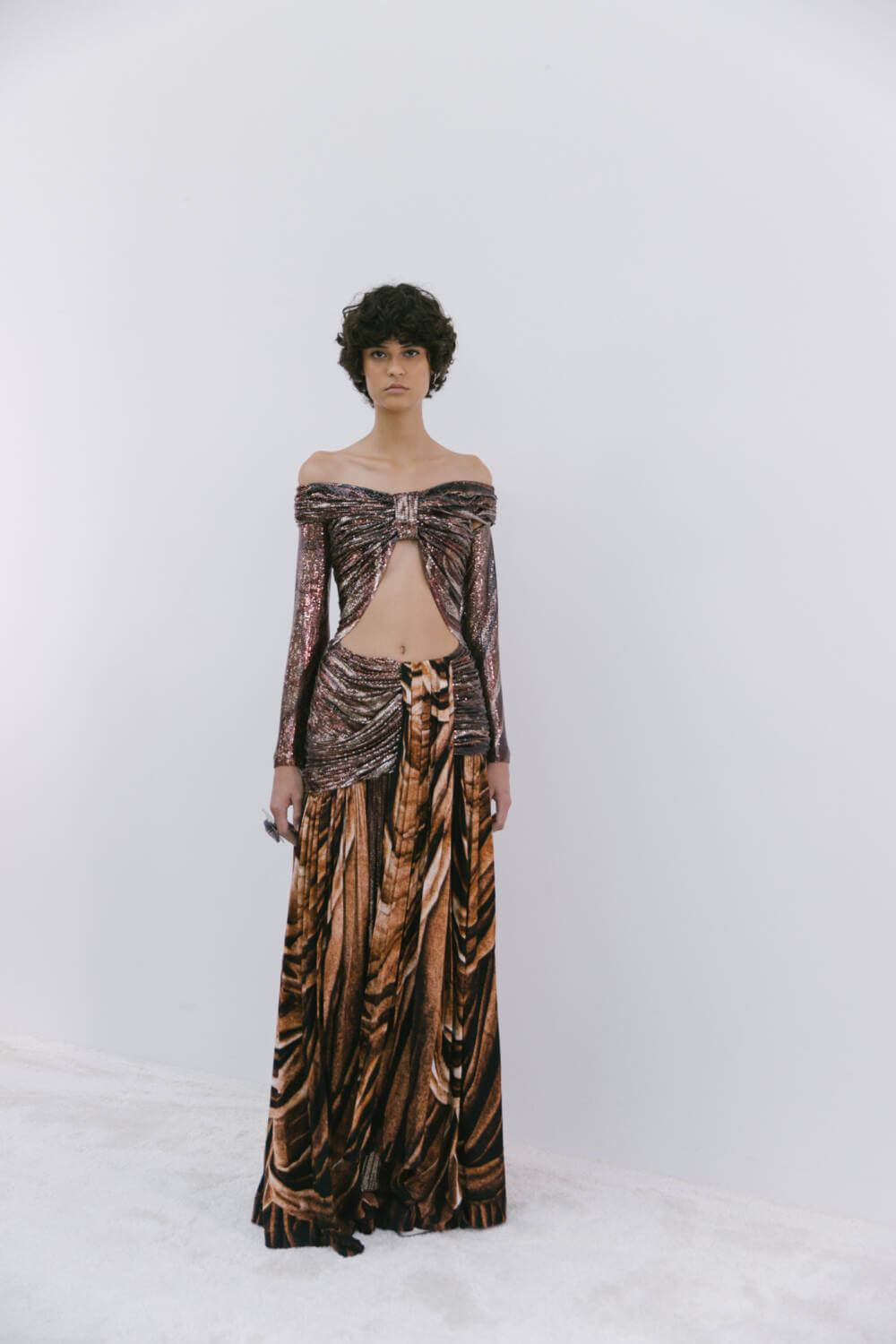 From start to finish, traditional coverings were reinterpreted with gilded adornments as if they were modern relics of distant civilisations. Draped like depictions of antique marble statuary, sarouel pants, folded-over scarf tops and draped skirts and shorts were decked with geometric metallic embroidery, fringe and decadent lacing. Peacock feathers protruded from metal mesh in baronial tones of gold, silver an​​d luminous copper, adding a touch of chimeric mystery to the looks, while heavy chainmail hoods with forehead pendants hung over the heads of some of the suited-and-gladiator-booted girls. Elsewhere bodies were sheathed with belts built from gleaming spheres and worn with sandals decorated with rock crystals reminiscent of mystic goddesses. Models looked statuesque and powerfully feminine.