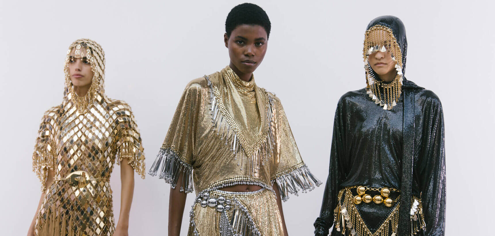 As the swishing sound of liquid metal mesh washed over the room, Julien Dossena unveiled his archeological SS24 Rabanne collection. An erotic, poetic, mediaeval sci-fi fantasy, he called it Origins of the Future
