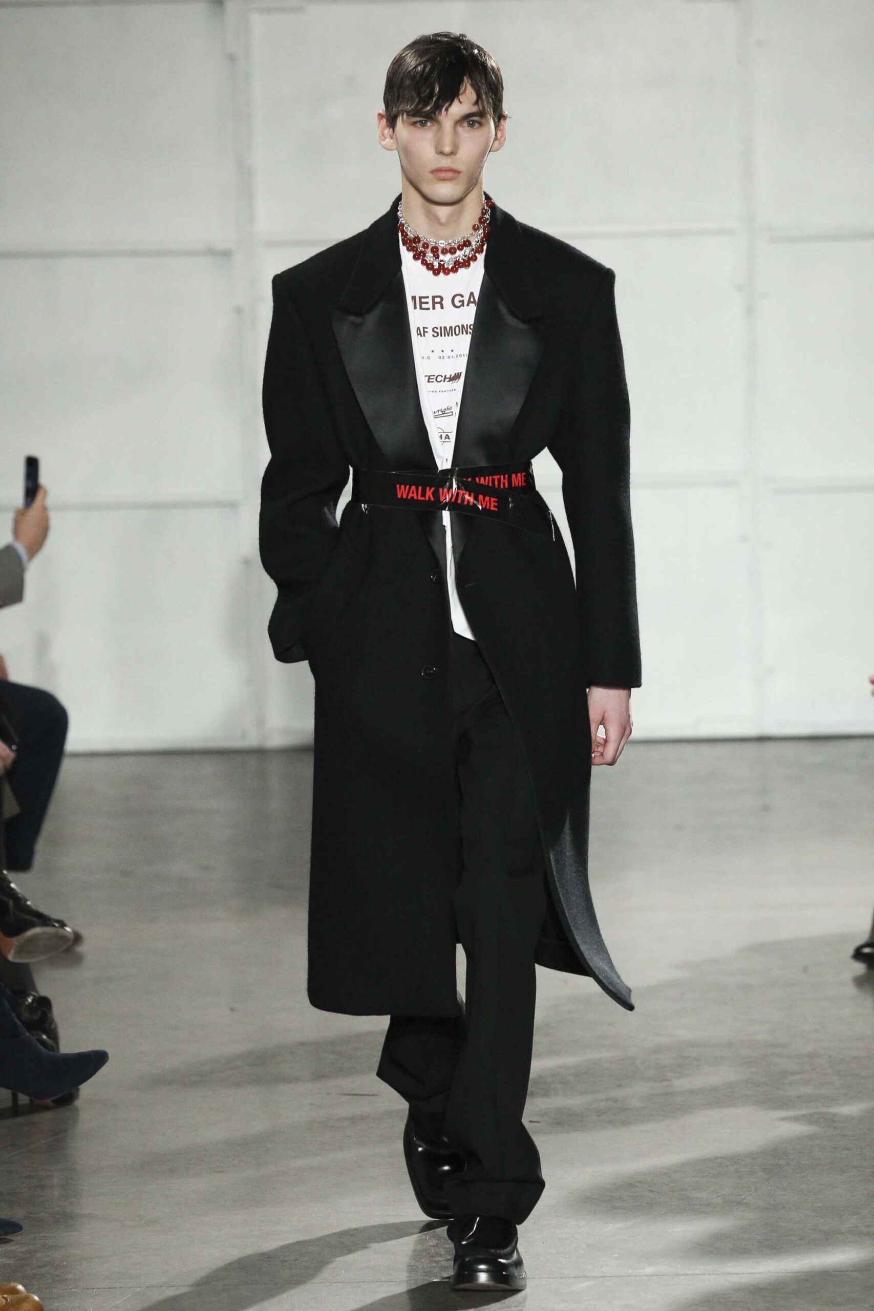 As you probably know, Mr Simons has taken over the Calvin Klein, showing next week. How appropriate, then, that last night he showed his men’s collection in the city of New York. Exploring his new life and new world. The masculine collection was grown up yet not mature. Cropped stretched knits with I HEART NY seemed worn in, adored by its former owners. Maybe from a different time or with a former president. Utilitarian military shirts were oversized, creating a kind of naive army of boys. Mr Simons is never shy to create an architectural silhouette but in New York this college boy of a former season had come of age. He had taken his dads crombie coat and moms Dior beaded necklace and left Paris for good. Coming to America to be a man. And got through that US border before the laws of old ideas changed the world again.
