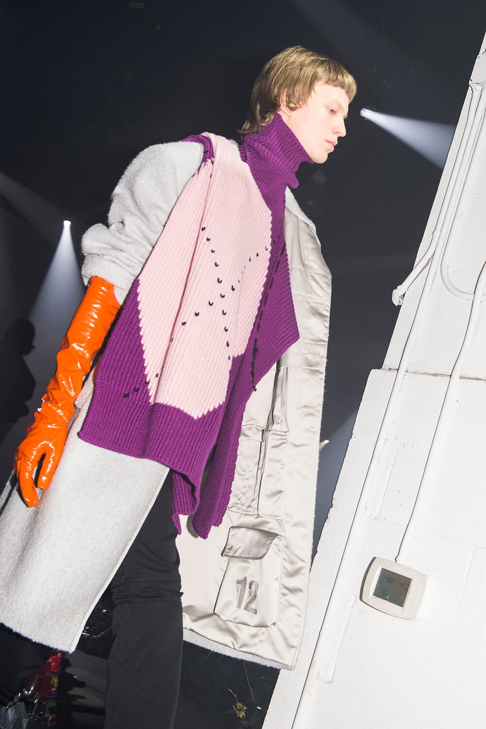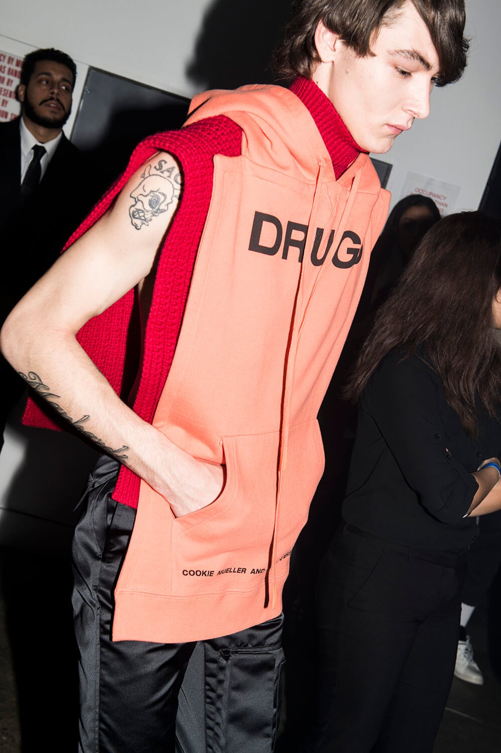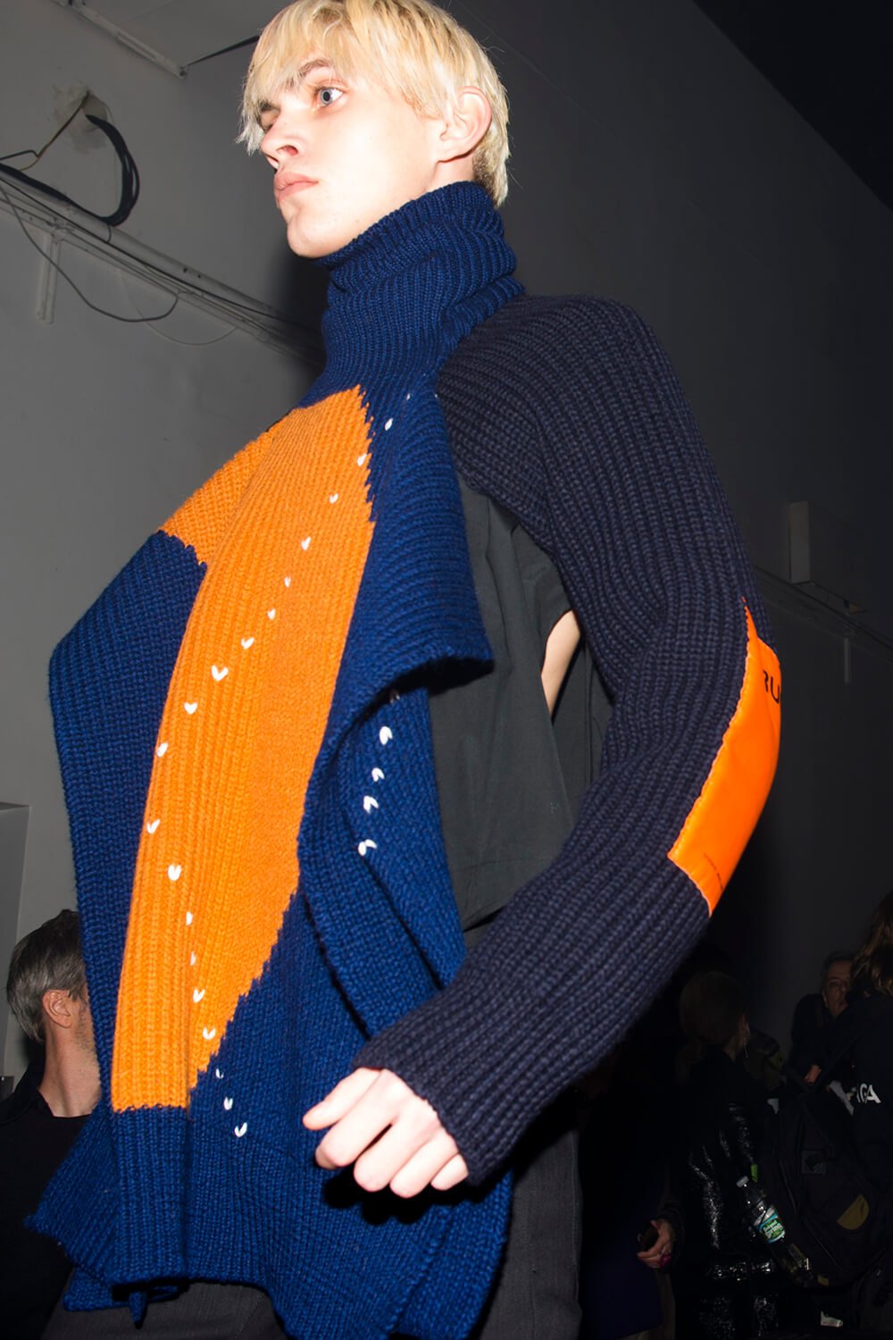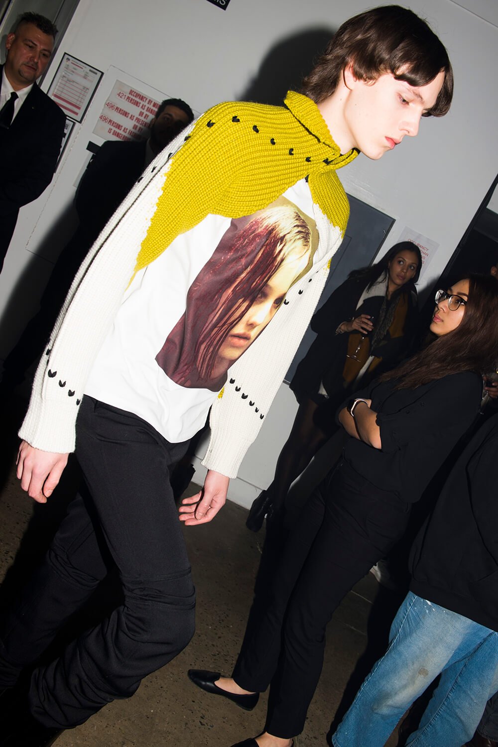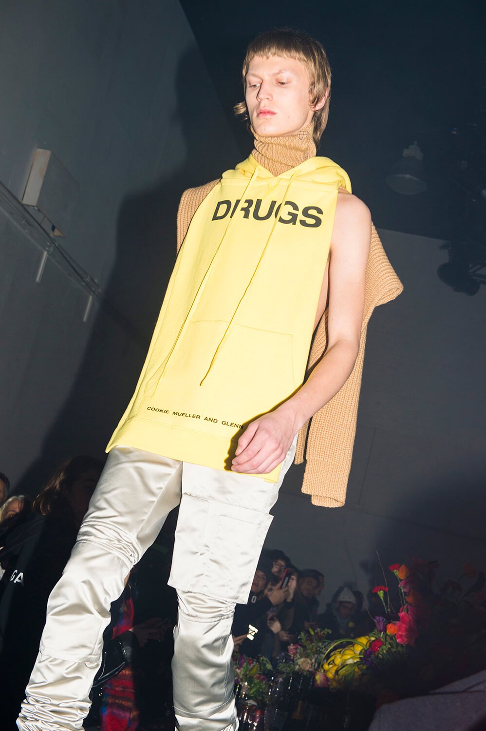 The published play’s cover became the sleeveless tabards in both the book “bad cut” yellow and “prescriptive orange” colours. This was a collection about addiction, drug names – 2C-B, LSD and XTC were printed on to knee patches and scarves. It got more raw. Natja Brunckhorst‘s image from the dark 1981 film ‘Christiane F.’ was printed onto oversized t-shirts. A kind of super future decadent NYC after party debauched feast was the setting as the boys stomped in big boots to the techno kick drum of Emmanuel Top’s ‘Turkish Bazaar’ beating fast.