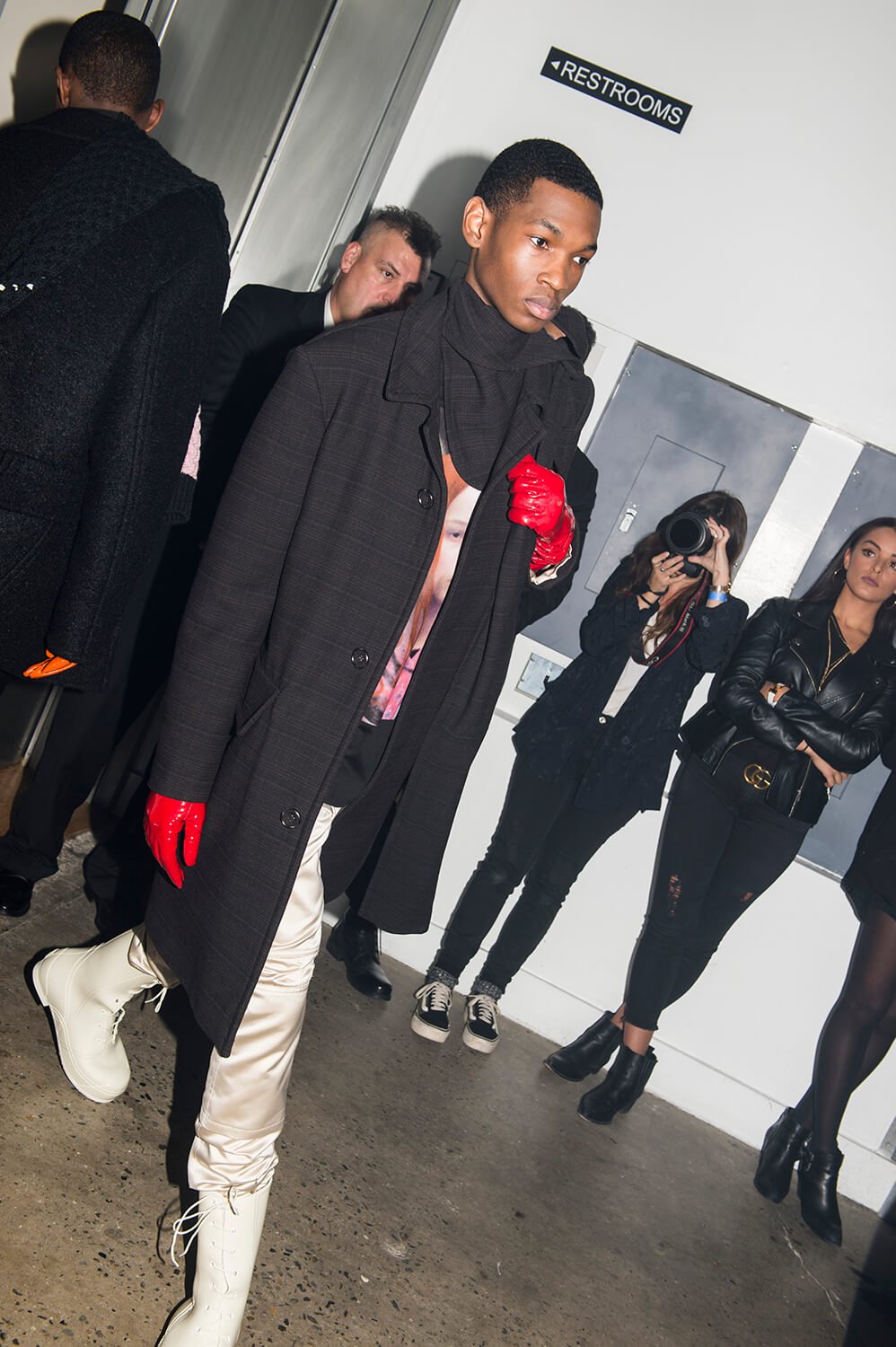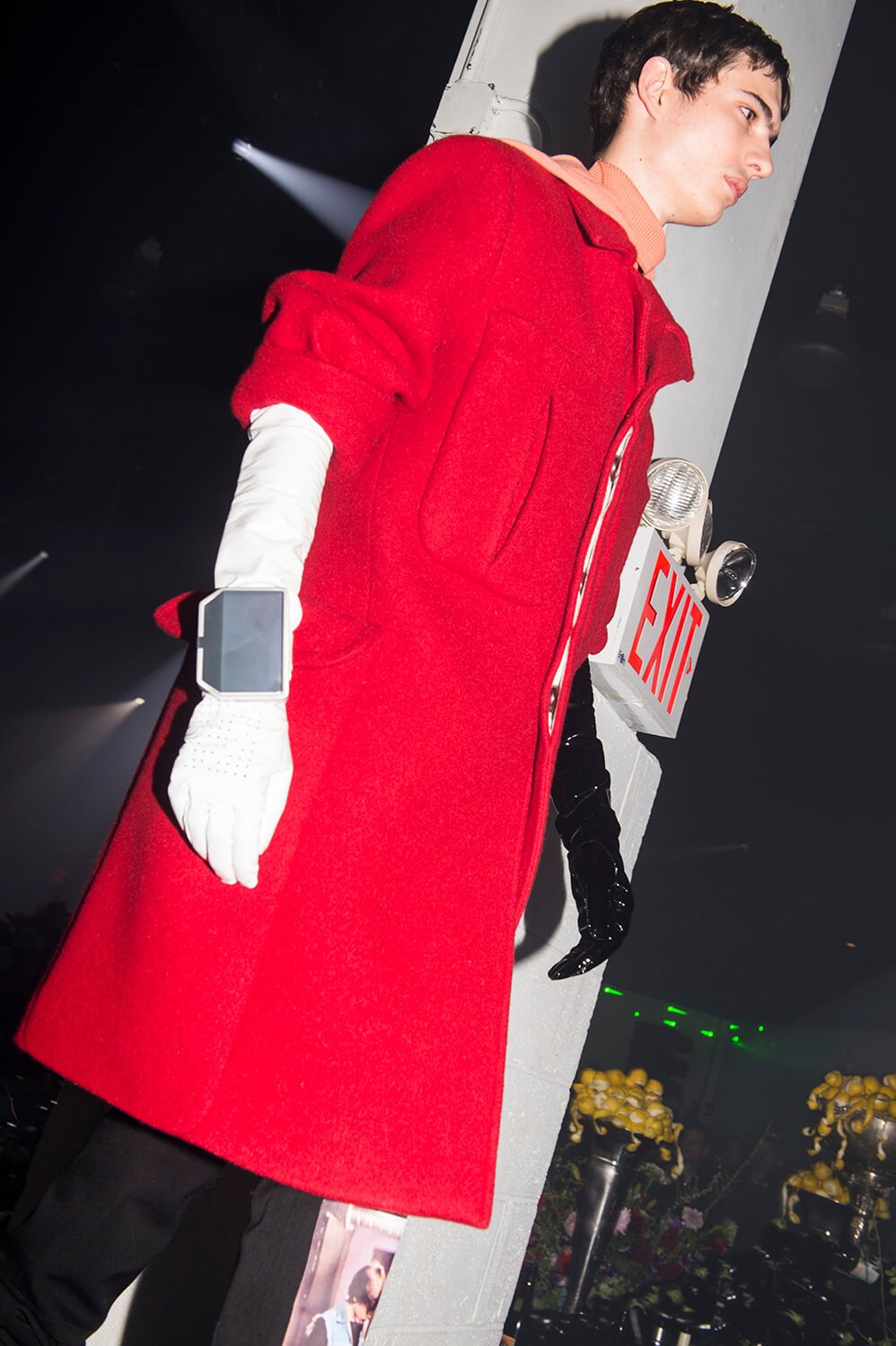 The words “The music was new black polished chrome and came over the summer like liquid night,”. Make of that what you will. It was the end of a party, psychedelic laser beams streamed into the room, strobing, wickedly lighting the way forward for this youth in revolt, for Raf’s dedicated fans. Big shoulders held up oversized tailored coats and what appeared to be pill boxes were attached to latex gloves. Practical. Moments of sinister string ensembles rang out through all that hypnotic techno. Disconcertingly hallucinogenic.