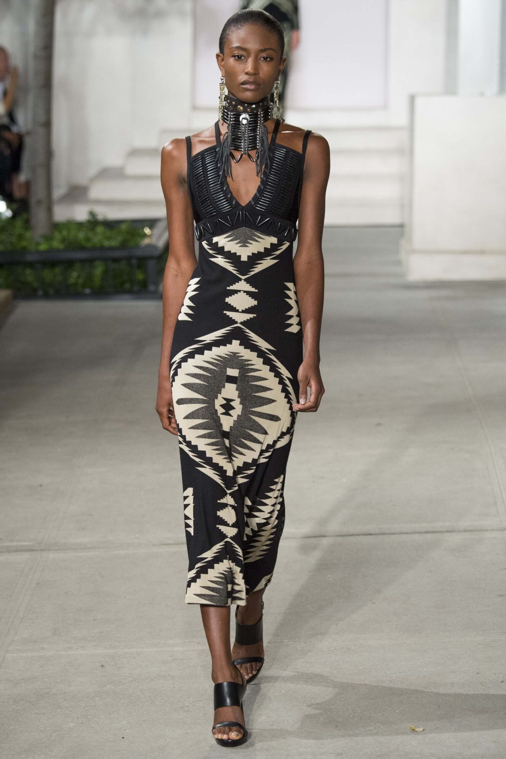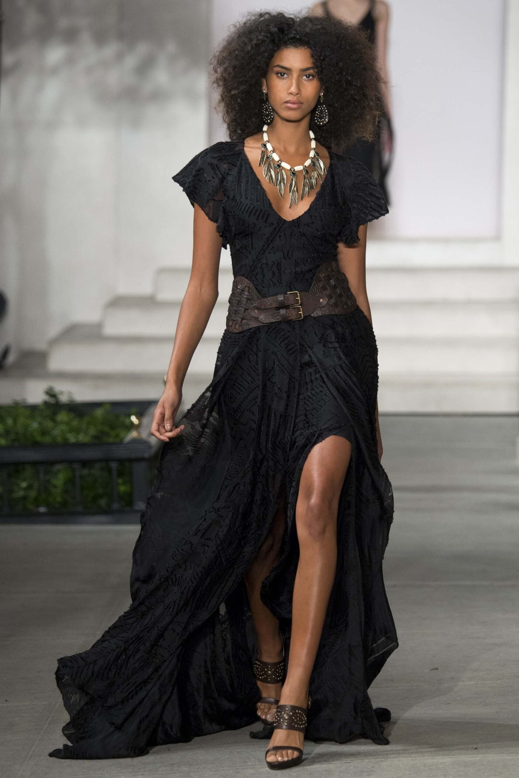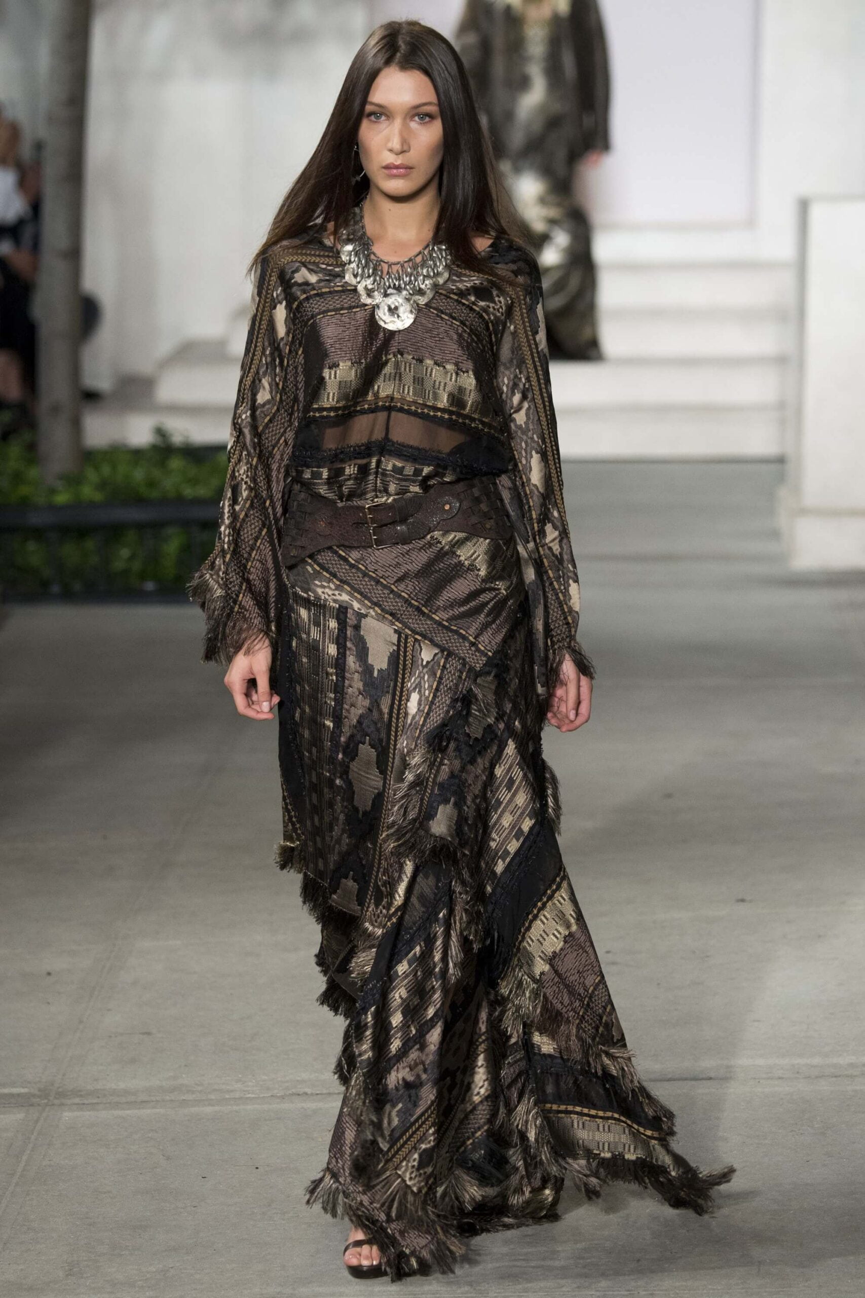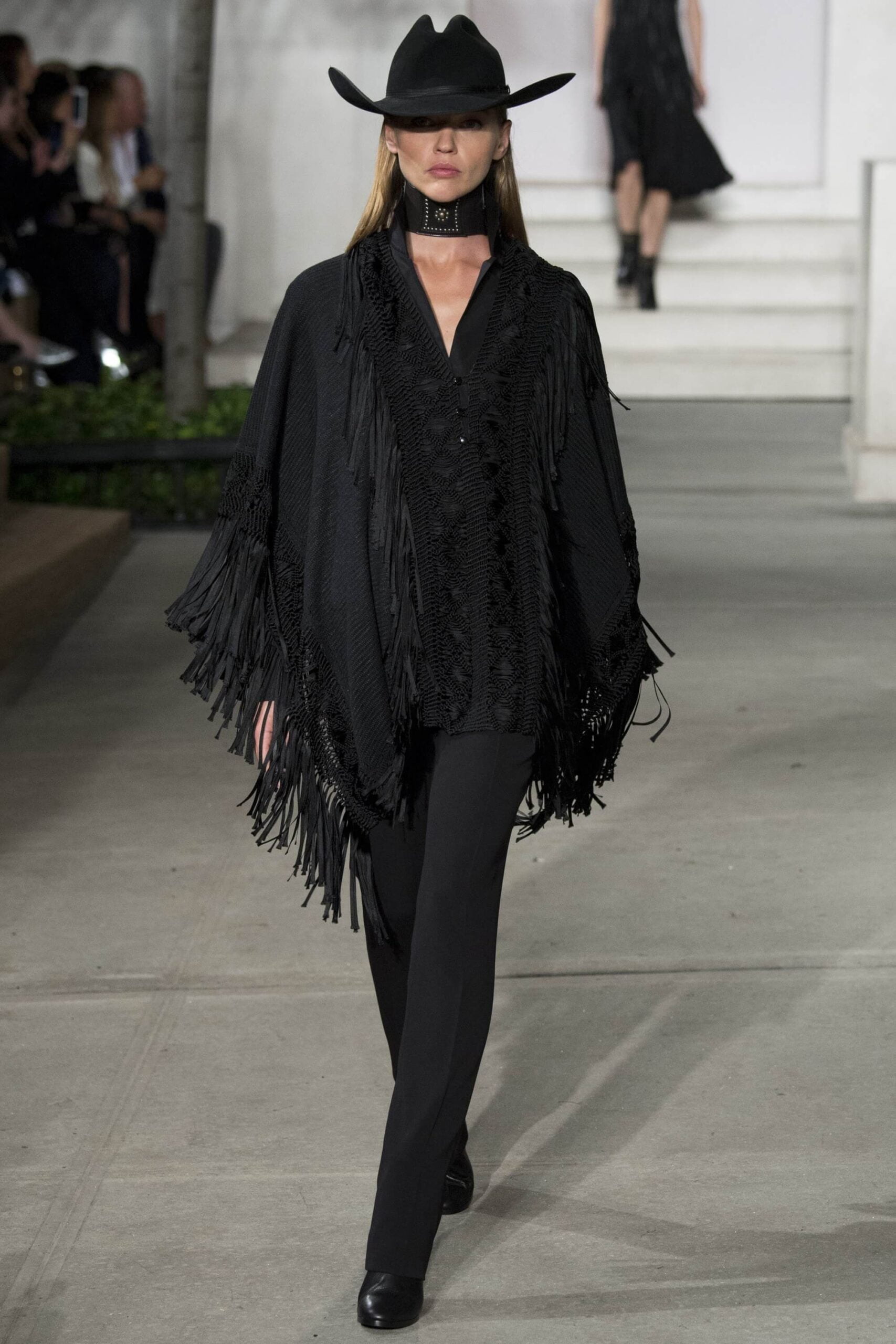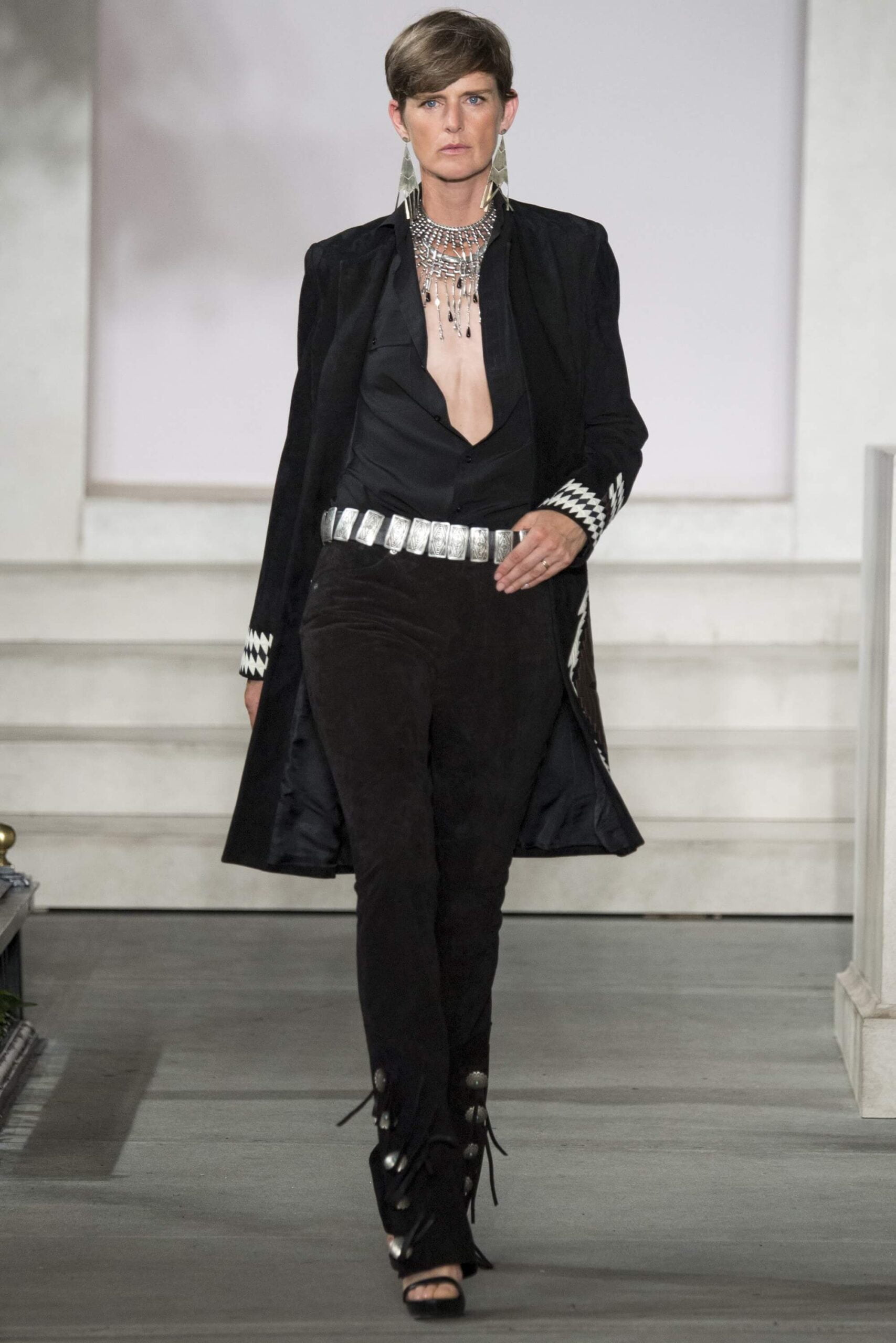 There was more than a hint of cowgirl at last night’s Ralph Lauren SS17 show. I want to call this uptown meets down on the ranch for some reason. The uptown element coming from Ralph choosing to show his collection uptown this season. At his Madison Avenue flagship to be specific where he built a special glass show space on the side of the building (a suitable location as it was see now, buy now). The down on the ranch coming from the hint of cowgirl. I’m likening it to Uma in Even Cowgirls get the Blues, when she hitchhikes her way to the Countesses ranch to shoot an add for ‘feminine products’. Though obviously this is far more polished, though there is that idea of Madison Avenue ad exec’s to this in the masculine pinstripe embroidered with flowers. The starting point for this was Ralph’s signature western belts, which gave way to a collection of reworked greatest hits if you will. Western shirts, Navajo prints, suede fringing and polished leathers all made an appearance, rounded off with a finale of striking sequin columns in rainbow bright hues.