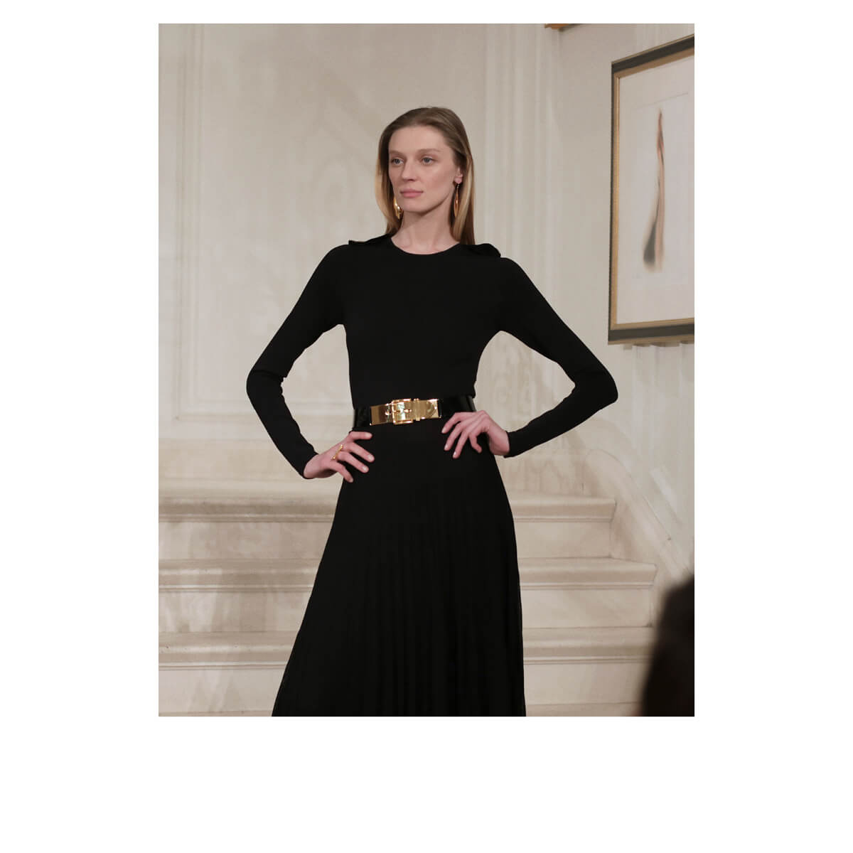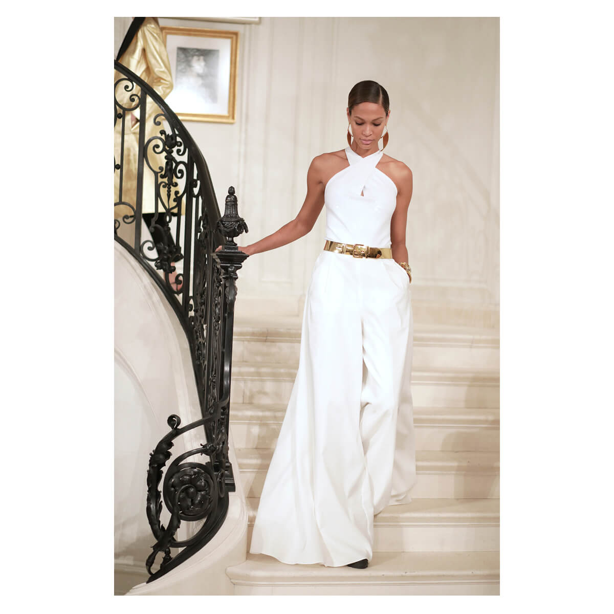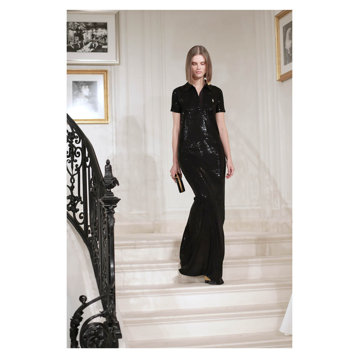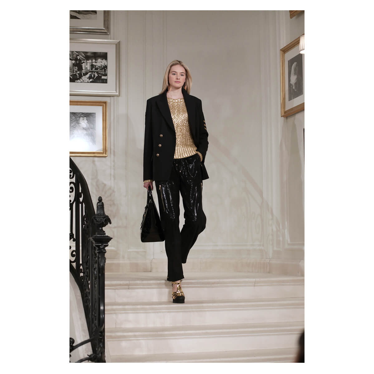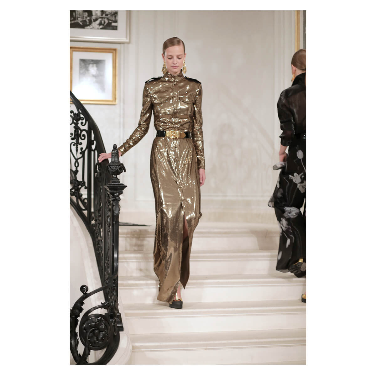 The gorgeous Taylor Hill opened the show in a pair of exaggerated wide leg trousers, structured military-esque jackets with shoulder epaulettes in white. Looks followed included cream silk shirts influenced by his iconic trench coat, metallic gold trousers and jackets will satisfy his younger customers who will funk it up in their street style version, jumpsuits and so many striking gold evening looks. Carolyn Murphy wearing a white fitted crewneck dress with a flowy pleated skirt with that hint of RL military touch finished with a gold belt and wedge heels are feminine to the max! Bella Hadid wearing a gold pleated dress looked modern, glamorous ‬and just enough sexiness! And the coffee was just as good too.