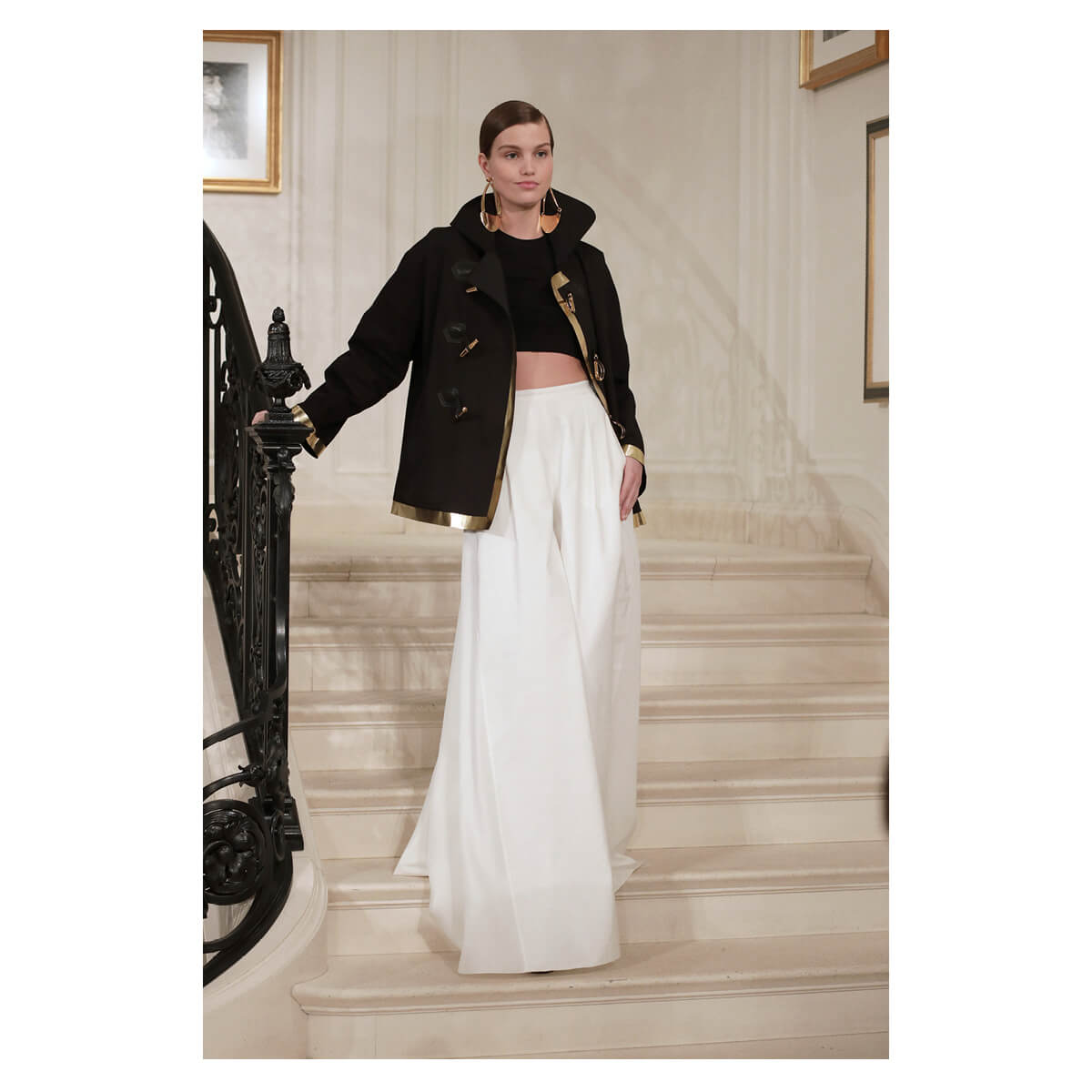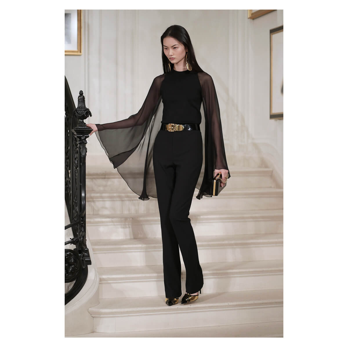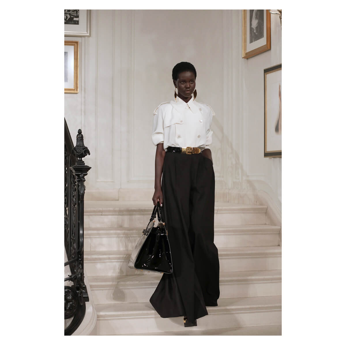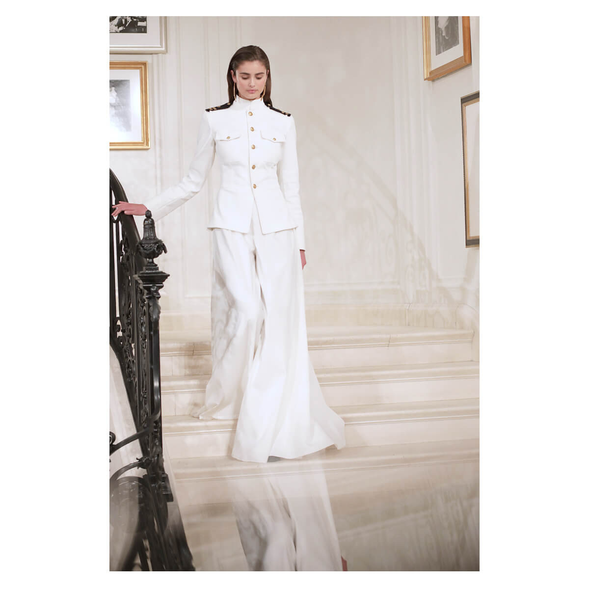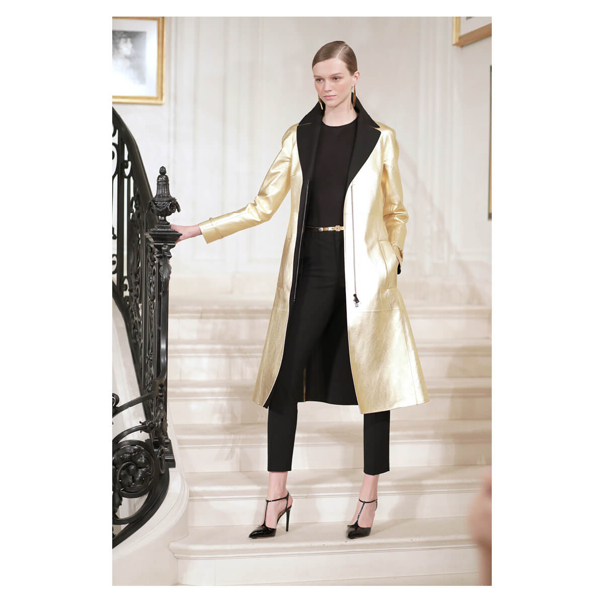 The gorgeous Taylor Hill opened the show in a pair of exaggerated wide leg trousers, structured military-esque jackets with shoulder epaulettes in white. Looks followed included cream silk shirts influenced by his iconic trench coat, metallic gold trousers and jackets will satisfy his younger customers who will funk it up in their street style version, jumpsuits and so many striking gold evening looks. Carolyn Murphy wearing a white fitted crewneck dress with a flowy pleated skirt with that hint of RL military touch finished with a gold belt and wedge heels are feminine to the max! Bella Hadid wearing a gold pleated dress looked modern, glamorous ‬and just enough sexiness! And the coffee was just as good too.