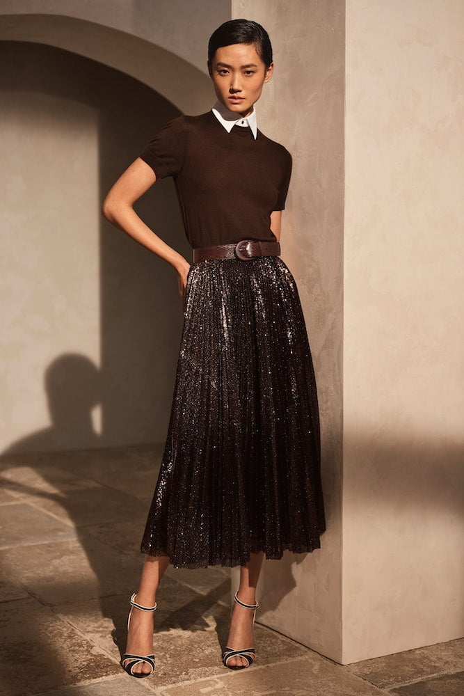 The look was informal, comfortable but polished. Open neck shirts and high waisted baggy chinos for both men and women, gave way to velvet blazers, distressed to look like denim, easy knitted column dresses and nautical colourways. A pair of louche striped pyjamas, worn with heels, said so much about where we’ve been for the last year, and where we are going. Janelle Monae performed a silky-voiced set in Lauren’s Beverly Hills boutique. She sang Sinatra’s ‘All or Nothing At All’. For Ralph Lauren, that means nostalgia made right for now.